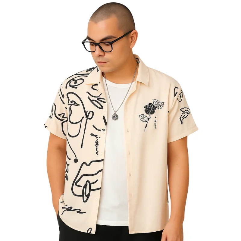 Elevate your style with the Abstract Floral Art Shirt in a soft cream palette. This wearable masterpiece features abstract ink-style graphics and delicate floral details, blending edginess with elegance effortlessly. Perfect for any occasion, this shirt allows you to express your individuality with sophistication and flair. Unleash your inner artist today!