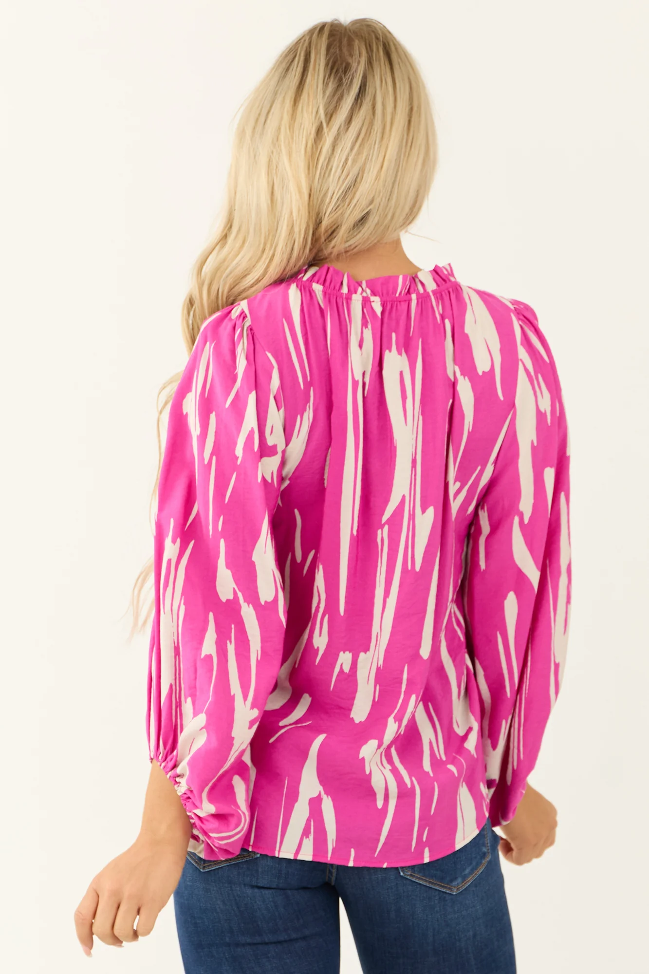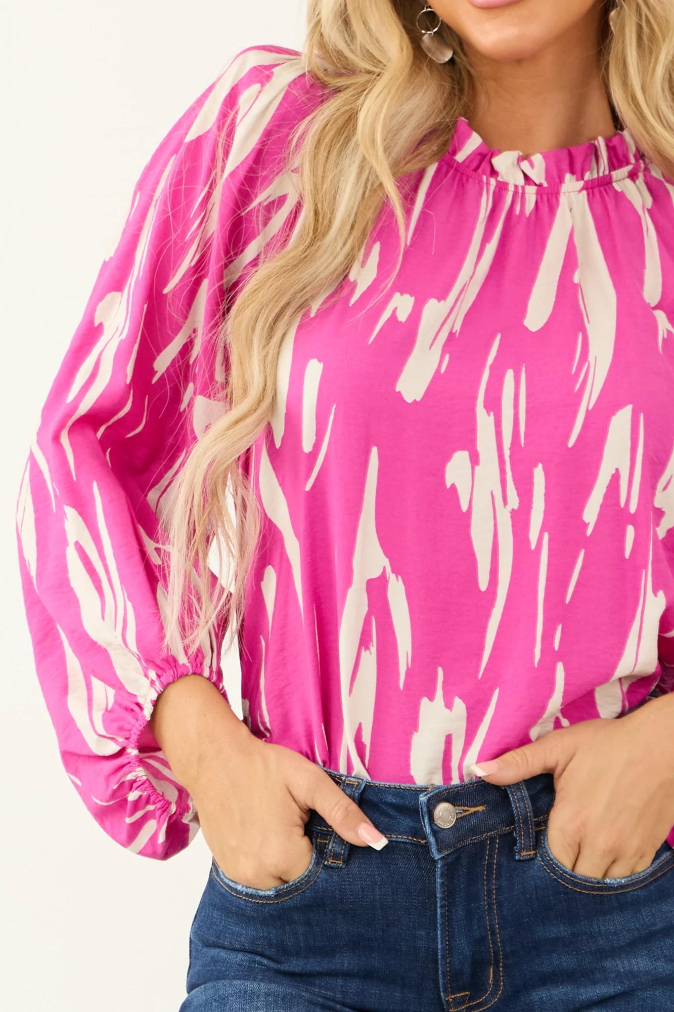 Elevate your wardrobe with this stunning Abstract Fuchsia Print Puff Sleeve Top . Featuring non-stretchy woven fabric in shades of Fuchsia and Vanilla, this top boasts an elastic neckline and cuffs for a comfortable yet stylish fit. The frill neckline adds a touch of femininity, and the top is unlined for a lightweight feel. Made in the USA with 83% Rayon and 17% Nylon. Note: Dry clean only. Please note that due to the printing and sewing process, each piece may vary slightly in print alignment. Model is wearing a size Small. Add a pop of color and style to your outfits with this chic and versatile top!