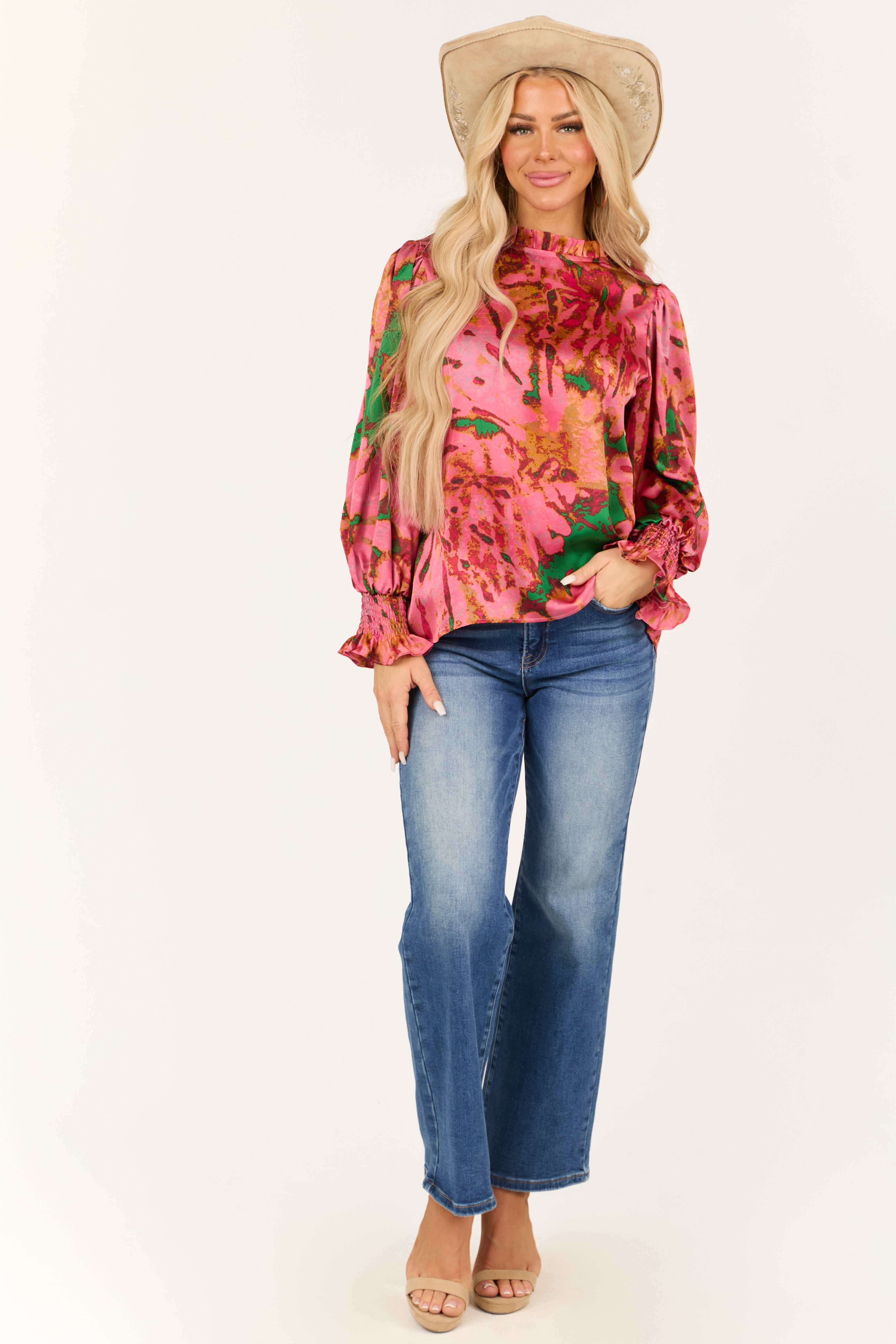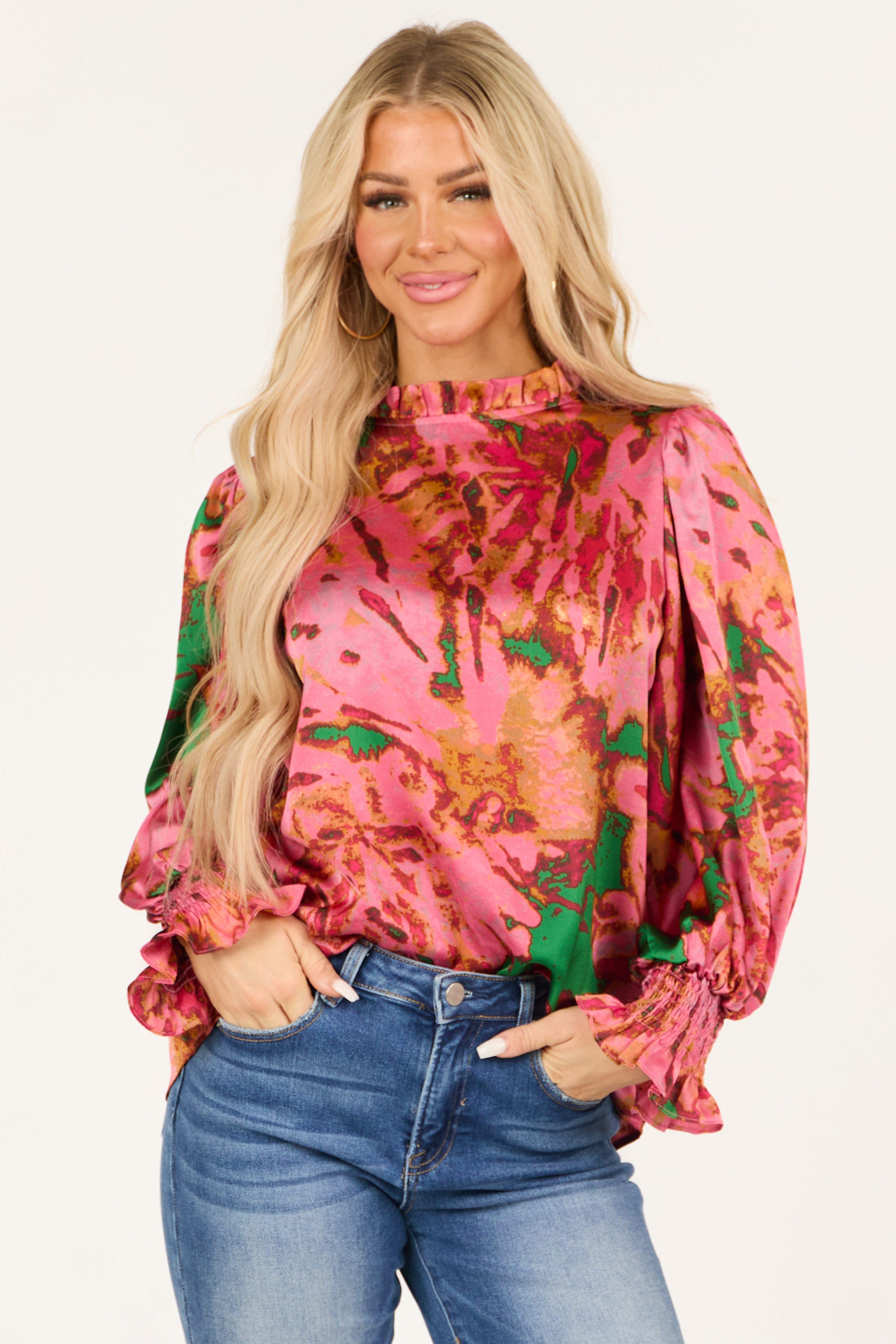 Stay chic and stylish with this watermelon-themed abstract print blouse. Made from non-stretchy woven fabric, it features a high frill neckline, high-low round hemline, and smocked elastic ruffle cuffs in shades of Jade, Mango, Rust, and Hot Pink. The keyhole back with button closure adds a touch of elegance. Perfect for any occasion, this blouse is a must-have addition to your wardrobe. Machine washable for easy care. Model is wearing a size Small.