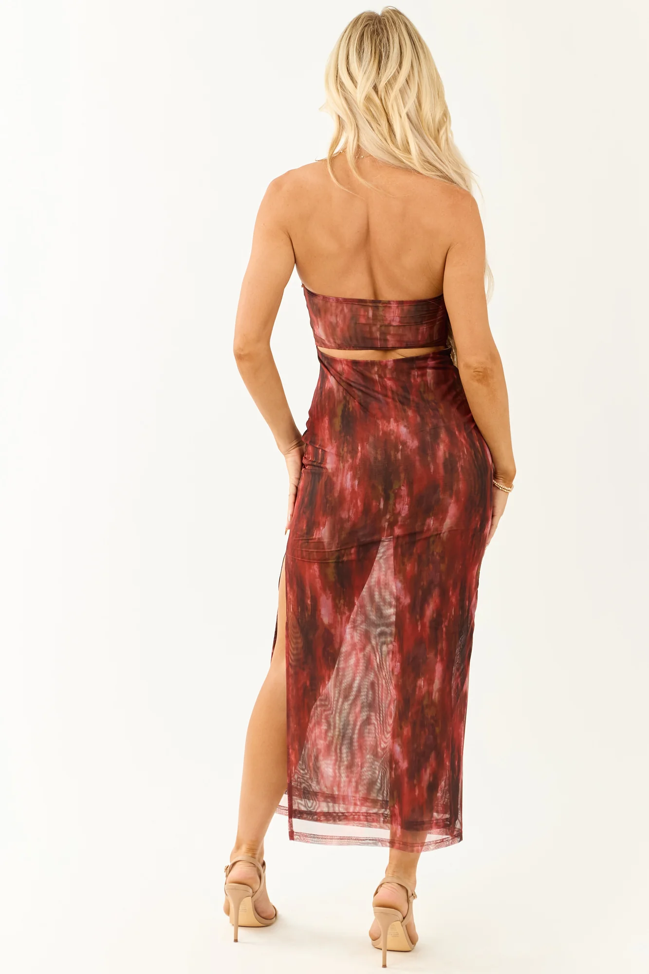 Embrace elegance with this strapless cherry-toned midi dress. The figure-hugging fit, soft breathable mesh, and abstract warm print make this a must-have. Detailed with an elastic back waistband, a back cutout, and a side slit, this dress offers both style and comfort. With an adhesive bust strip for secure wear and a semi-sheer finish, its perfect for any occasion. Crafted from 95% Polyester and 5% Spandex with a 100% Polyester lining. Available in Cherry, Cocoa, Blush, and Army Green. Model is 59″ tall, wears a size Small, with a bust of 34″ and a waist of 26″.