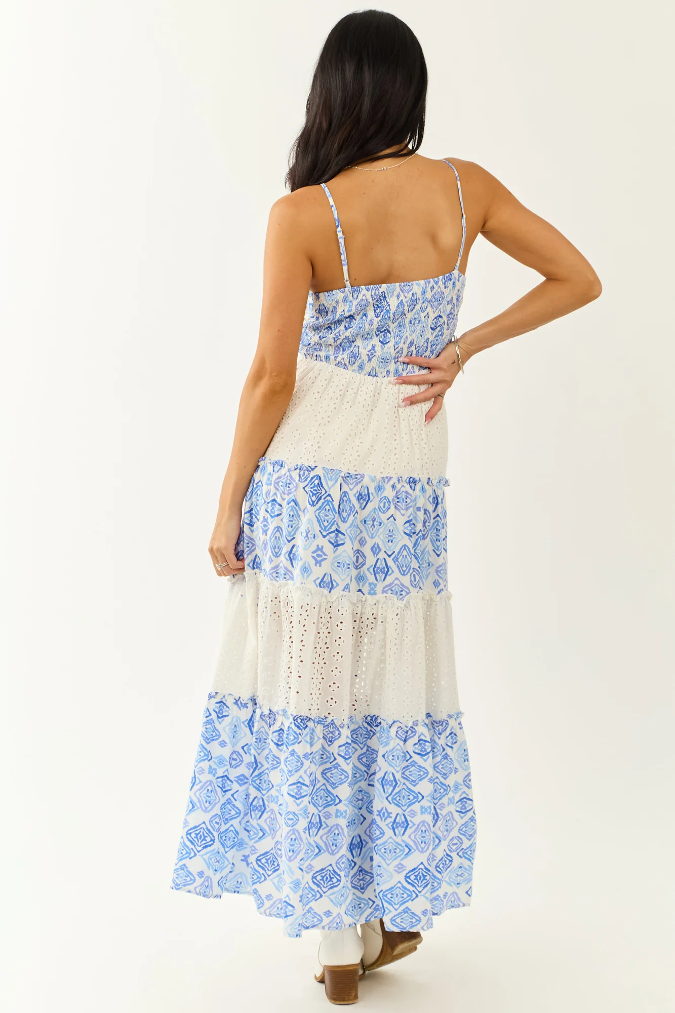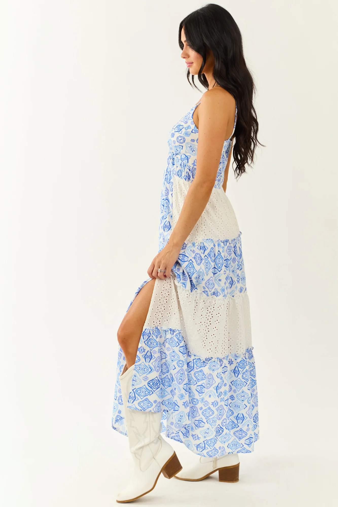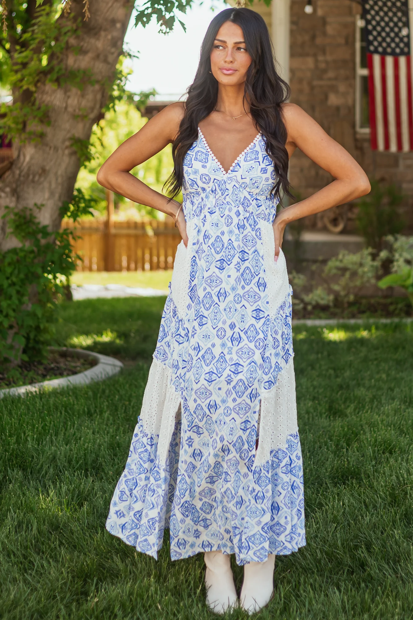 Indulge in the artful elegance of this abstract vacation print, patchwork maxi dress blending Cobalt, Sapphire, and Powder Blue tones with white patchwork eyelet lace. Crafted from a non-stretchy airy cotton blend, featuring adjustable spaghetti straps, a deep v neckline, dot lace neckline trim, and 2 front hem slits for a chic summery look. Imported, lined with 100% Rayon, contrasted at 100% Cotton. Size Small: Bust 34, Waist 26, Length 52. Ideal for creating a stunning impression at any summer event.