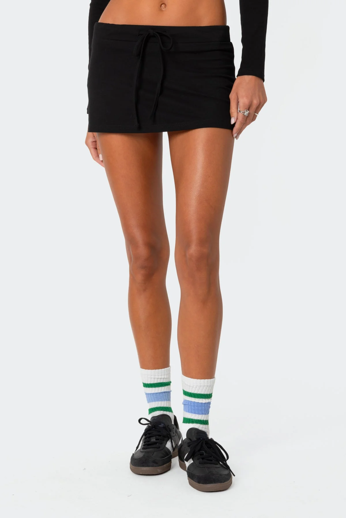 Stay comfortable and stylish in our black cotton spandex micro skort featuring adjustable tie waist, side slit detailing, and easy-care instructions. This versatile skort is a must-have addition to your wardrobe for any occasion. Machine washable for convenience.