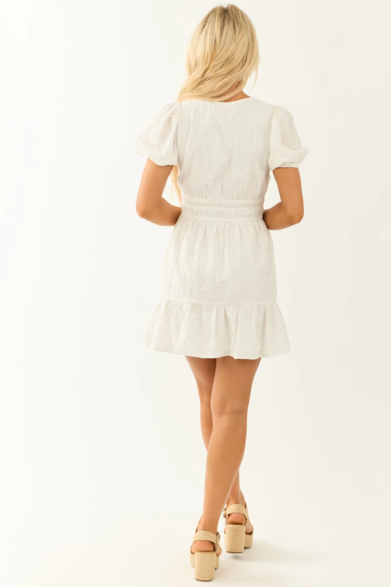 Embrace timeless style and sweet simplicity with our adorable flowery embroidered ivory mini dress! This charming dress features short puff sleeves, a banded ruffle hem, and a ruched bust for added detail. Made of non-stretchy breezy cotton with an elastic waistband for extra room, this dress is lined with stretchy material for comfort. Perfect for a casual day out or a special occasion. Available in sizes S, M, and L.
