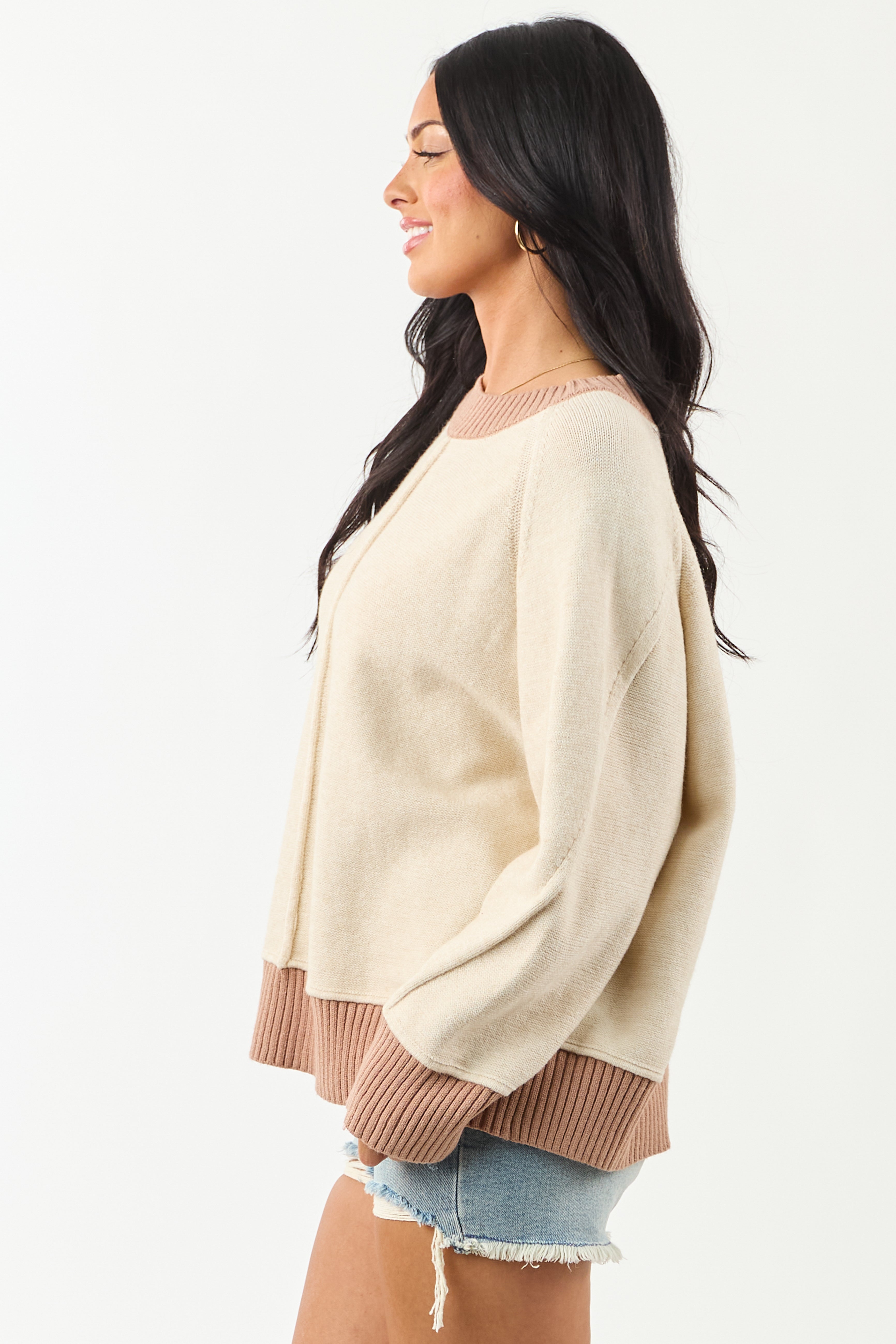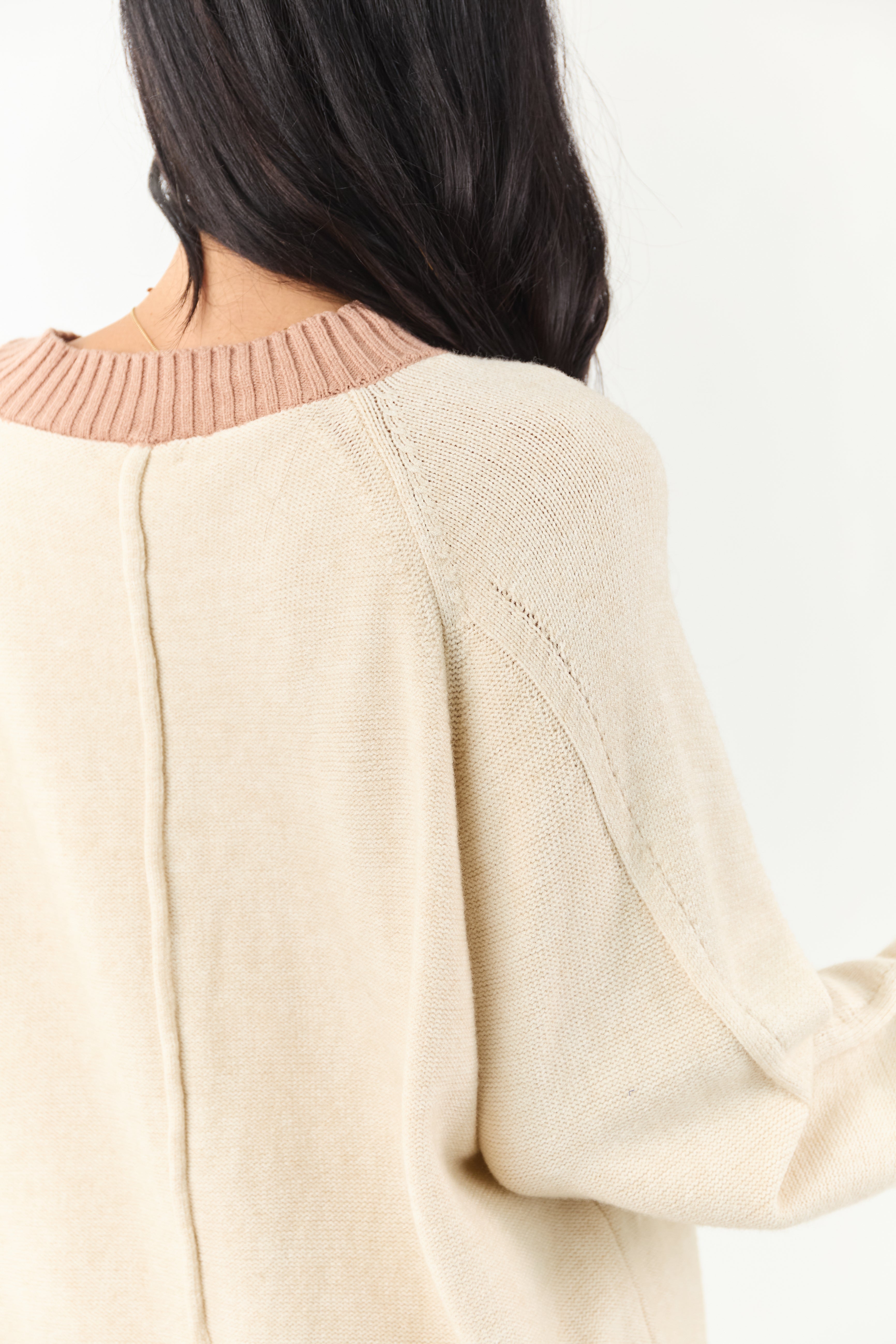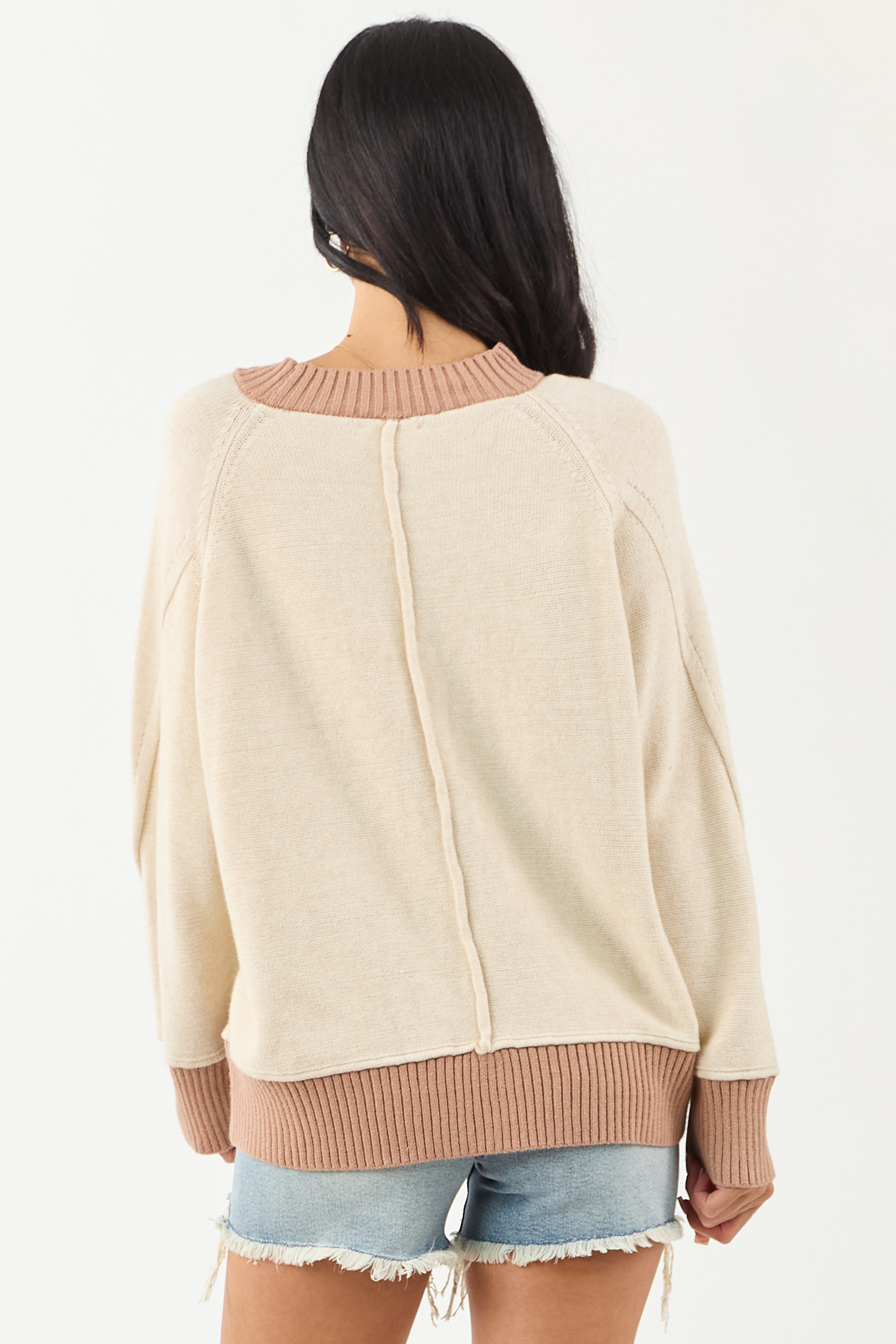 Experience ultimate comfort and style with our Almond and Rose Taupe Relaxed Knit Sweater. Crafted from a soft blend of 50% Viscose, 29% Polyester, and 21% Nylon, this oversized sweater boasts a relaxed silhouette perfect for layering. The banded ribbed contrast trim adds a modern touch. Available in sizes S, M, and L, this sweater features a bust measurement of 52-54, length of 25-26, and sleeve length of 25. Stay cozy all day while looking effortlessly chic. Imported. Model is wearing size Small—Height: 59, Bust: 34, Waist: 26.