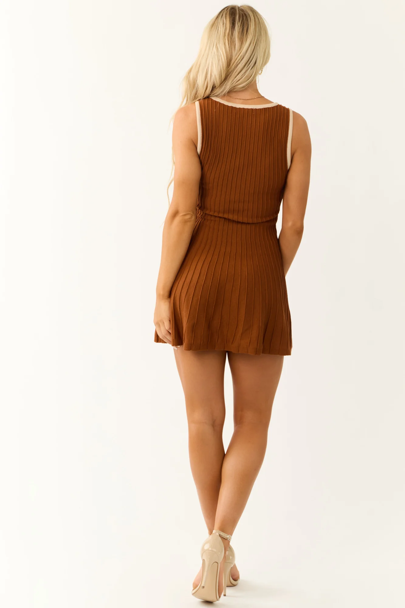 Indulge in fashionable elegance with our Almond Contrast Square Neck Skater Mini Dress. This skater style dress features a stretchy knit construction with a contrasting trim in almond color. Designed with a square neckline and sleeveless silhouette, it offers comfort and style effortlessly. Crafted from 80% Polyester and 20% Nylon, this dress is perfect for any daytime occasion. Conveniently sized in S, M, and L, this mini dress fits true to size and invites you to stand out. Note: hand wash in cold water, iron low if needed, and do not bleach. Elevate your style with this trendy mini dress!