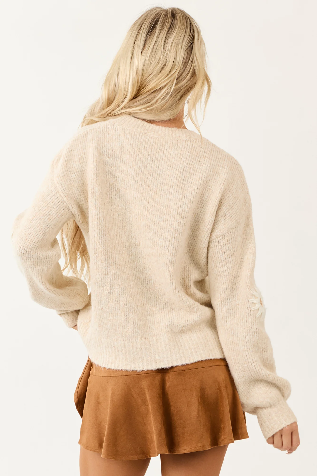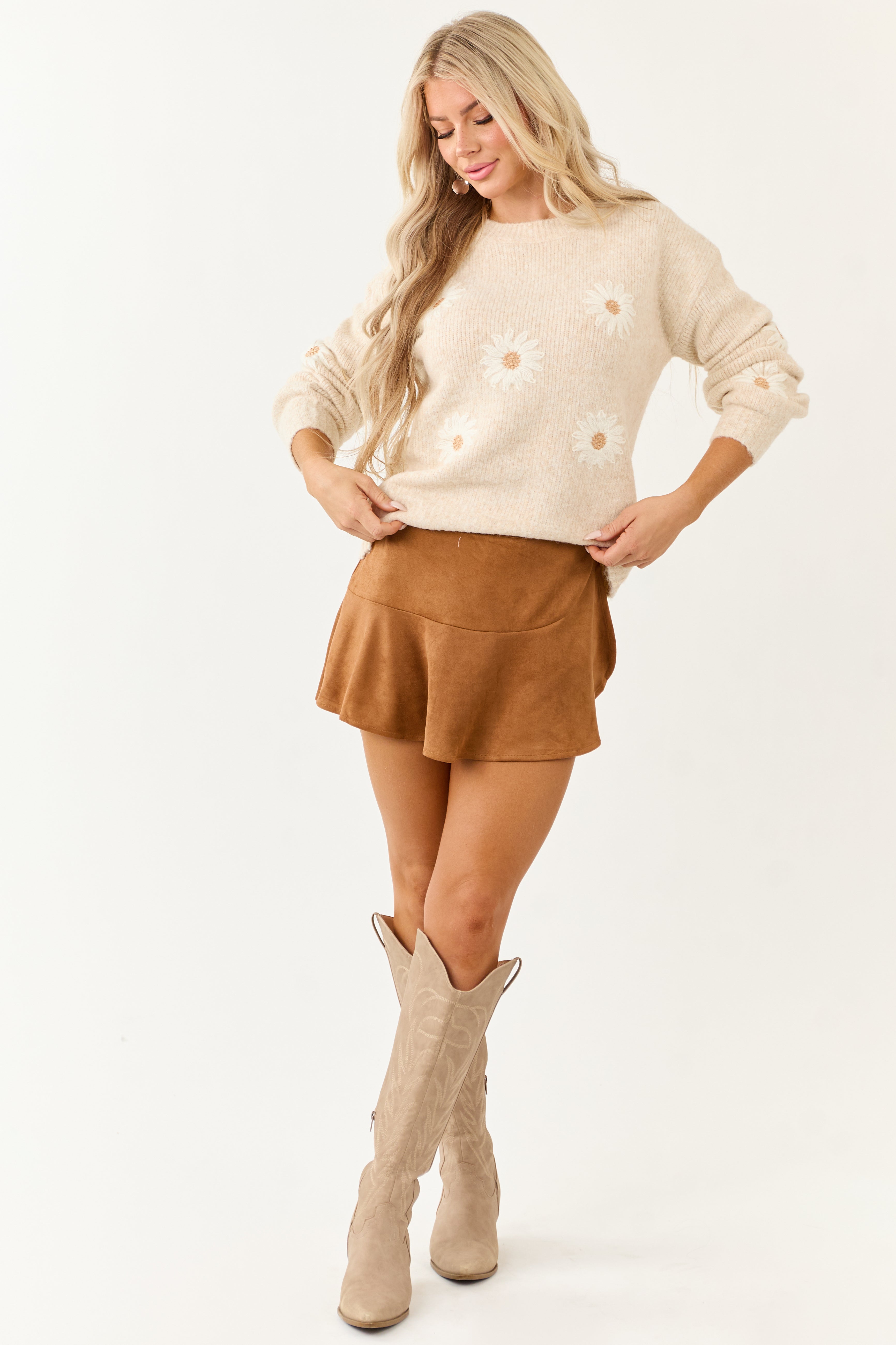 Stay warm and stylish in this relaxed sweater featuring sweet daisy details. Made from a soft wool-blend for comfort with a touch of feminine charm. This sweater pairs beautifully with Caramel Faux Suede Front Skirt Overlay Mini Skort. The stretchy soft knit fabric showcases floral embroidery in Ivory and Buttercream shades. Designed with drop shoulders and banded trim for a trendy look. Crafted from 60% Polyester, 20% Acrylic, 13% Nylon, 6% Wool, and 1% Spandex. Imported.