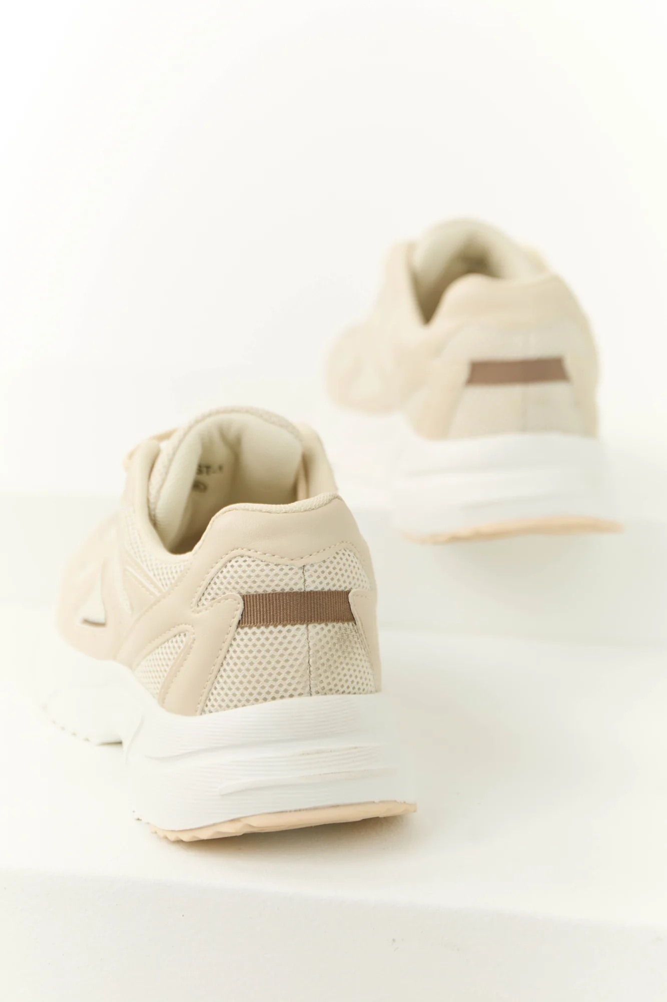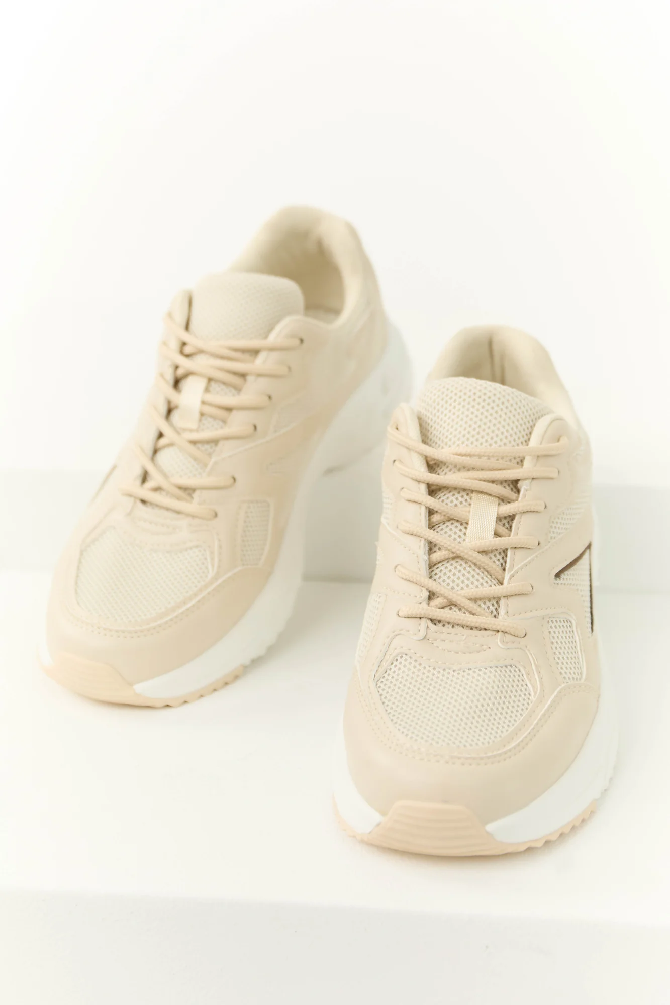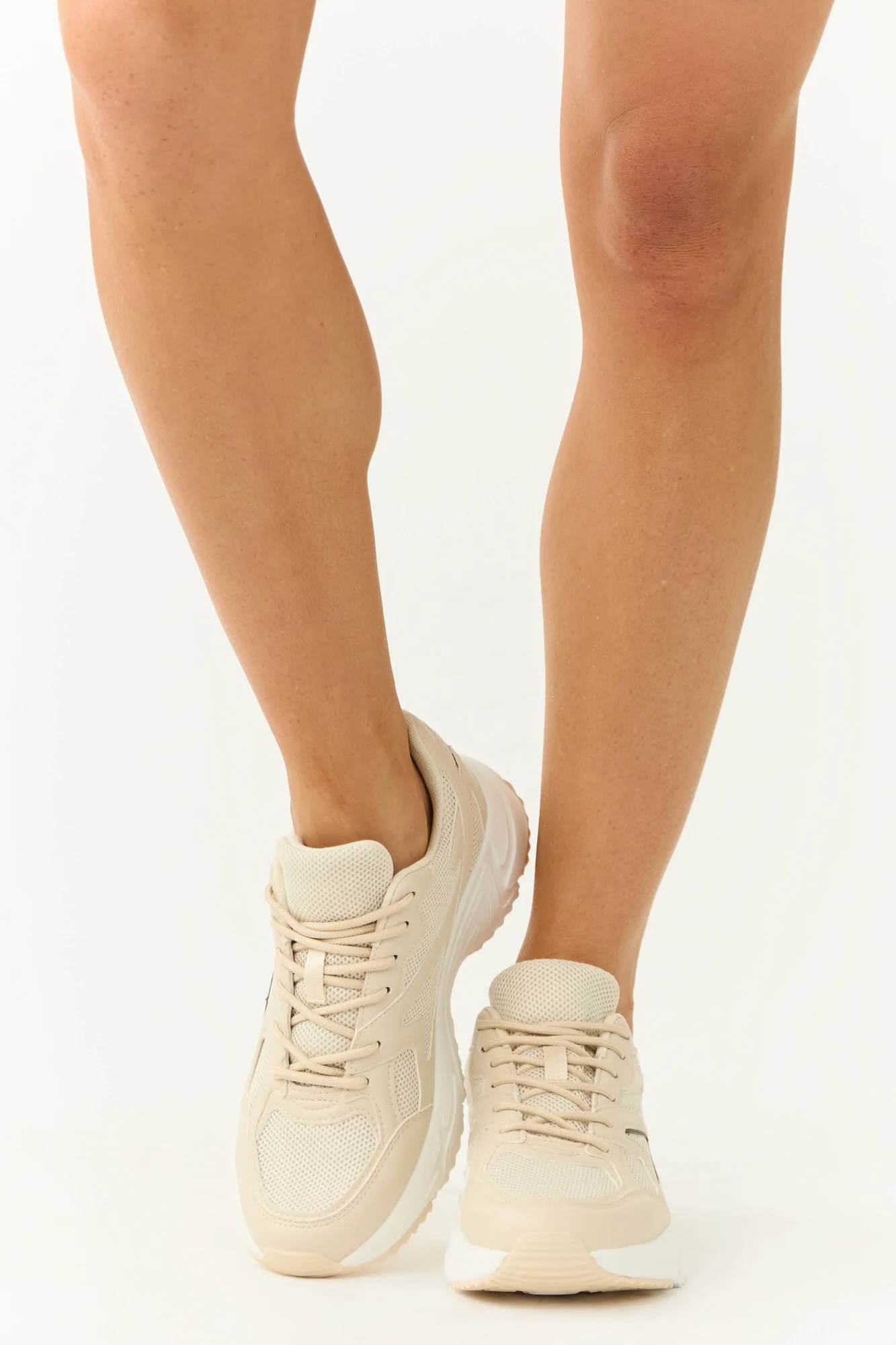 Step out in style with these Almond Mesh Sneakers featuring Coffee accents. Crafted from faux leather, these sneakers boast a textured pattern rubber sole for durability. The Buttercream mesh details add a trendy touch, while the lightly cushioned insole ensures comfort all day long. Designed with rounded toes and almond laces, these sneakers have a circumference of 10 inches. Imported.