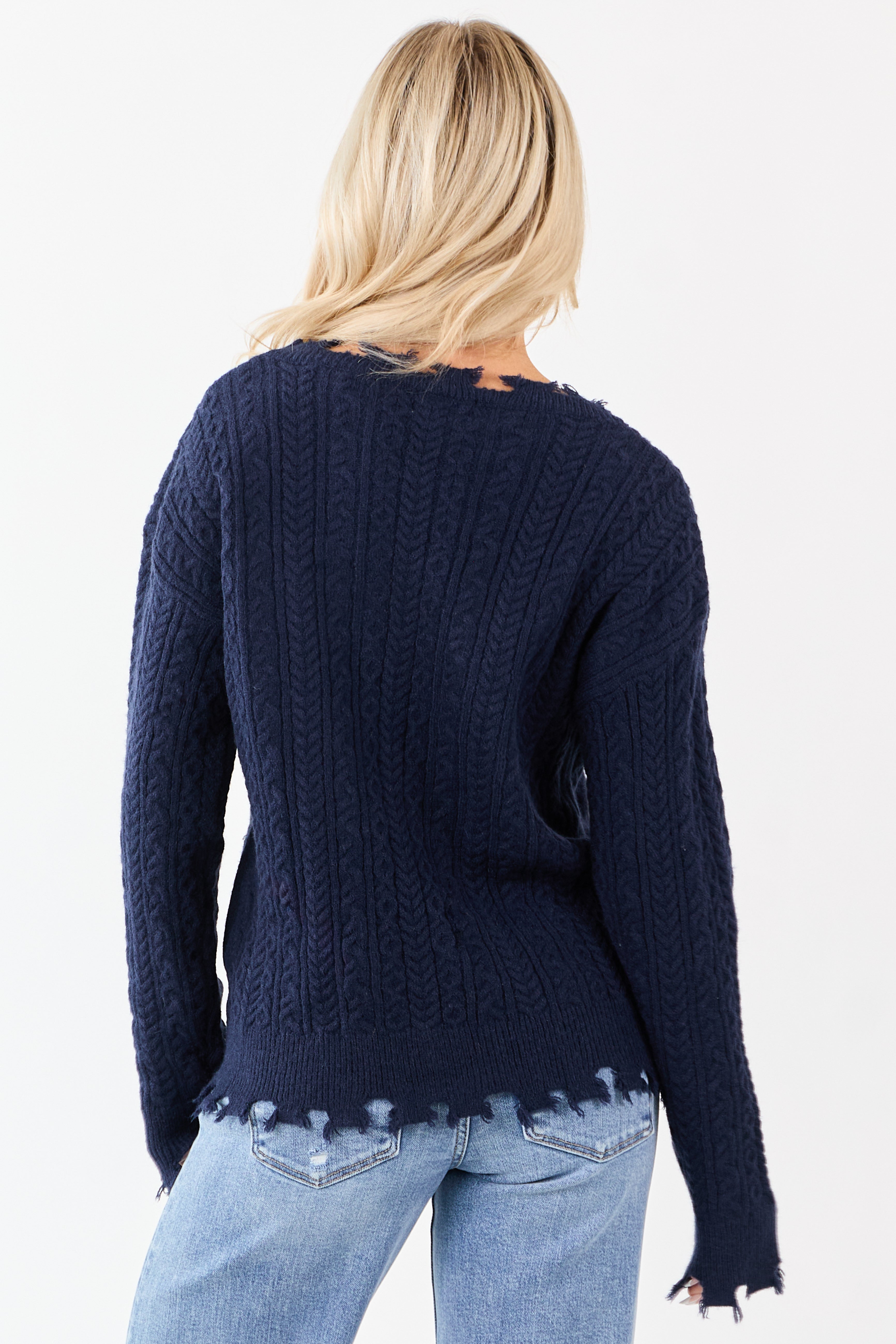 Stay cozy in style with this American flag graphic sweater featuring distressed shredded trim details. The stretchy cable knit construction offers comfort and a rebel spirit touch. This casual sweater is perfect for adding a patriotic flair to your outfit. Available in sizes S, M, and L. Bust: 46″-50″, Length: 25″-26″, Sleeve Length: 24″. Made of 52% Acrylic, 28% Nylon, 20% Polyester. Imported.