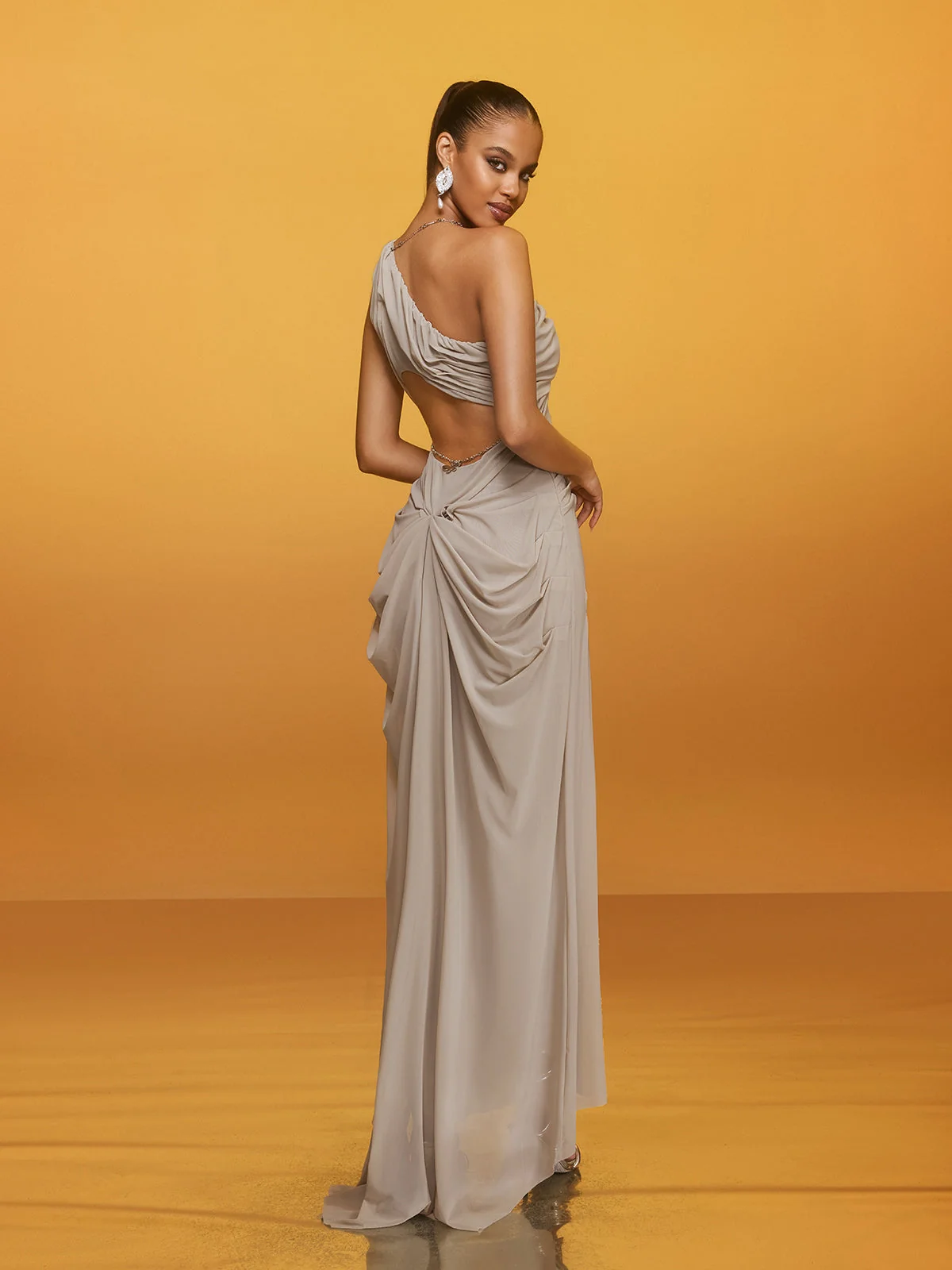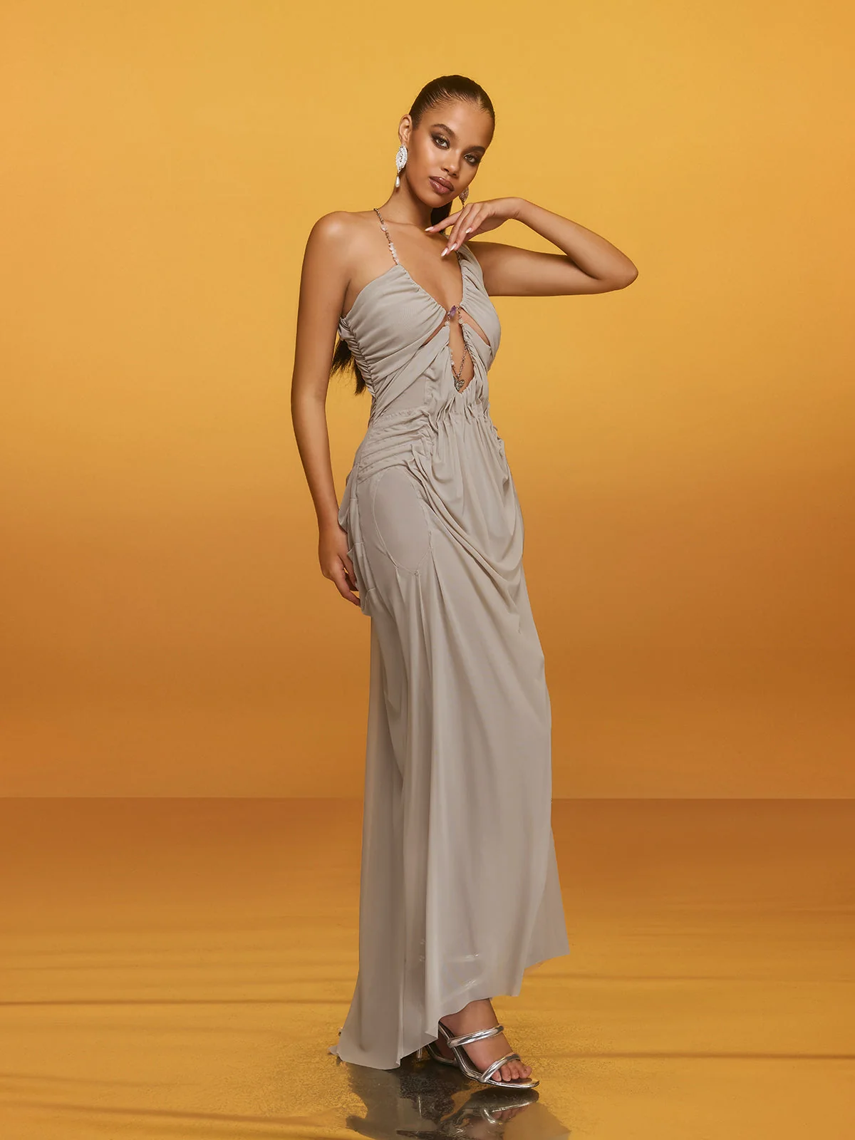 Elevate your look with our Apricot Halterneck Ruched Maxi Dress. Perfect for special occasions, the khaki color exudes elegance while the halterneck design offers a touch of sophistication. With slight stretch and a flattering silhouette, this dress is sure to turn heads. Crafted from 100% Polyester. Dry clean only. Model in size S.