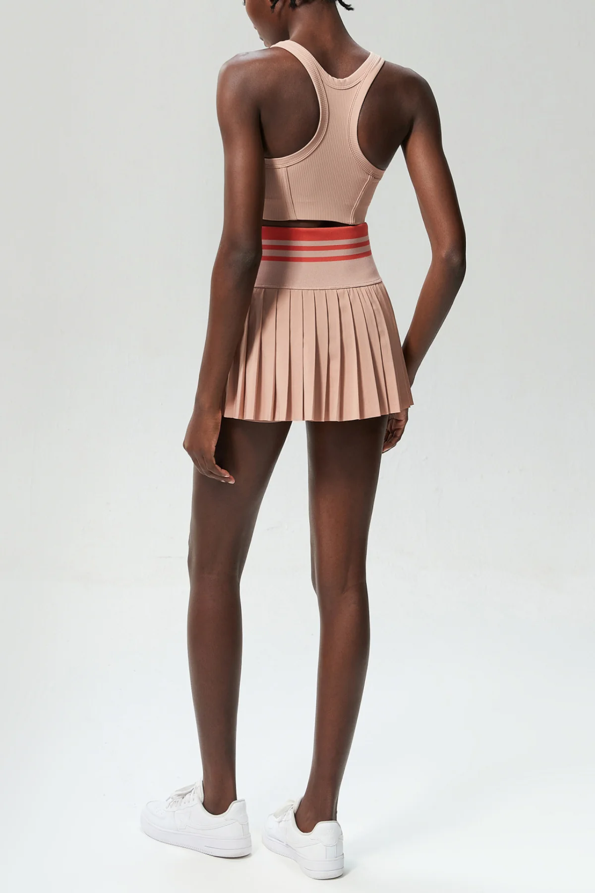 Elevate your wardrobe with the Apricot Sleeveless Ruched Skirt Set featuring a stylish stripe detail. This high-quality set includes a sleeveless top and a ruched skirt that flatters your figure. Perfect for any occasion, the set offers comfort and style in one elegant package. Made from 50% Polyester and 50% Cotton with a slight stretch for added comfort. Clean by gentle machine wash. Please note that the color may vary due to lighting in images.