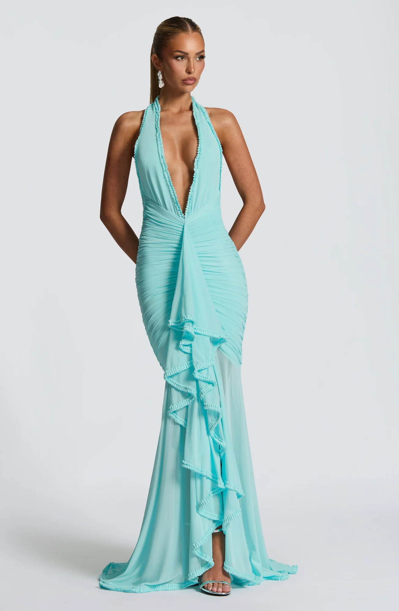 The Aqua Halter Neck Maxi Dress is designed for sophisticated elegance. Crafted from stretch mesh fabric, this dress features a deep plunge neckline, graceful halter straps, and a flattering ruched silhouette. With a semi-sheer skirt, delicate ruffle detailing, and an invisible zipper closure, it offers both allure and comfort. Ideal for formal events, proms, weddings, or special occasions. Enjoy the graceful movement and chic allure of this stunning aqua dress. The bodice is fully lined for added comfort and style.