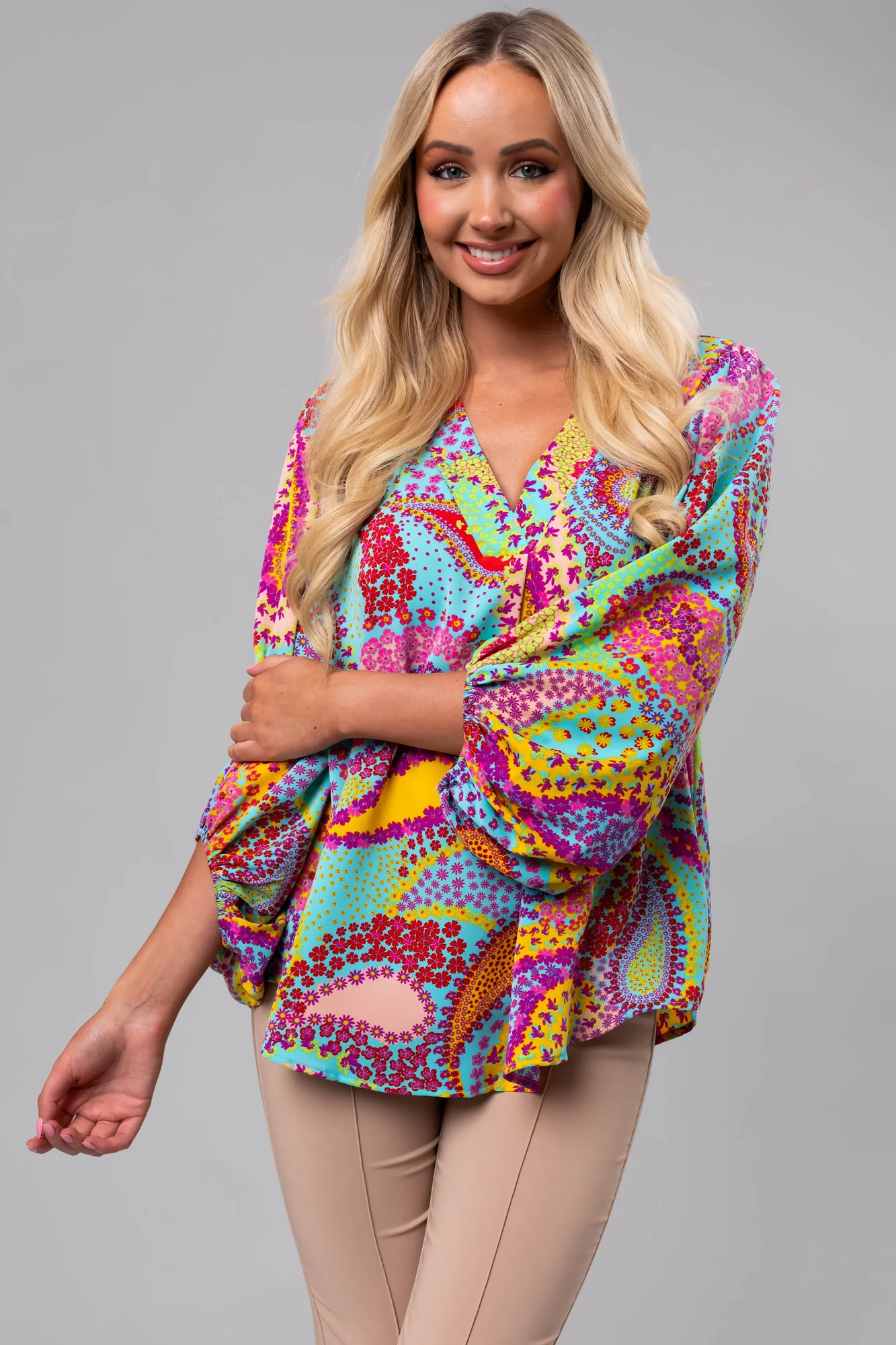 This gorgeous paisley print blouse comes in radiant shades of Aqua, Kiwi, Lemon, Magenta, featuring puff sleeves, a relaxed fit, and a stylish V neckline. Made of 100% Polyester, this non-stretchy woven blouse guarantees comfort and style. The 3/4 puff sleeves with elastic cuffs add a touch of elegance, making it perfect for daytime or work wear. Hand wash cold to keep it looking fresh. Please note that due to the cutting and sewing process, print placement may vary slightly. Model in the image is wearing a size Small. Elevate your wardrobe with this unique piece!