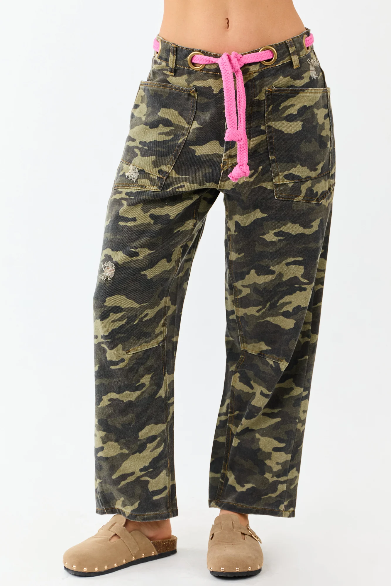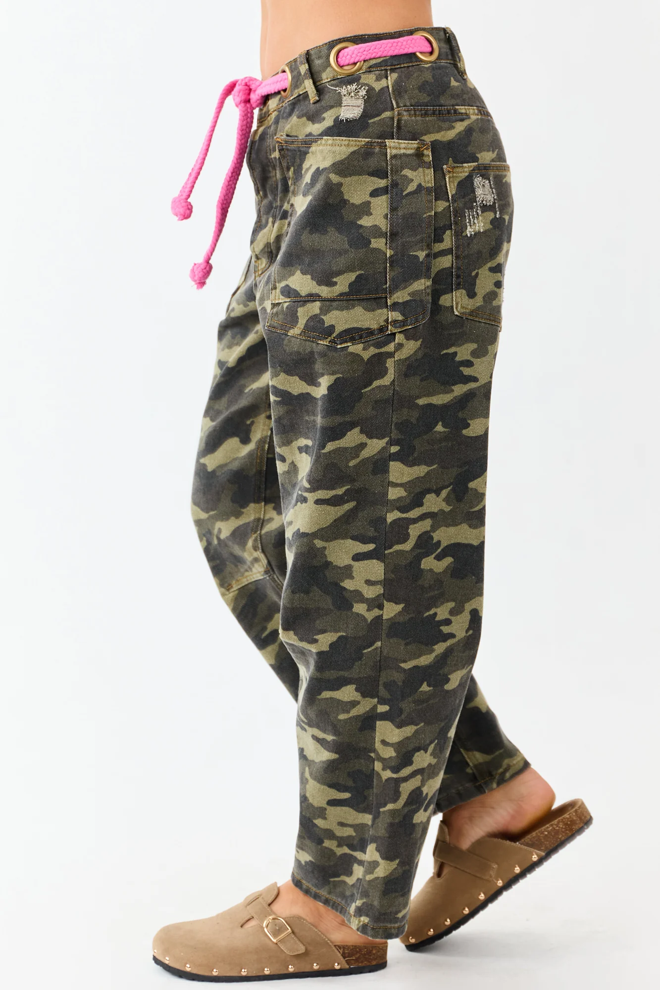 Discover the ultimate relaxed silhouette with our army green camo wide leg pants featuring roomy pockets and a playful pink drawstring. Made from non-stretchy denim with a high rise design and light distressing, these pants offer both style and comfort. The braided drawstring waist adds a unique touch, while the tapered wide leg creates a trendy look. Perfect for casual outings or everyday wear. Available in sizes XS to XL. Imported. Model is wearing size Small.