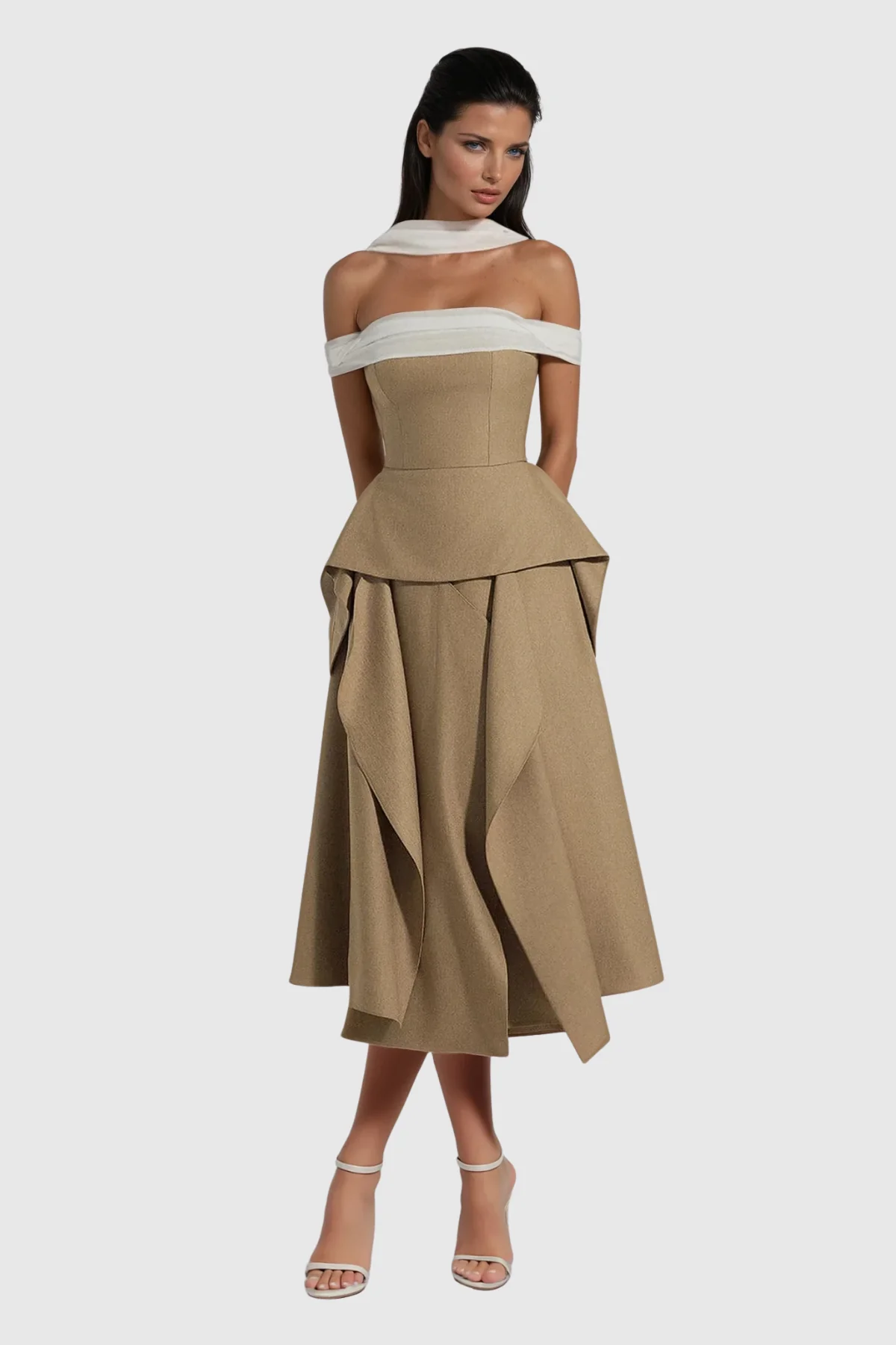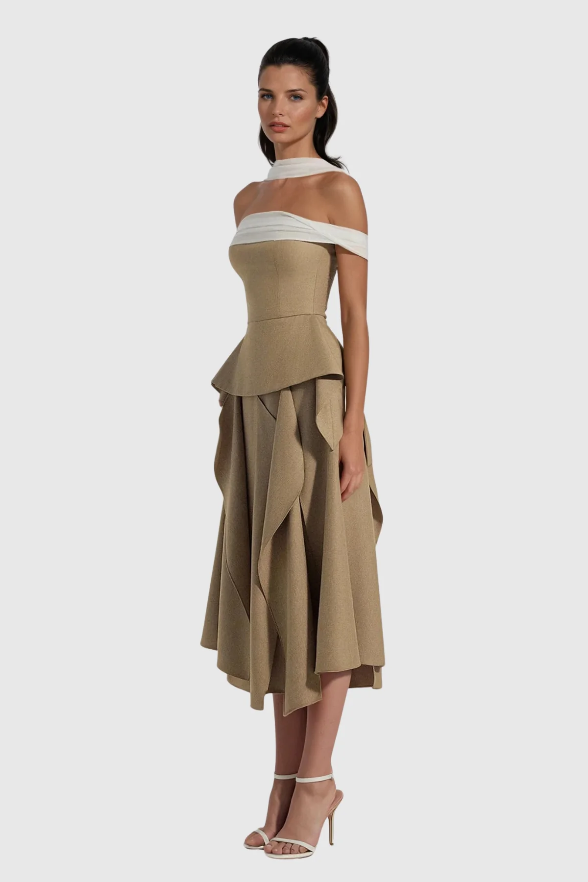 Elevate your style with the Asymmetric Brown Maxi Dress featuring an elegant off-shoulder neckline and a sophisticated silhouette. This dress, crafted for comfort and style, is perfect for formal occasions, adding a touch of modern flair to your look. The non-stretch fabric ensures a flattering fit for various body types. Ideal for upscale events where a refined, distinctive appearance is desired. Color may vary due to lighting. Gentle machine wash recommended.