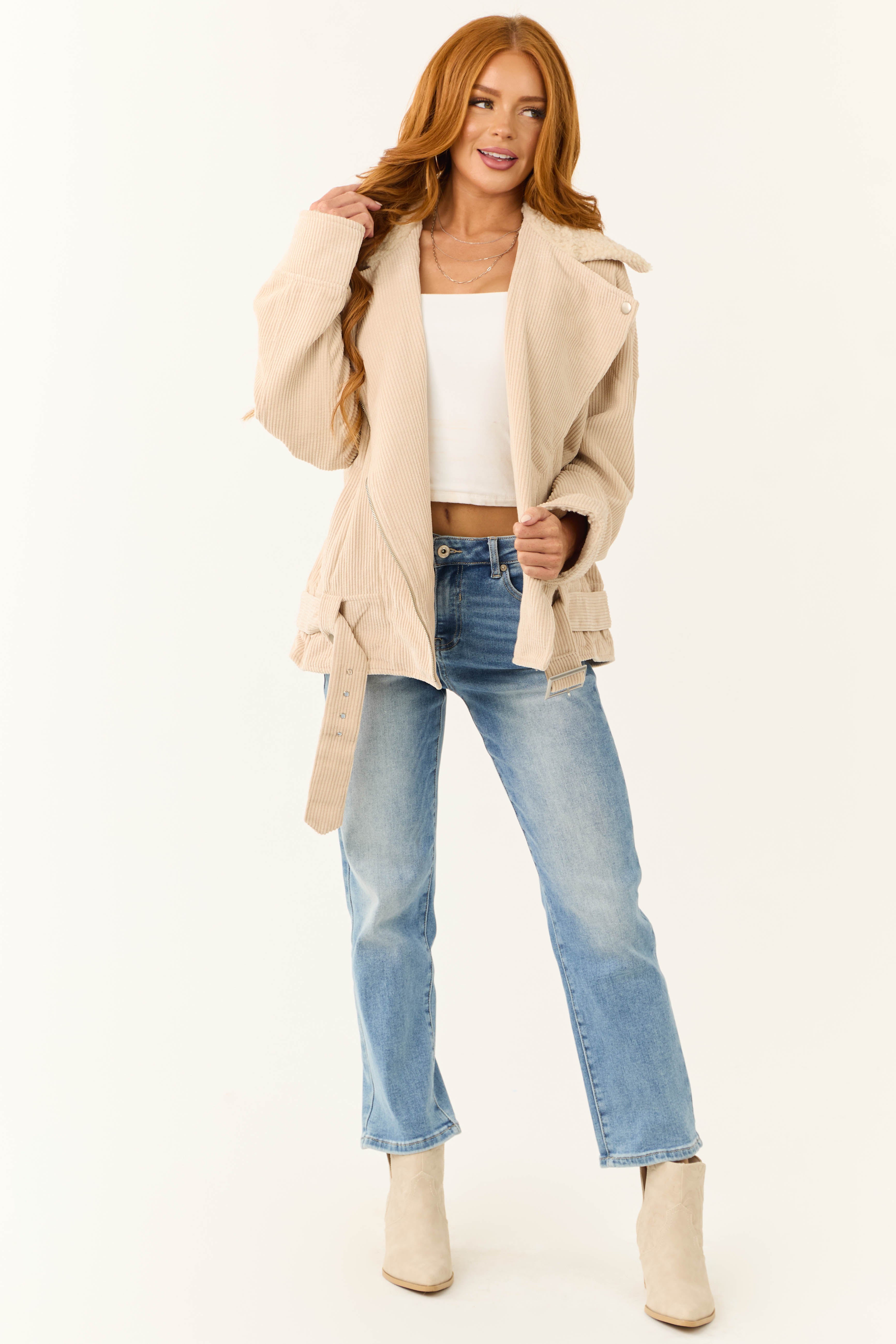 Stay stylish and warm with our Almond Corduroy Asymmetrical Jacket. Made of non-stretchy corduroy, this jacket features an asymmetrical zipper front, fleece collar, and attached belt for a flattering fit. Stay cozy with pockets and a lined interior. Crafted from 100% Polyester self and contrast with a 100% Rayon lining. Hand wash cold, separately to prevent color bleeding. Hang to dry. Available sizes: S, M, L.