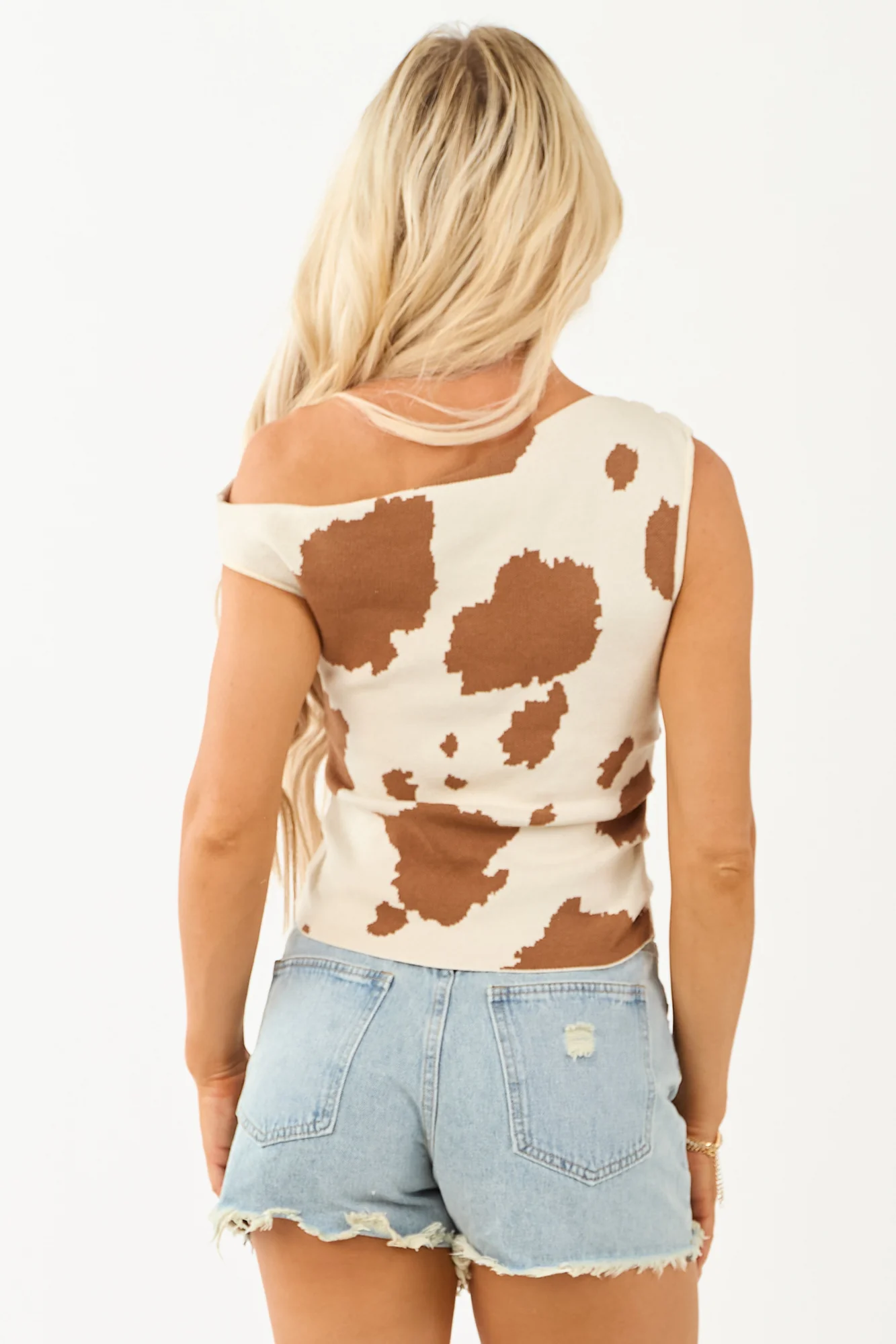 Express your inner cowgirl with this statement top featuring a stylish asymmetrical design. Made of stretchy ribbed knit fabric with ruched sides, offering comfort and trendiness. The cream and sepia cow print adds a unique touch. Available in sizes XS, S, M, L. Bust: 27″-33″. Length: 19″-20.5″. Sleeve: 2.75″-3.5″. Crafted from 30% Acrylic, 29% Polyester, 21% Rayon, 20% Nylon. Imported. Note: Each piece may have slight variations in print due to the cutting and sewing process. Model is wearing size Small. Size guide included.