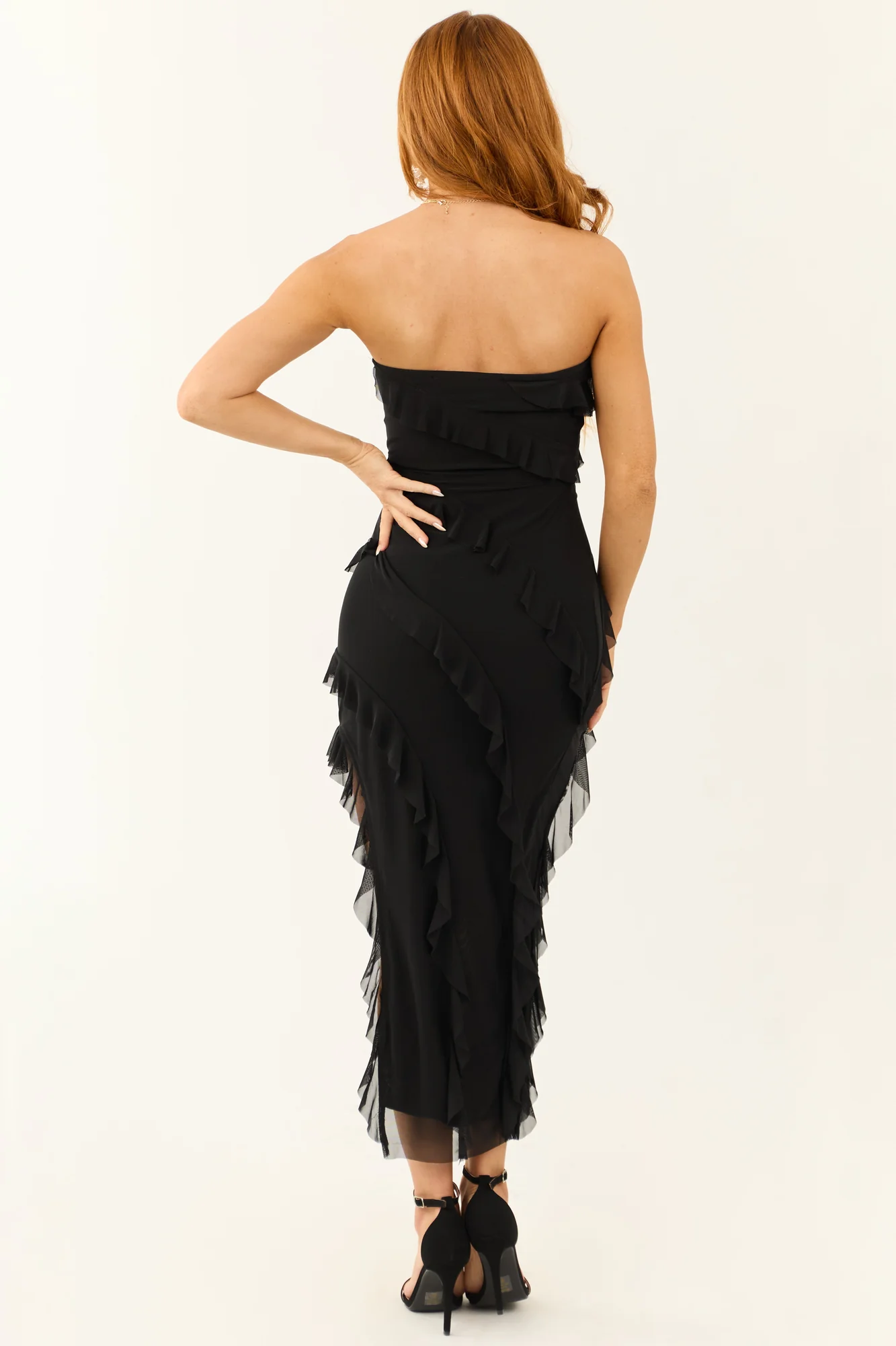 Turn heads in this Strapless Ruffle Asymmetrical Midi Dress available in sizes Small, Medium, and Large. Expertly crafted with a Bodycon fit and Stretchy mesh overlay knit, this dress features a Hidden side zipper for easy wear. The Asymmetrical hem and Ruffle detailing add a unique touch, while the 95% Polyester and 5% Spandex blend ensures comfort. Perfect for Date Night or Going Out, this elegant piece is lined with 100% Polyester. Dry clean only. Model is wearing a size Small.