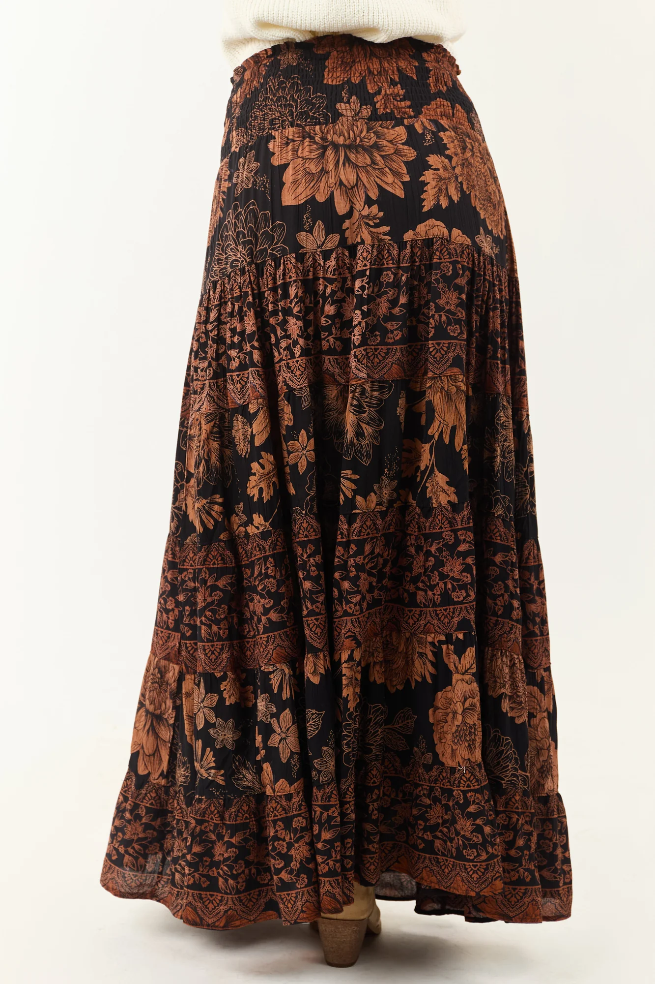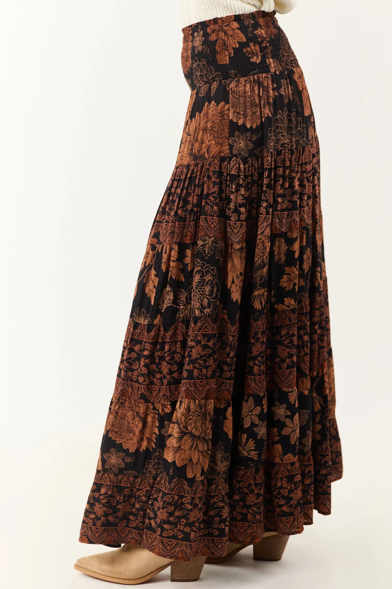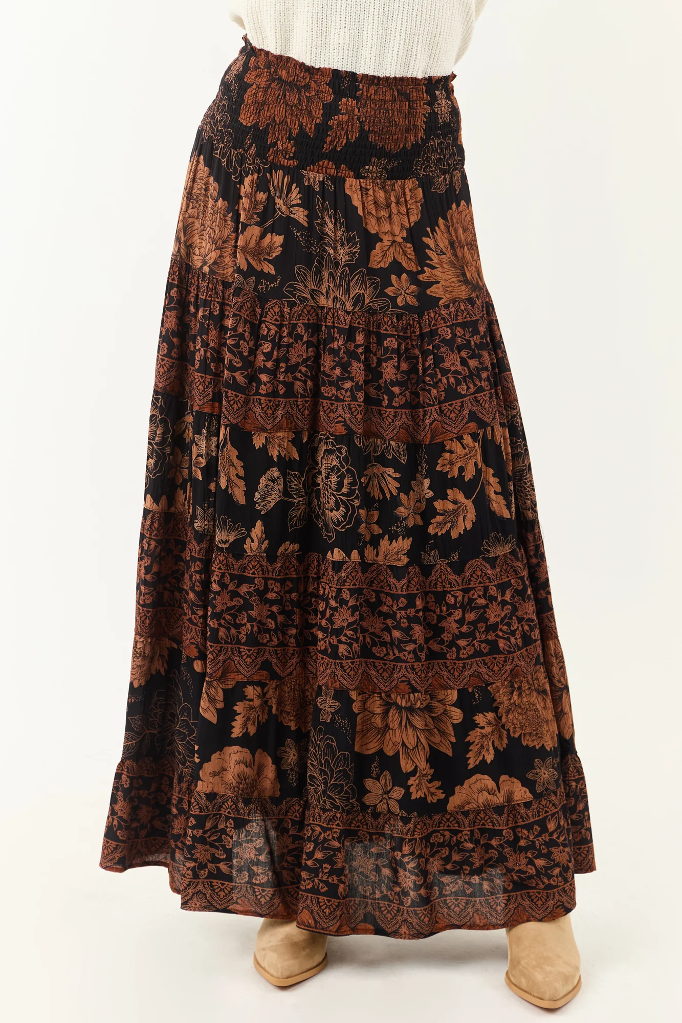 Fall in love with every step in this tiered autumn floral maxi skirt in shades of Black, Copper, and Dusty Blue. Designed with a smocked waist for a breezy, flowy silhouette that fits true to size. The skirt is made of 100% Rayon, featuring a stretchy smocked waistband for comfort. Please note that due to the nature of the print and manufacturing process, each piece may vary slightly. The model is wearing a size Small.