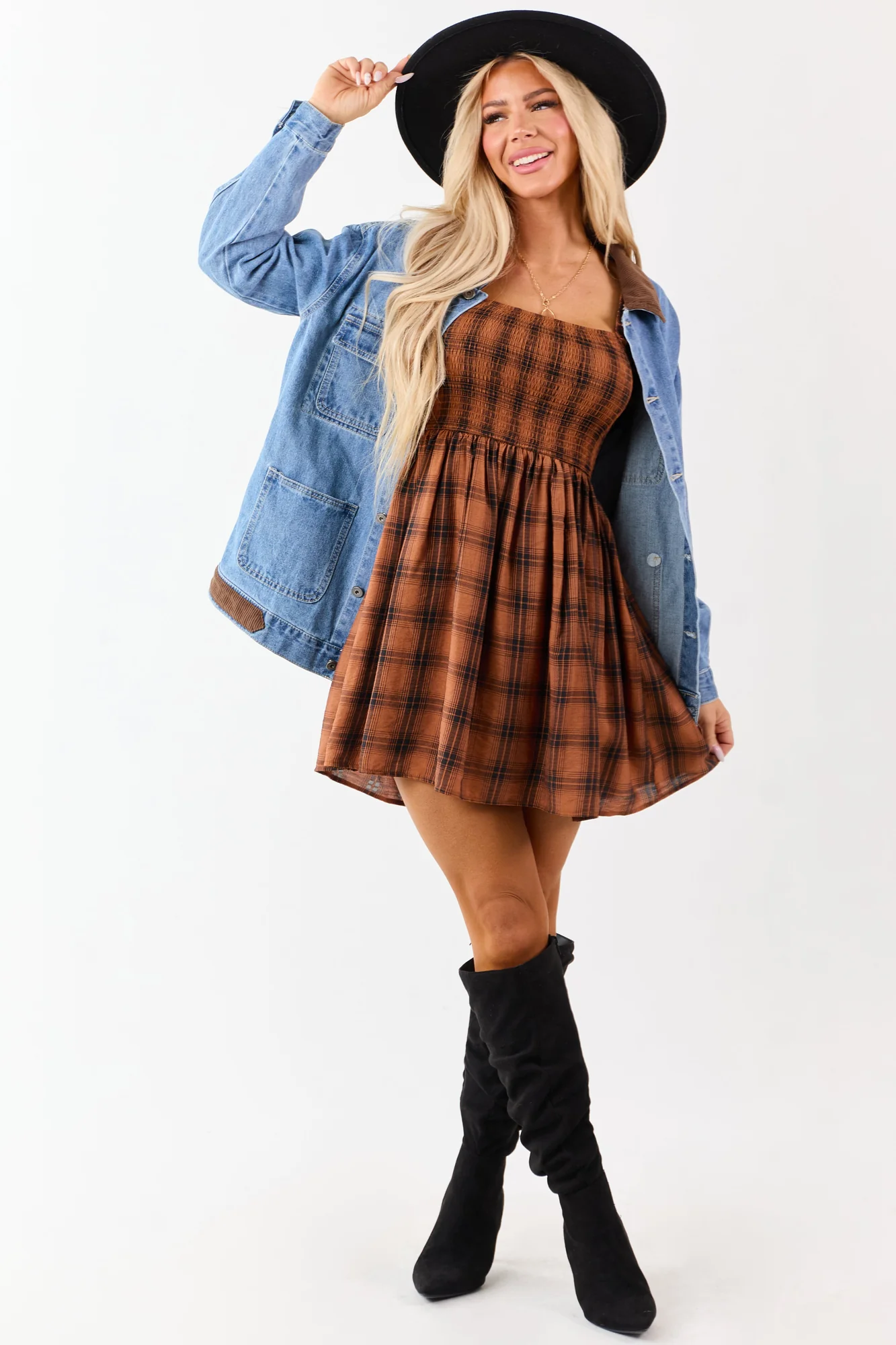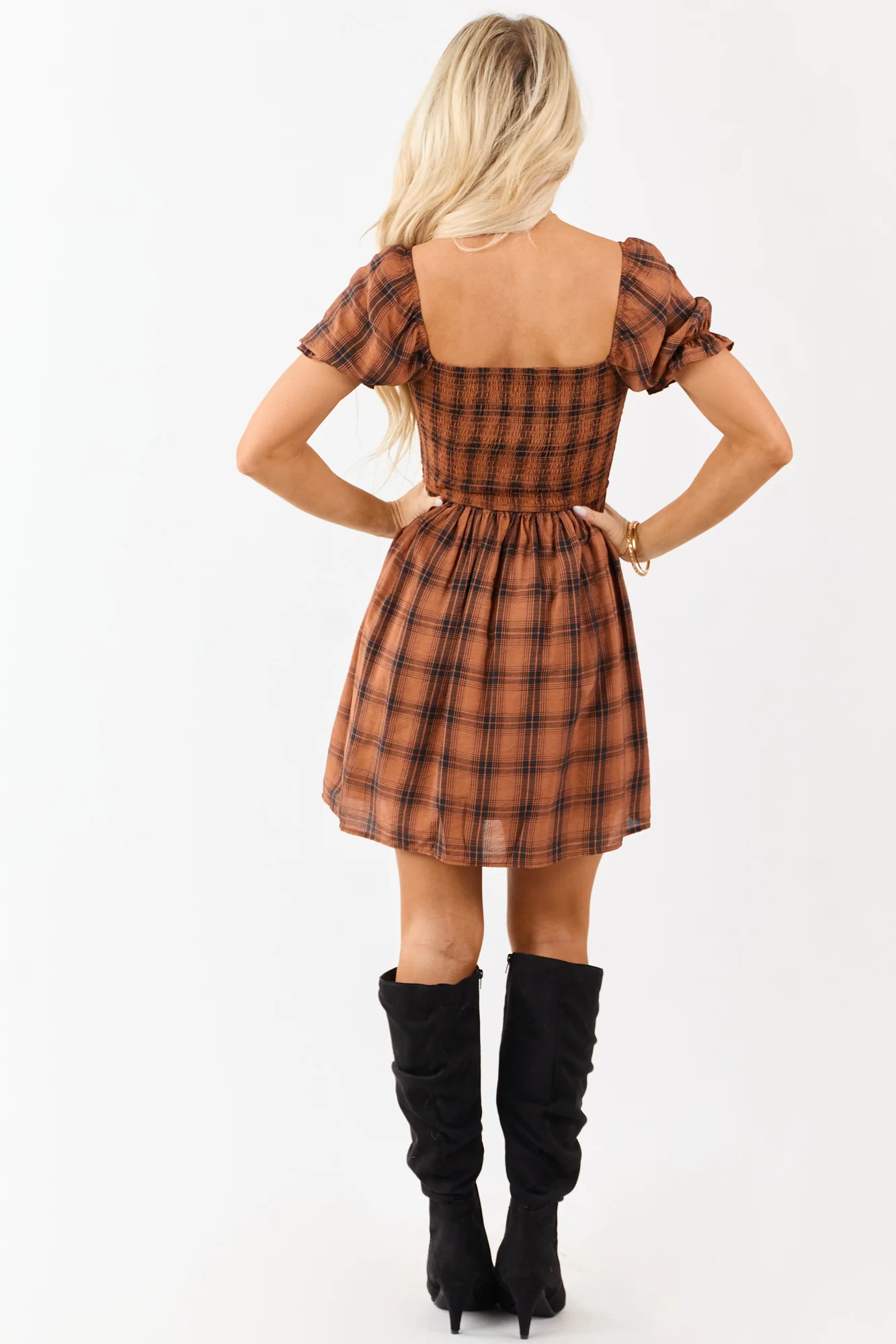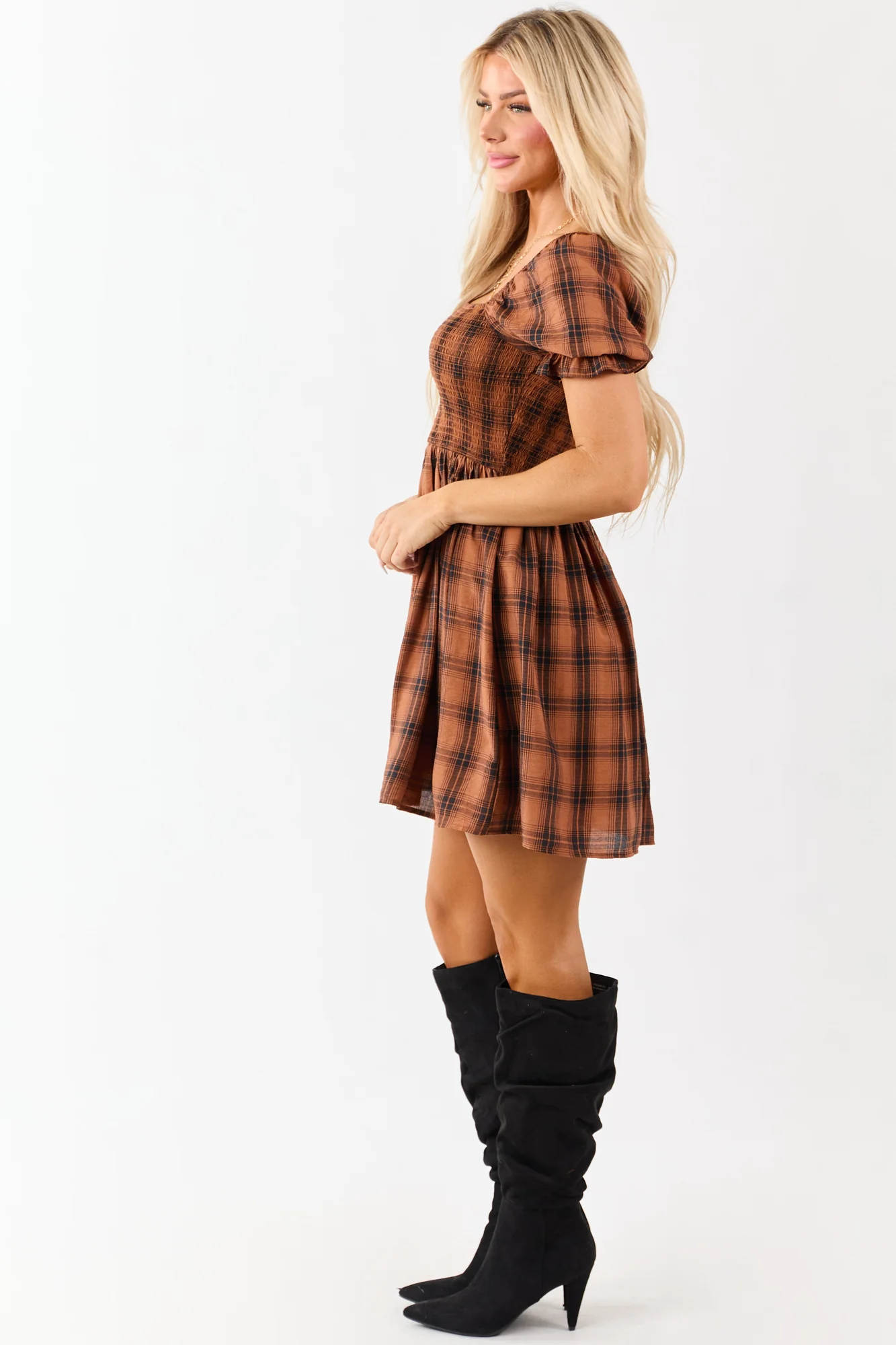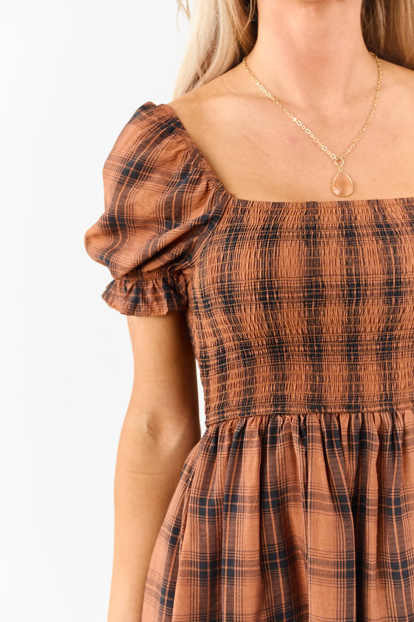 Elevate your fall style with our Dark Pumpkin Spice Plaid Mini Dress. Crafted with a smocked bodice and chic puff sleeves, this dress offers both comfort and fashion-forward flair. Perfect for the season, the dress features a stretchy smocked bodice, elastic shoulders, and cuffs for a flattering fit. The lined skirt and bold plaid pattern in black add a touch of sophistication. Made of 82% Rayon and 18% Nylon with a 100% Polyester lining, this imported dress is a must-have for your autumn wardrobe. Model is wearing size Small, with Bust: 35″, Waist: 26″, and Length: 33″. Available in sizes XS to XL.