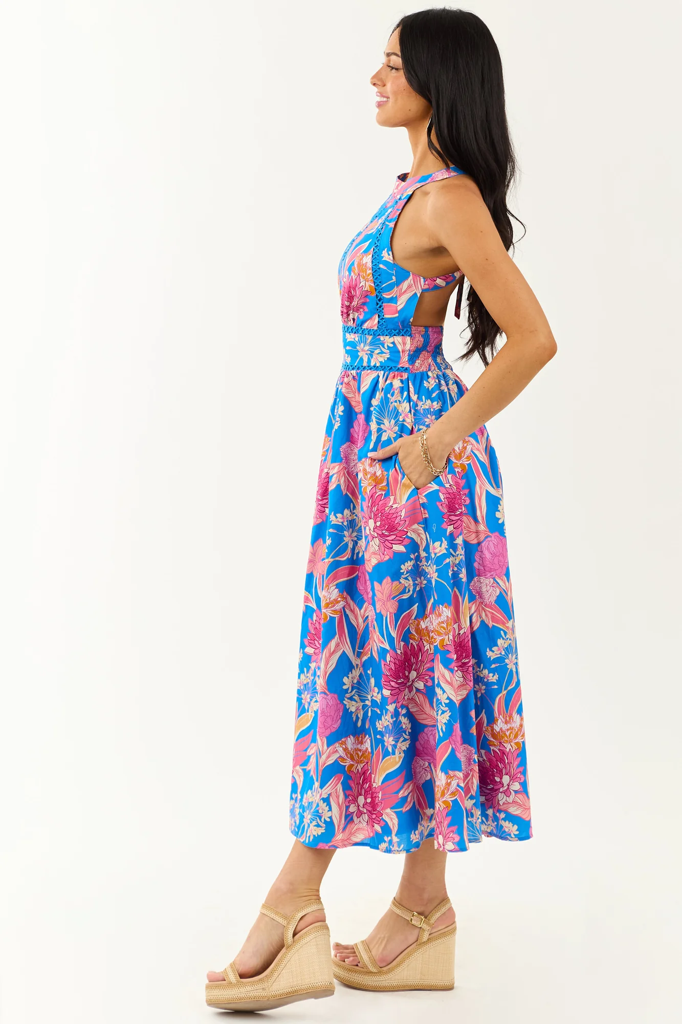 Effortless elegance meets floral flair with our Azure Floral Cotton Halter Midi Dress. Crafted from non-stretchy lightweight cotton, this dress features a stretchy smocked back waistline, vibrant floral print in Orchid, Punch, Plum, Ivory, and Sunset, open X stitching panels in Azure, halter neckline with adjustable tie, open back, side pockets, and lining (100% Polyester). Available in sizes S, M, and L.