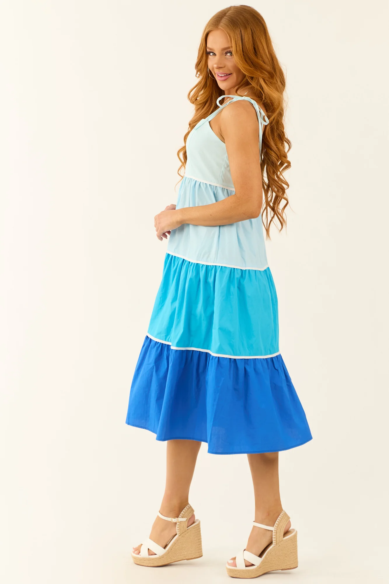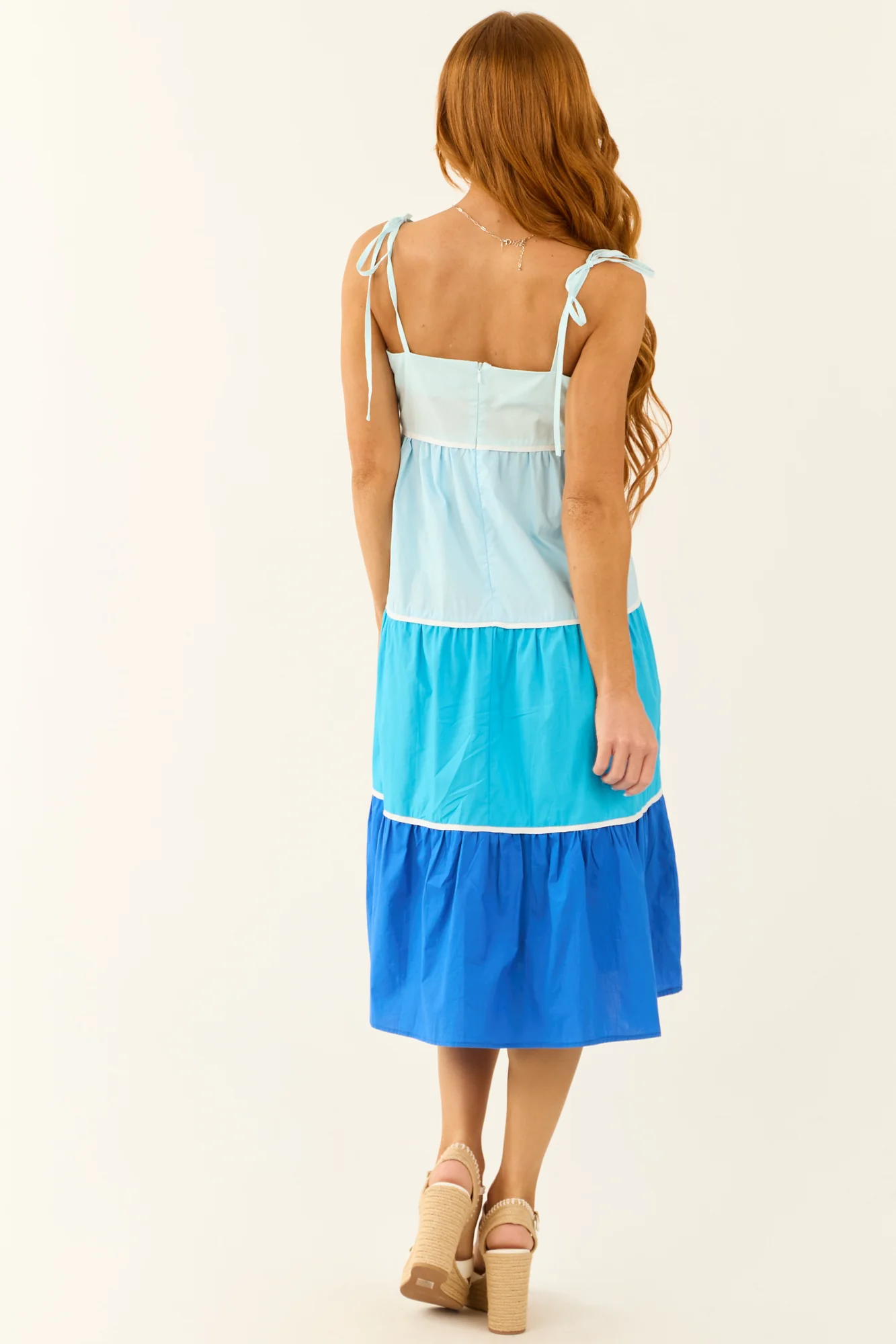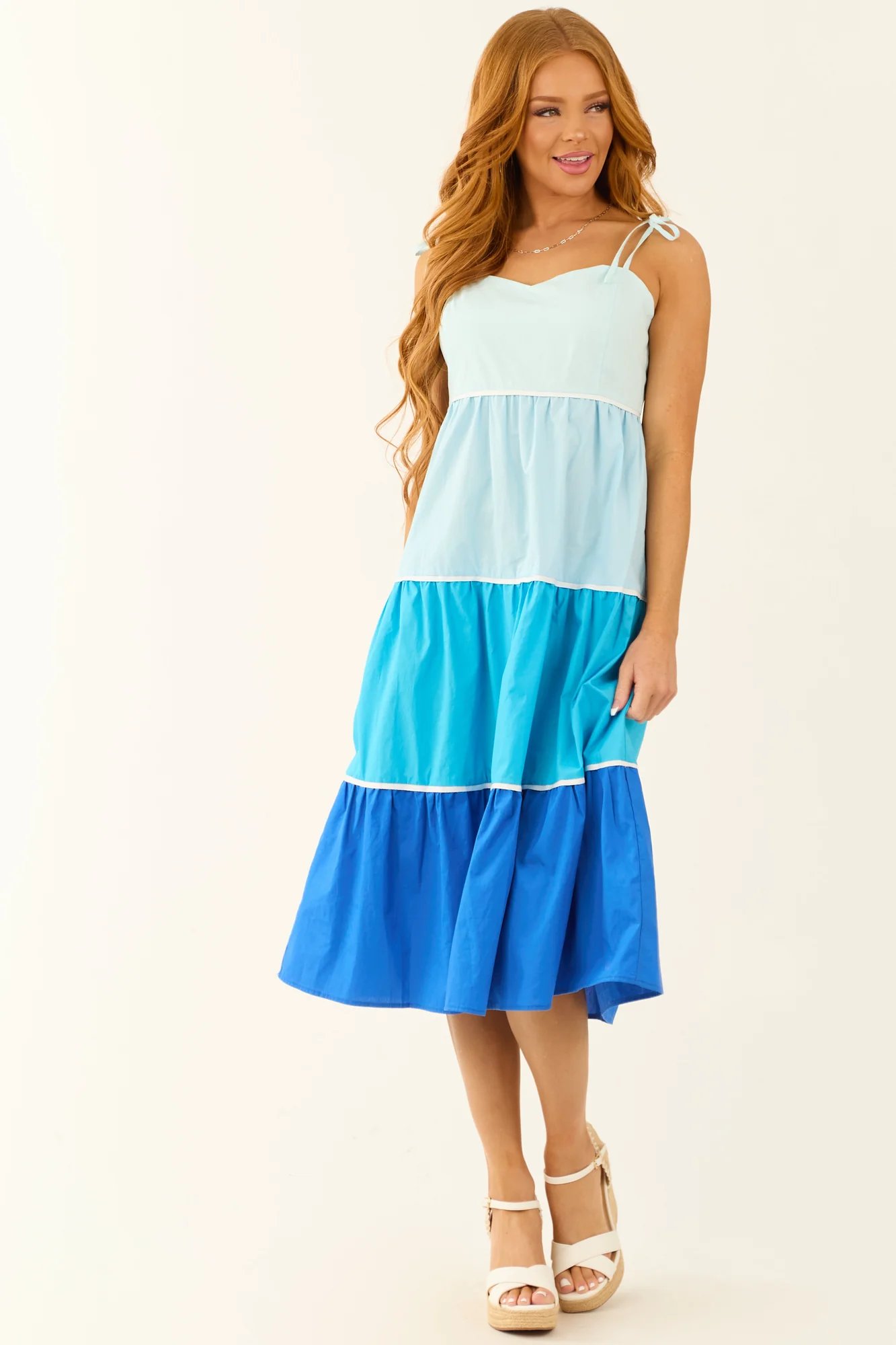 Elevate your wardrobe with our Baby Blue Tiered Sleeveless Midi Dress! Crafted from 100% cotton with a non-stretchy woven design, this dress features a sweetheart neckline, adjustable tie straps, princess seams, and a tiered ruffle skirt. Available in shades of Baby Blue, Powder Blue, and Sapphire, this babydoll fit dress adds a touch of charm to any occasion. Stay comfortable and stylish with this lined dress suitable for hand wash only. Model is wearing a size Small.