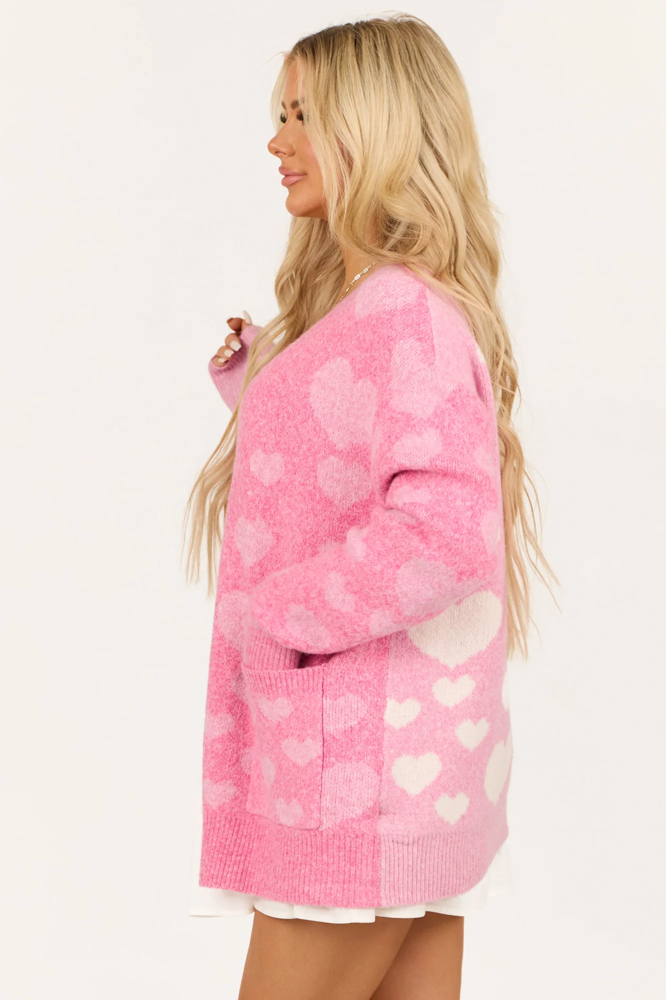 Discover ultimate comfort and style with our Baby Pink and White Heart Pattern Knit Cardigan. This oversized cardigan features a stretchy knit fabric with charming hearts in blush tones. Designed with a cozy drop shoulder fit, long sleeves, ribbed cuffs, and hem, this cardigan offers both warmth and chic appeal. Front pockets, an open front design, and a self-fabric blend of 47% polyester, 35% acrylic, 15% nylon, 3% spandex add versatility and luxurious softness to this must-have wardrobe piece. Hand wash cold for long-lasting quality. Available in sizes S, M, L, and XL.