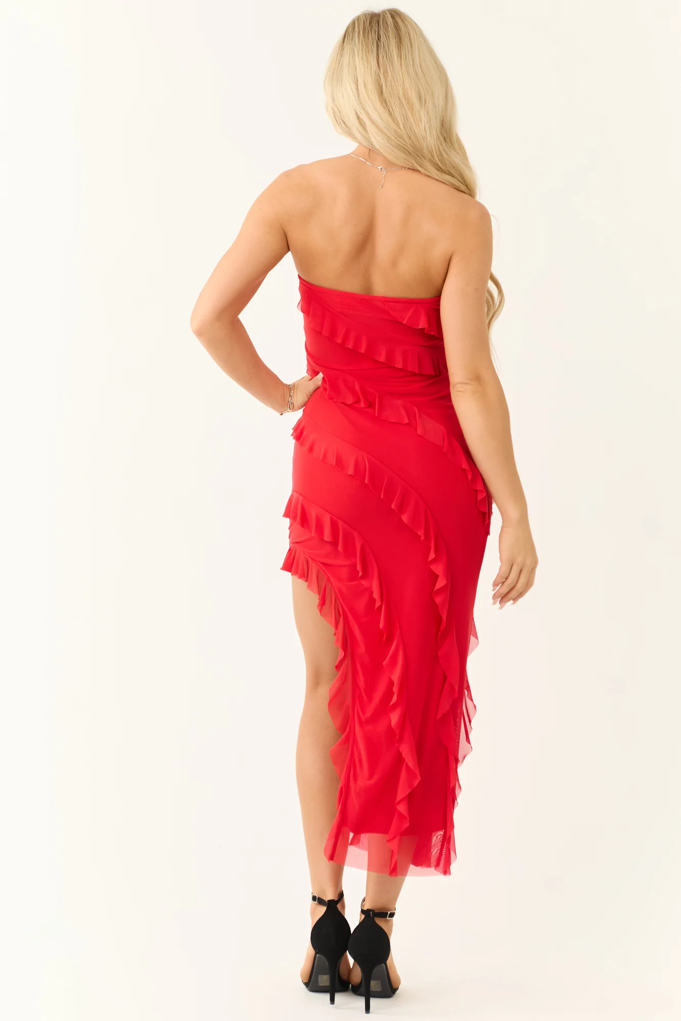 Stay chic and sophisticated with our Baby Pink Asymmetrical Ruffle Strapless Midi Dress. This bodycon dress features a stretchy mesh overlay knit with ruffle detailing. The hidden side zipper with hook and eye closure ensures a perfect fit. The lined dress has a Grip strip at the bust for added support. Crafted from 95% Polyester and 5% Spandex, this dress is as comfortable as it is stylish. Elevate your wardrobe with this trendy and elegant piece. Note: Dry clean only. Model is wearing a size Small. Models height: 57″, Bust: 34″, Waist: 26″.