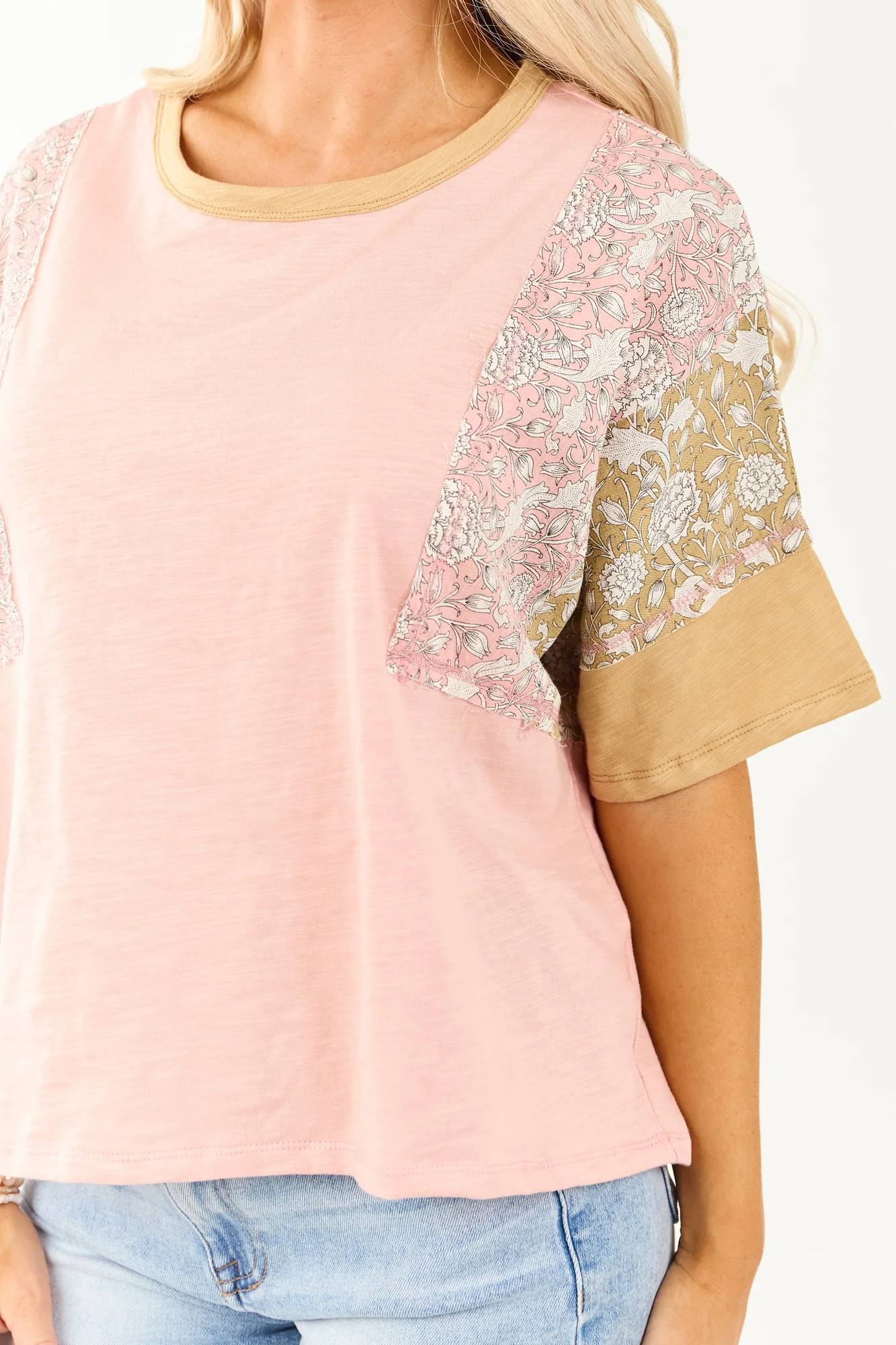 Indulge in the cozy charm of this baby pink cotton top. Designed with relaxed half sleeves and intricate patchwork details in shades of pink, ivory, desert, cocoa, and sand. Crafted from non-stretchy lightweight cotton for a lived-in look. Enjoy the oversized fit that offers comfort with style. Embrace the raw seam finishing that adds character to each piece. Please note that due to the unique fabric print and handcrafted sewing process, each item may vary slightly, ensuring a one-of-a-kind appeal. Model is wearing size Small. Height: 57″, Bust: 34″, Waist: 26″.