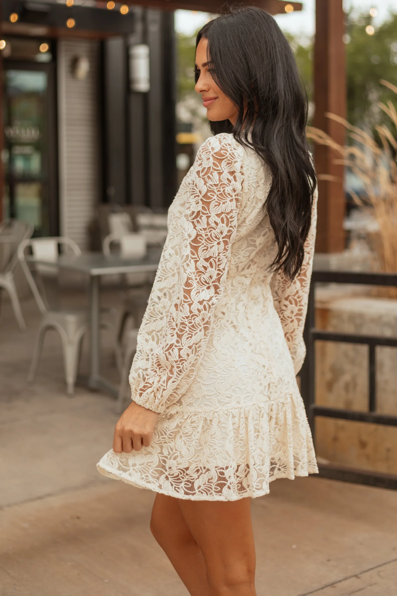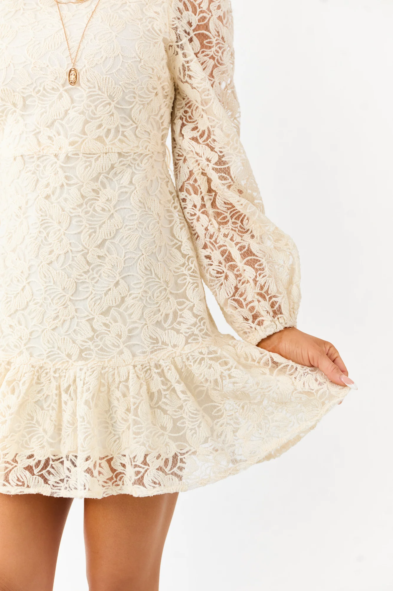 Illuminate your style with our romantic and timeless Baby Pink Floral Lace Mini Dress. Crafted with sheer long sleeves, a flirty ruffle hem, and a fitted bust design, this dress exudes elegance and charm. Made of 100% Polyester, it features elastic cuffs, a hidden back zipper, and is lined for your comfort. Be the epitome of grace in this must-have attire. Available in sizes XS to XL.