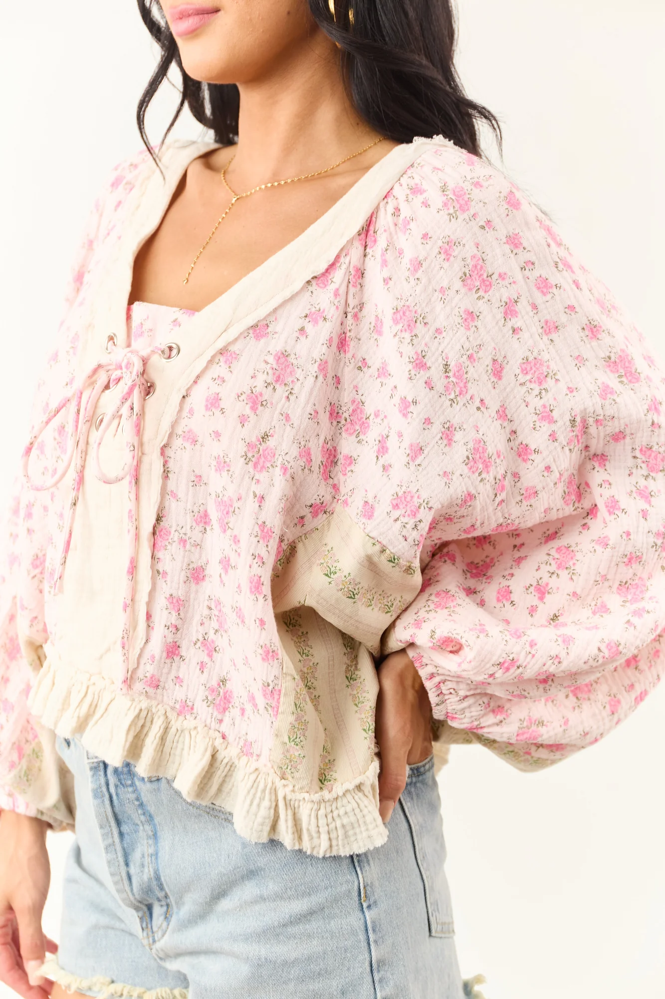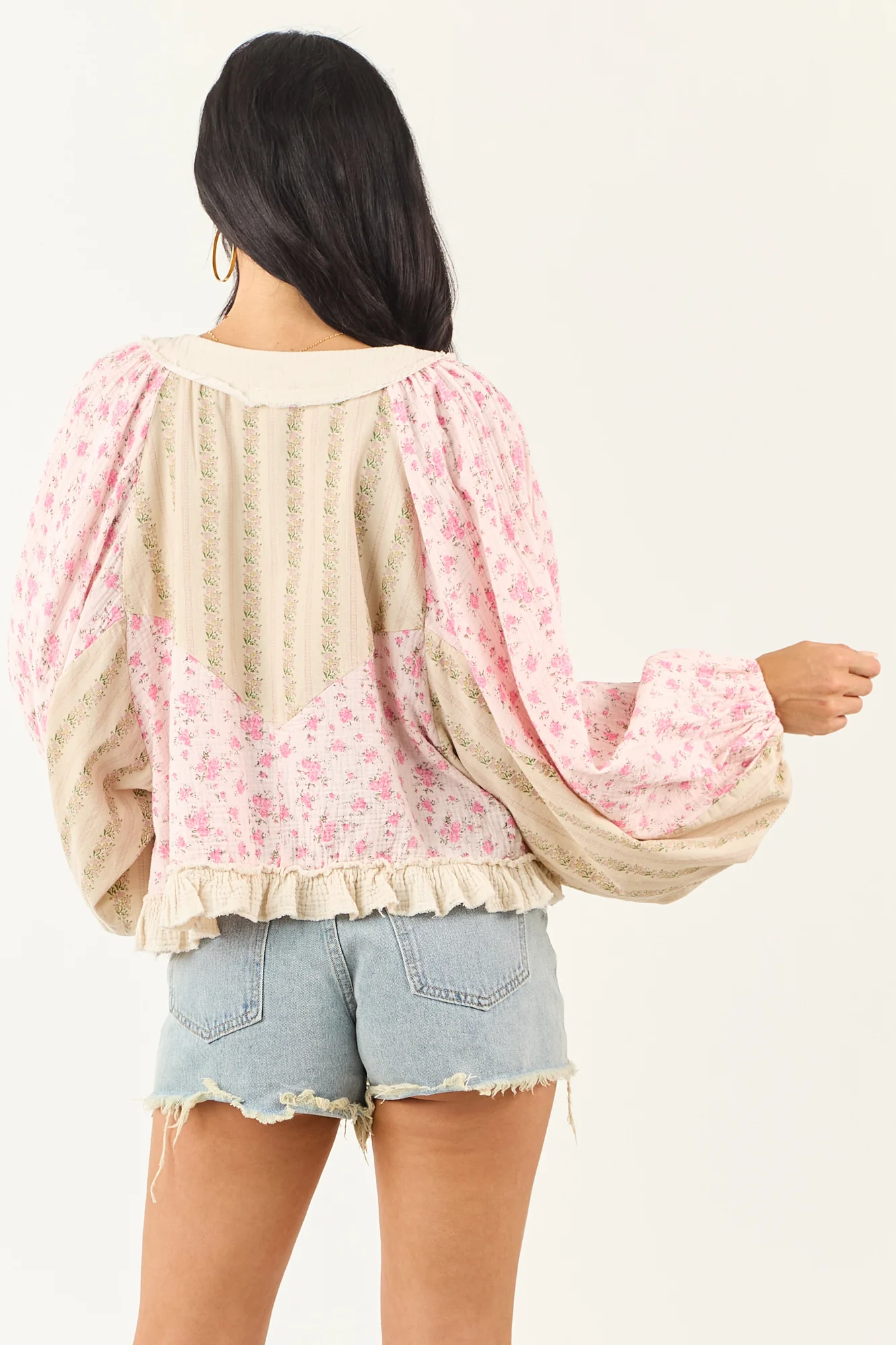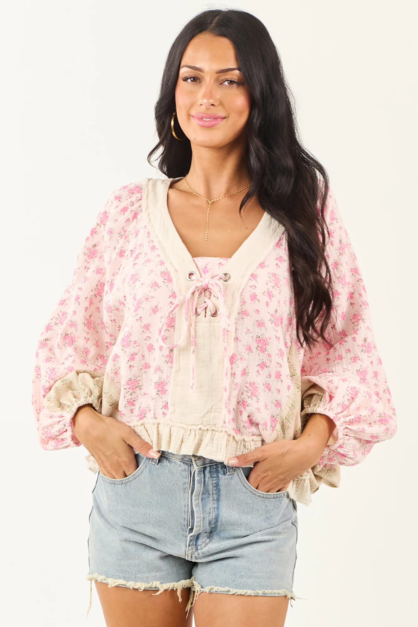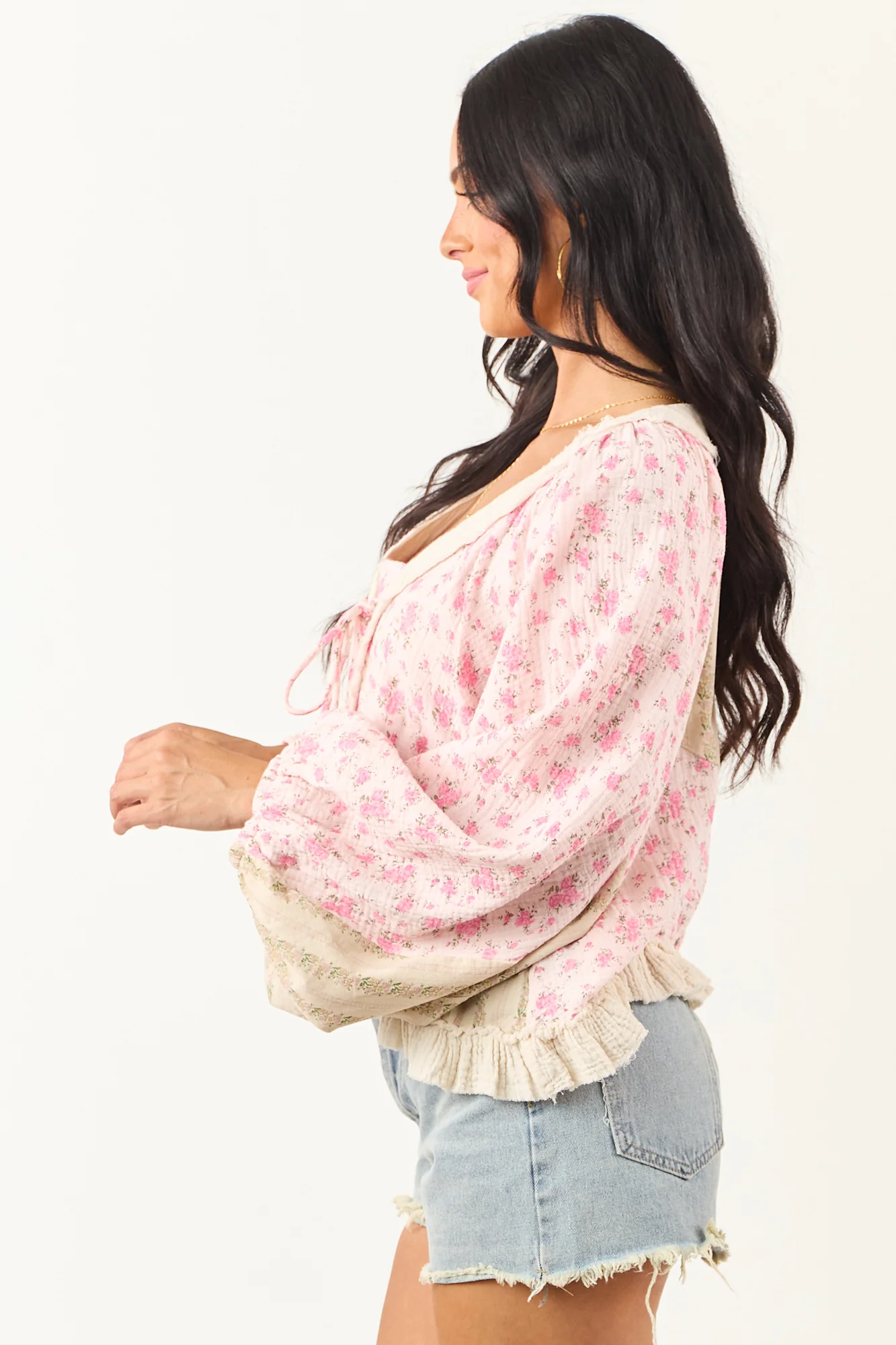 This dreamy gauze cotton top in baby pink features floral patchwork, billowy bubble sleeves, and a lace-up front for a vintage-inspired look. The oversized fit, non-stretchy lightweight cotton, and print in shades of Baby Pink, Cream, Sage, and more offer a sweet and airy style. Elastic cuffs, raw hem details, and imported craftsmanship enhance the charm of this 100% Cotton top. Note: Each piece may vary slightly due to the cutting and sewing process. Model size: Small.