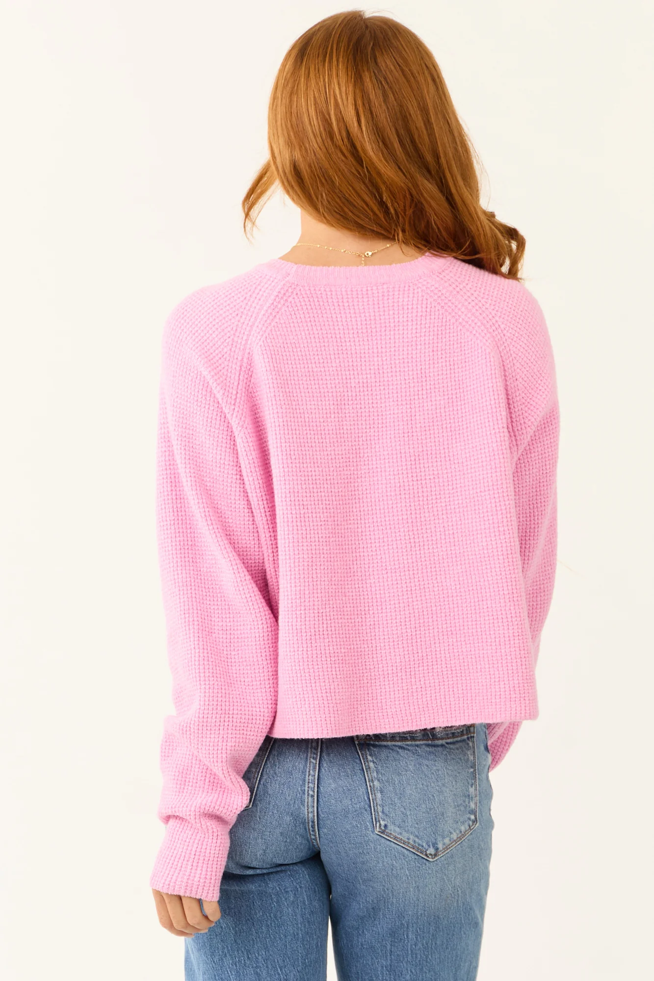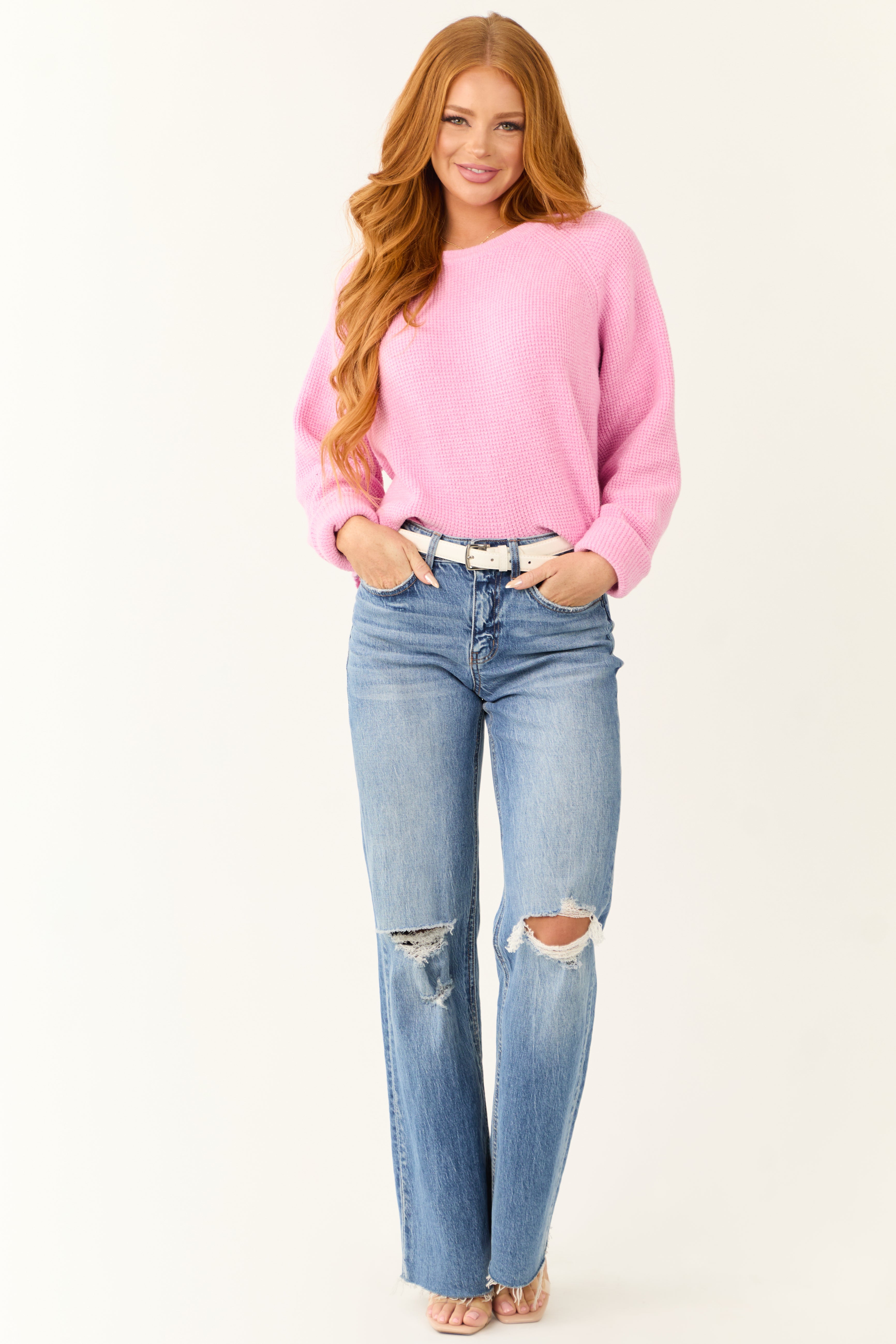 This Baby Pink Ribbed Knit Oversized Sweater is a cozy essential for your wardrobe. Crafted from a stretchy ribbed knit, it features long wide sleeves and a relaxed fit. Whether youre out and about or lounging at home, this sweater will keep you looking stylish and feeling comfortable. The sweater is unlined and made of 96% Polyester and 4% Spandex for a soft feel against your skin. Easily cared for with hand wash cold and flat drying instructions. Available in sizes S (2-4), M (6-8), and L (10-12). Model is wearing a size Small. Model’s Profile: Size 1, Height 55″, Bust 31″, Waist 24″.