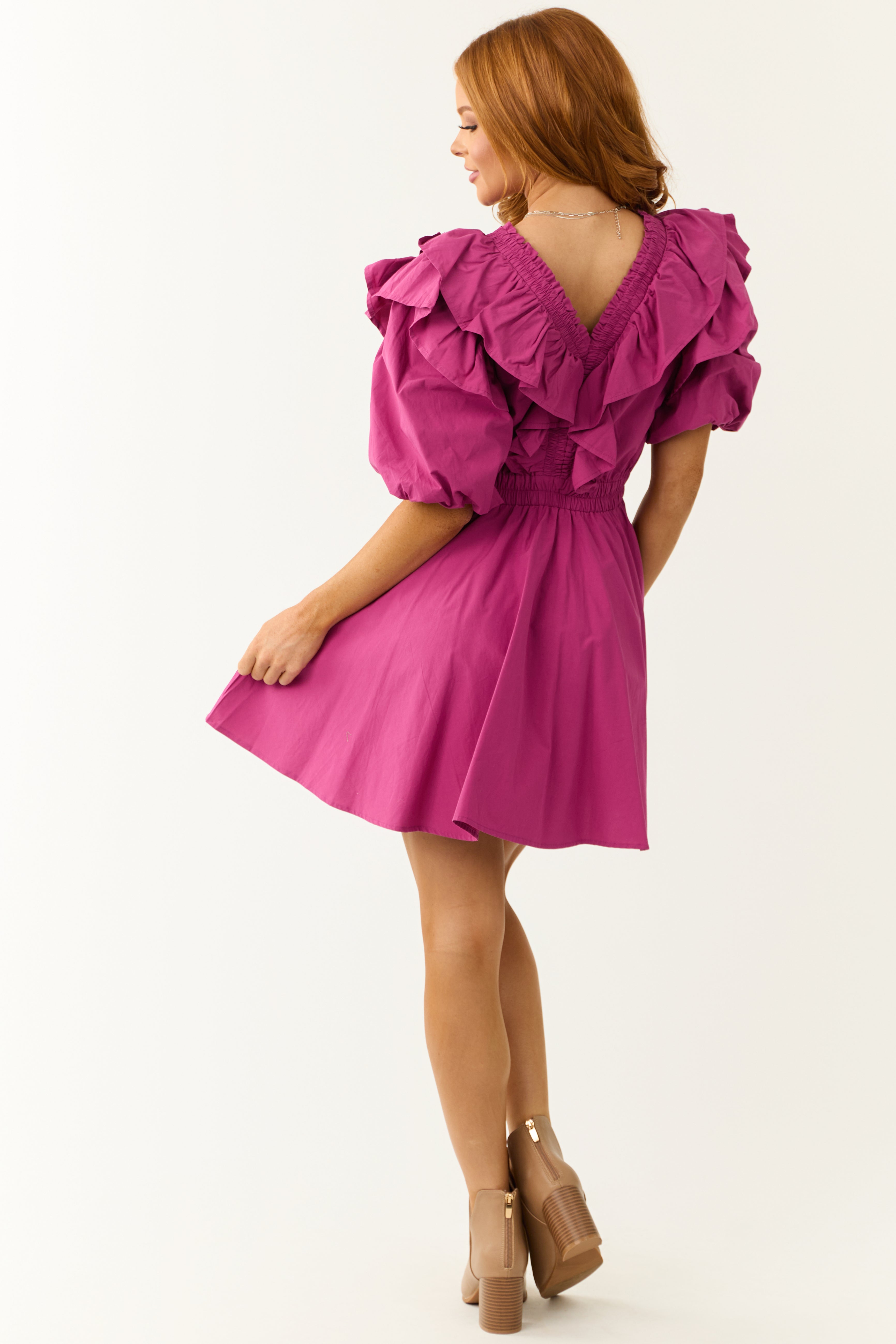 Indulge in the elegant charm of our Baby Pink Ruffle V-Neck Short Dress for women. Available in sizes S to L, this dress features a flare skirt, half puff sleeves, and elastic ruched waistband for comfort and style. Made from 100% Rayon with beautiful ruffle details throughout the top, this dress is perfect for going out or special occasions. Includes pockets and is unlined. Care instructions: Hand wash cold with like colors, hang to dry.