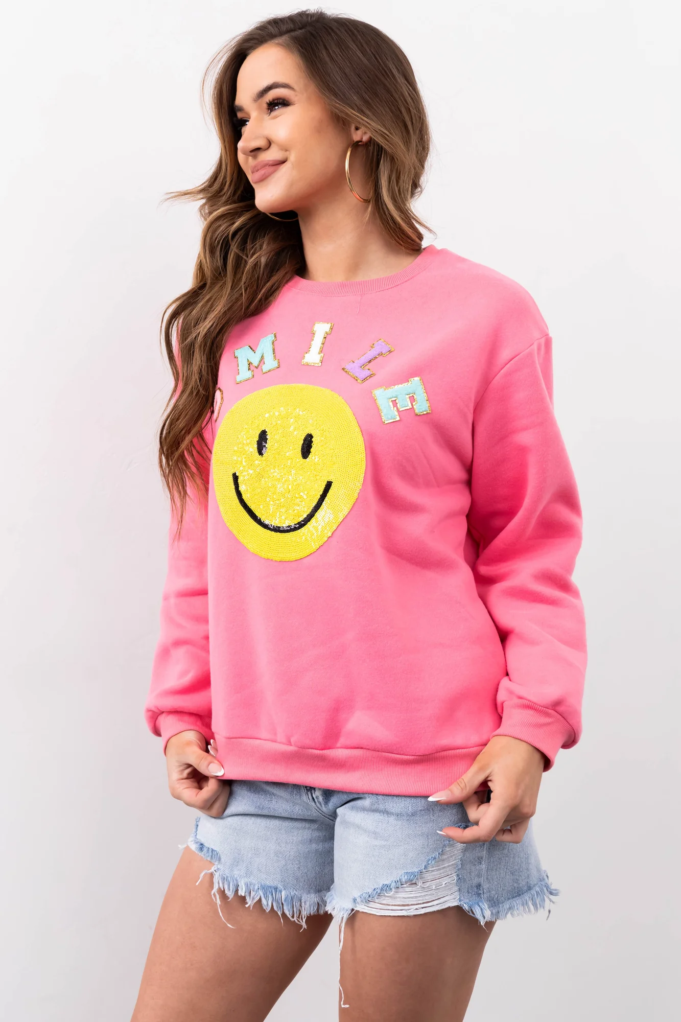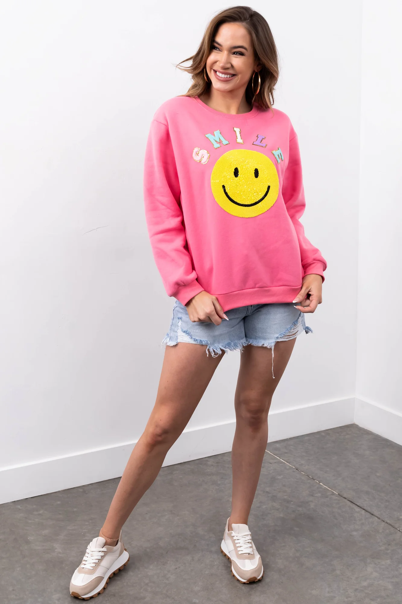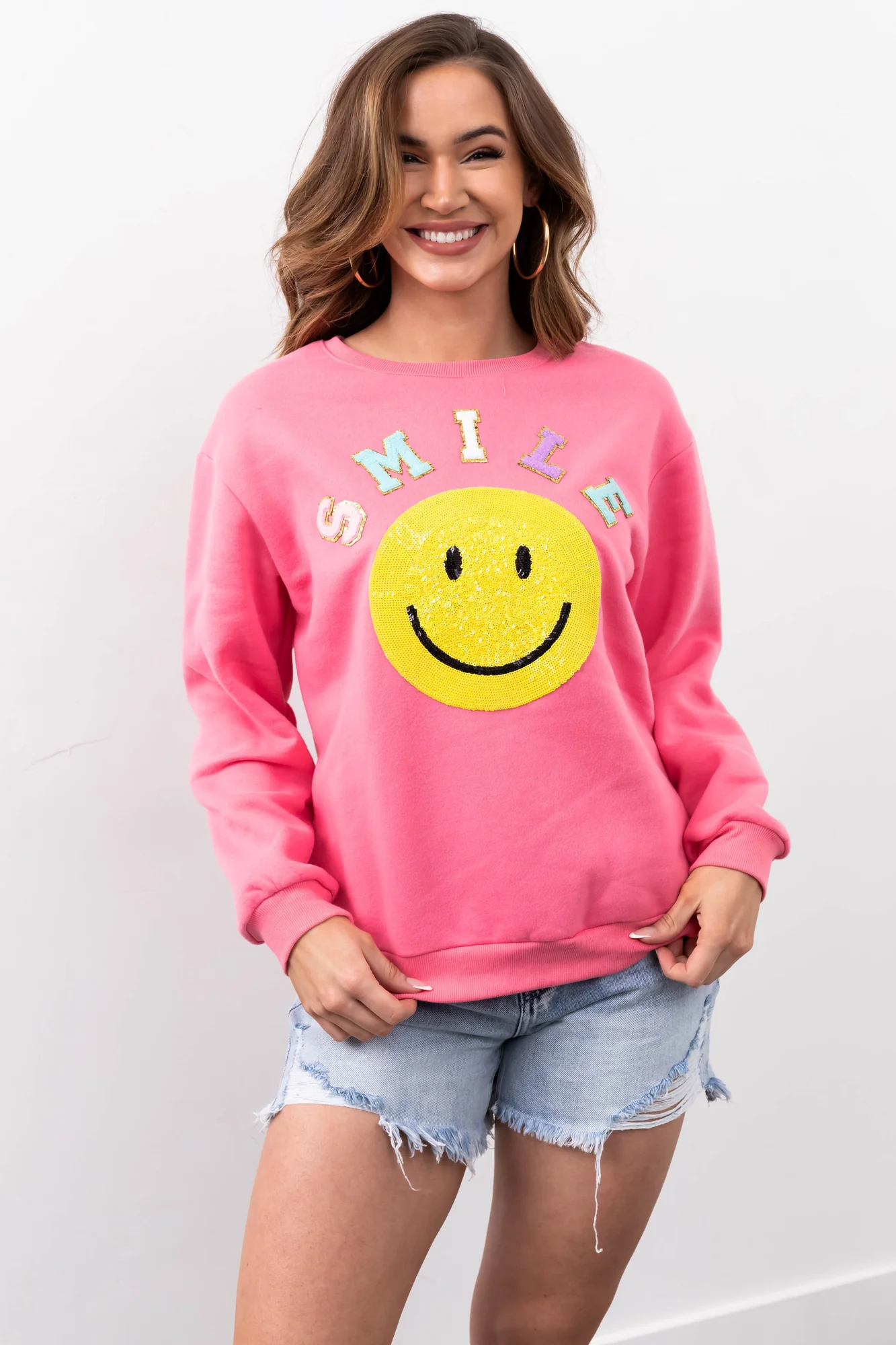 Stay stylish and cozy in this Baby PinkSmileSequin Sweatshirt available in sizes Small, Medium, and Large. Made from a stretchy soft knit blend, featuring drop shoulders, long sleeves, ribbed trim, and sequins in Black and Sunshine. The embroideredSmiledesign adds a playful touch in Gold, Cherry Blossom, Baby Blue, Off White, and Iris colors. Crafted from 78% Polyester and 22% Cotton with 100% Polyester contrast. Easy to care for – hand wash cold, avoid bleach, and hang to dry. Perfect for casual outings, daytime wear, or layering for a chic look.