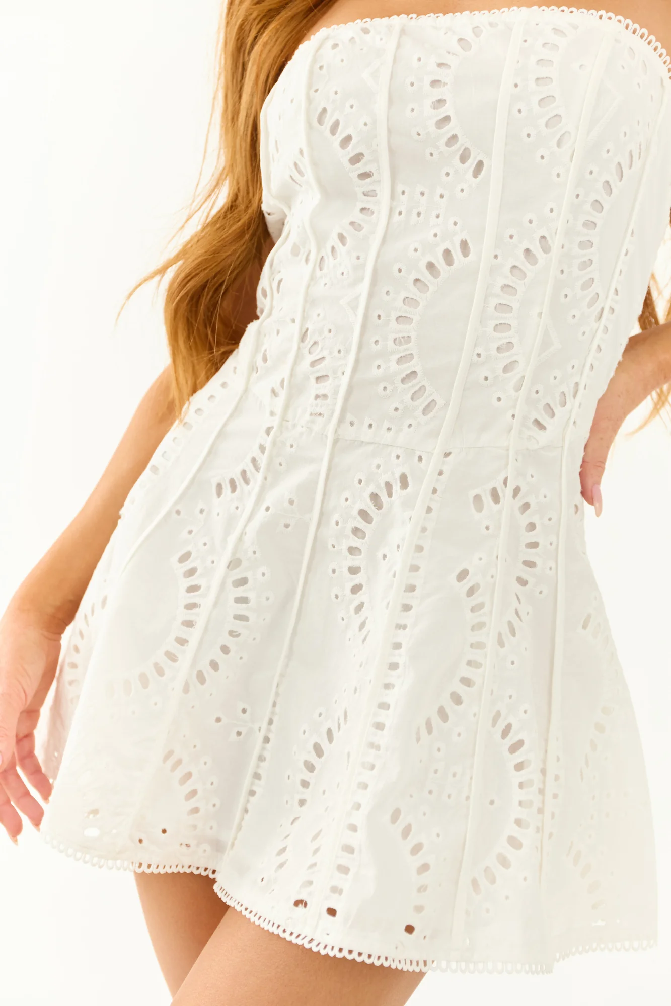 Indulge in the elegance of our Baby Pink Strapless Mini Dress with Delicate Eyelet Detail. This charming dress features a flirty flare skirt, a sassy strapless fit, and exquisite scalloped lace trim. Designed with a stretchy smocked back and binding seam detailing, it offers both style and comfort. The addition of an adhesive strip on the bust prevents slippage while enhancing your confidence. Lined for quality and crafted from 100% Rayon for a luxurious feel. Perfect for any occasion, from casual outings to special events. Consider sizing down for a slightly more tailored fit. Embrace this captivating style and make a fashion statement effortlessly.