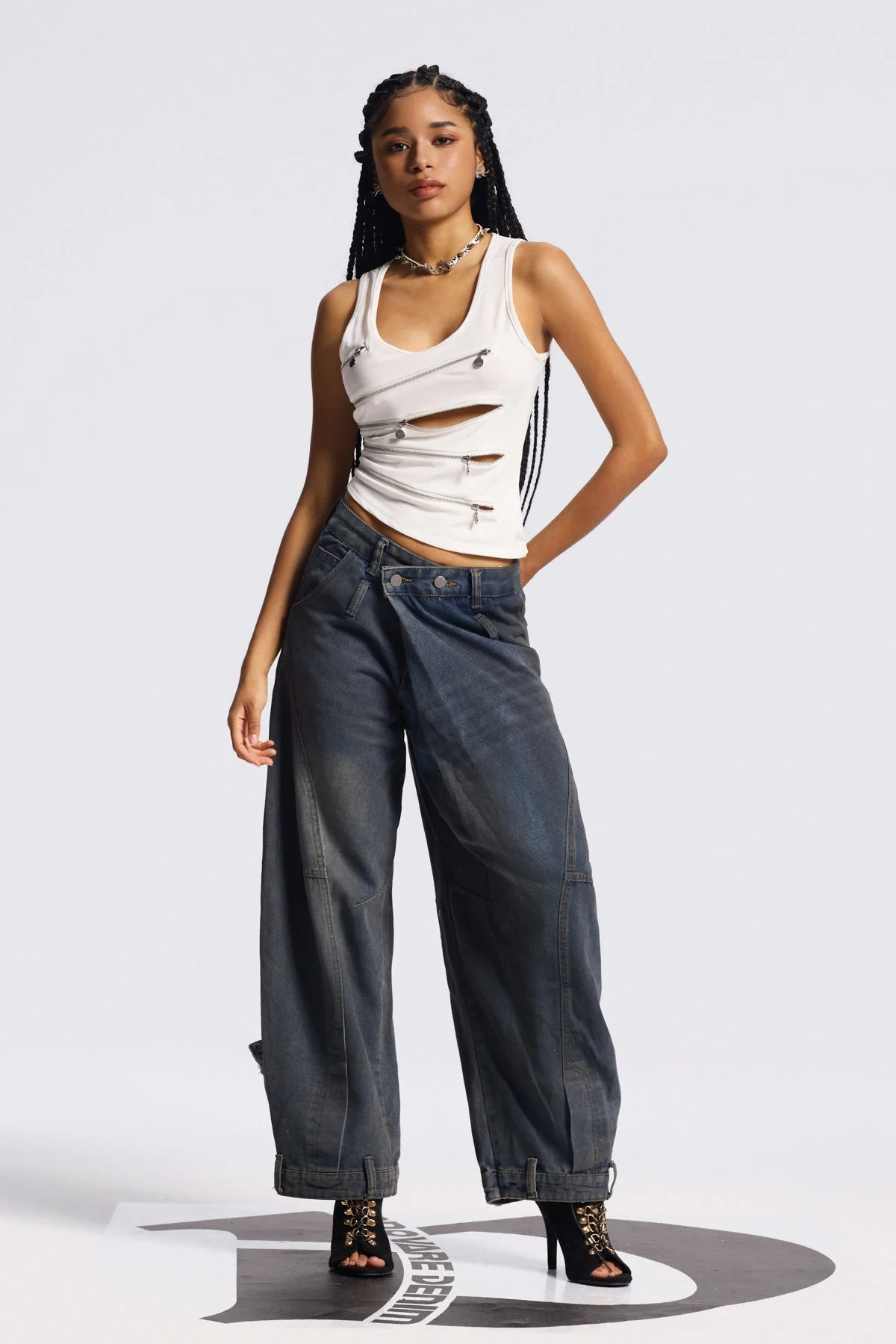 The Baggy Blue Printed Asymmetric Jeans offer a unique blend of avant-garde design and comfort. With an innovative asymmetric cut and striking print pattern, these jeans make a bold fashion statement. The relaxed baggy fit ensures both style and freedom of movement, making them a must-have for trendsetters. Crafted for non-stretch comfort and easy care, these jeans are perfect for those seeking a fresh urban edge in their wardrobe. Please note: Color may vary due to lighting effects. Ensure gentle machine wash to maintain quality. Discover the perfect balance of style and comfort with these eye-catching jeans.