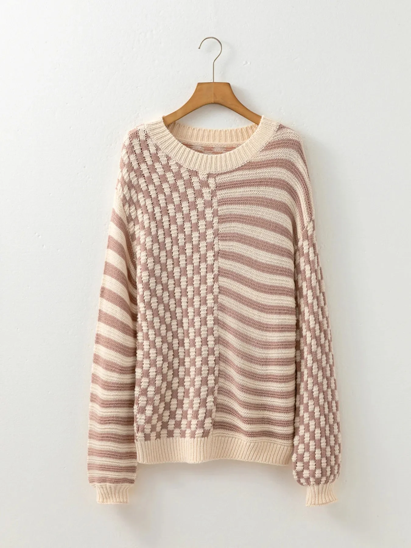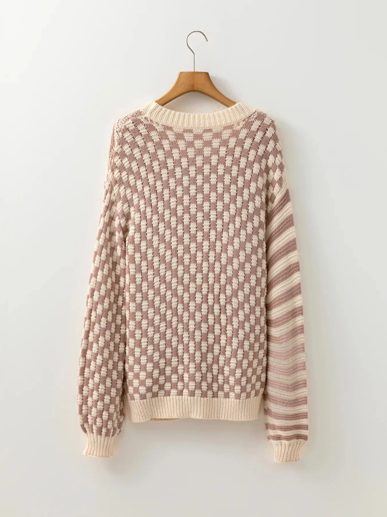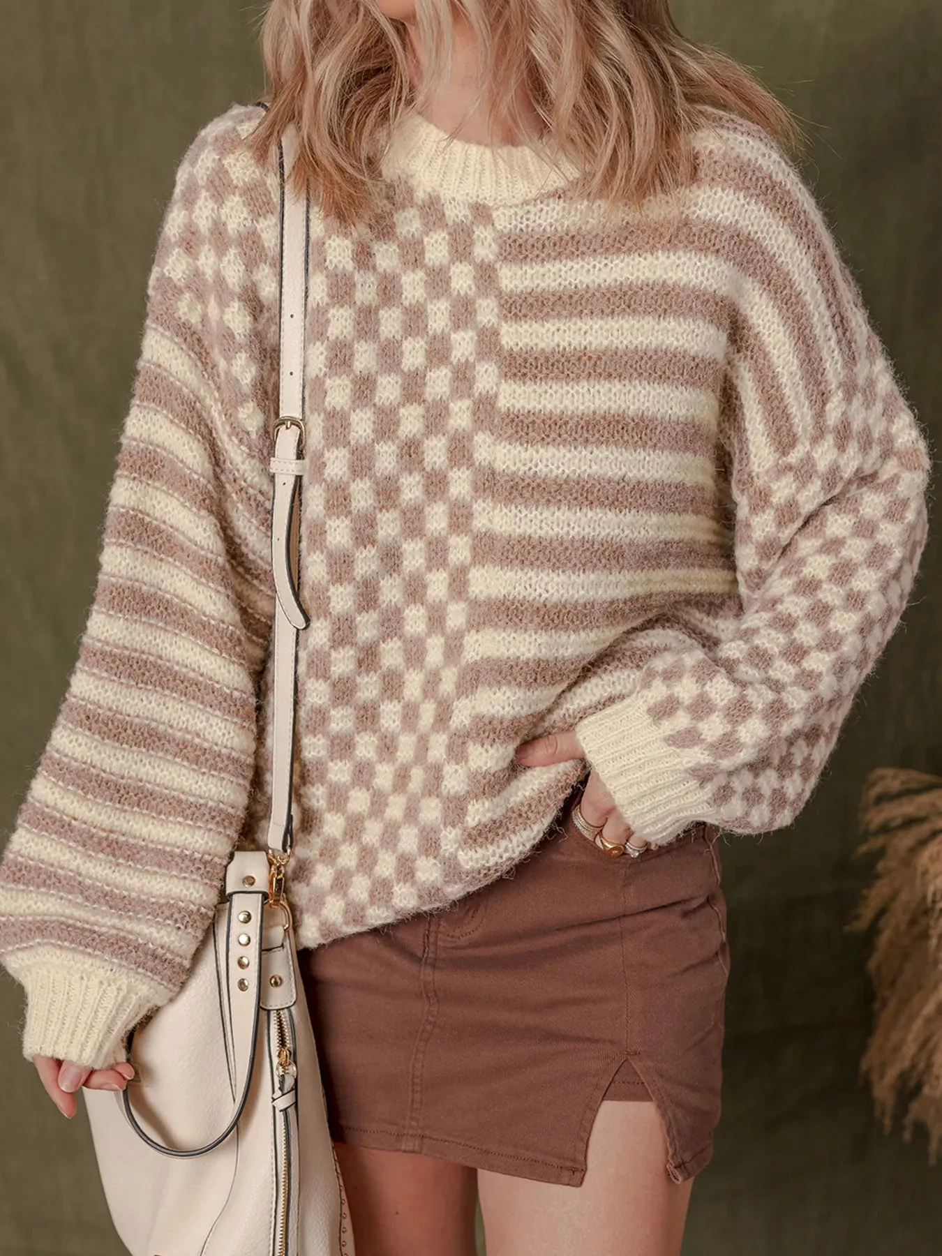 Wrap yourself in cozy style with our Balloon Sleeve Stripe Checkerboard Sweater. This oversized sweater features a trendy drop shoulder design, crafted from a stretchy blend of 65% acrylic and 35% polyamide for ultimate comfort. Machine washable for easy care. Stay fashionable and warm this season! Available in multiple sizes: S (23.2top length, 39bust), M (24top length, 41.3bust), L (24.8top length, 43.7bust), XL (25.6top length, 46.9bust).