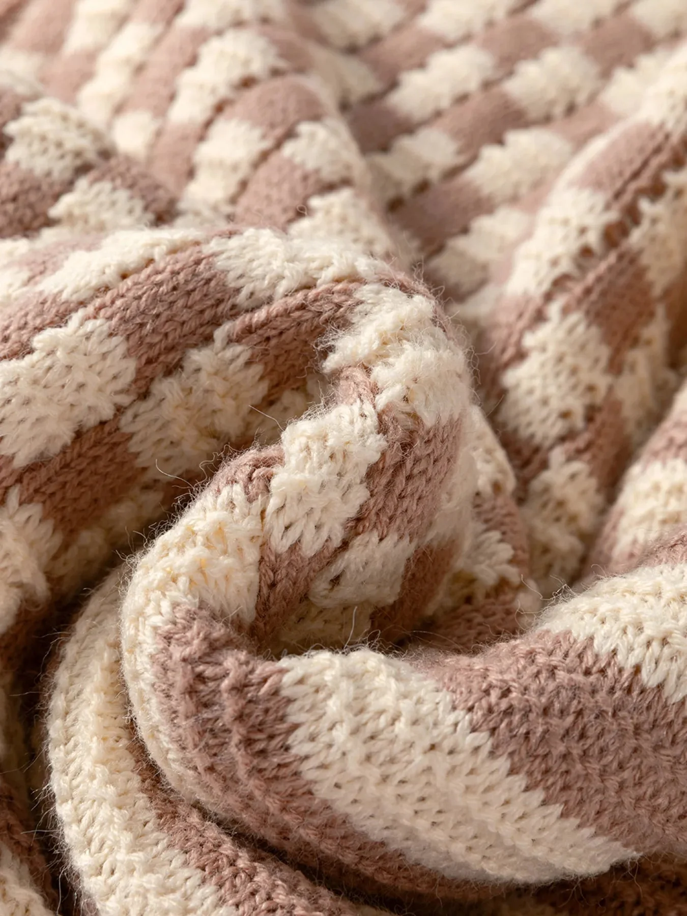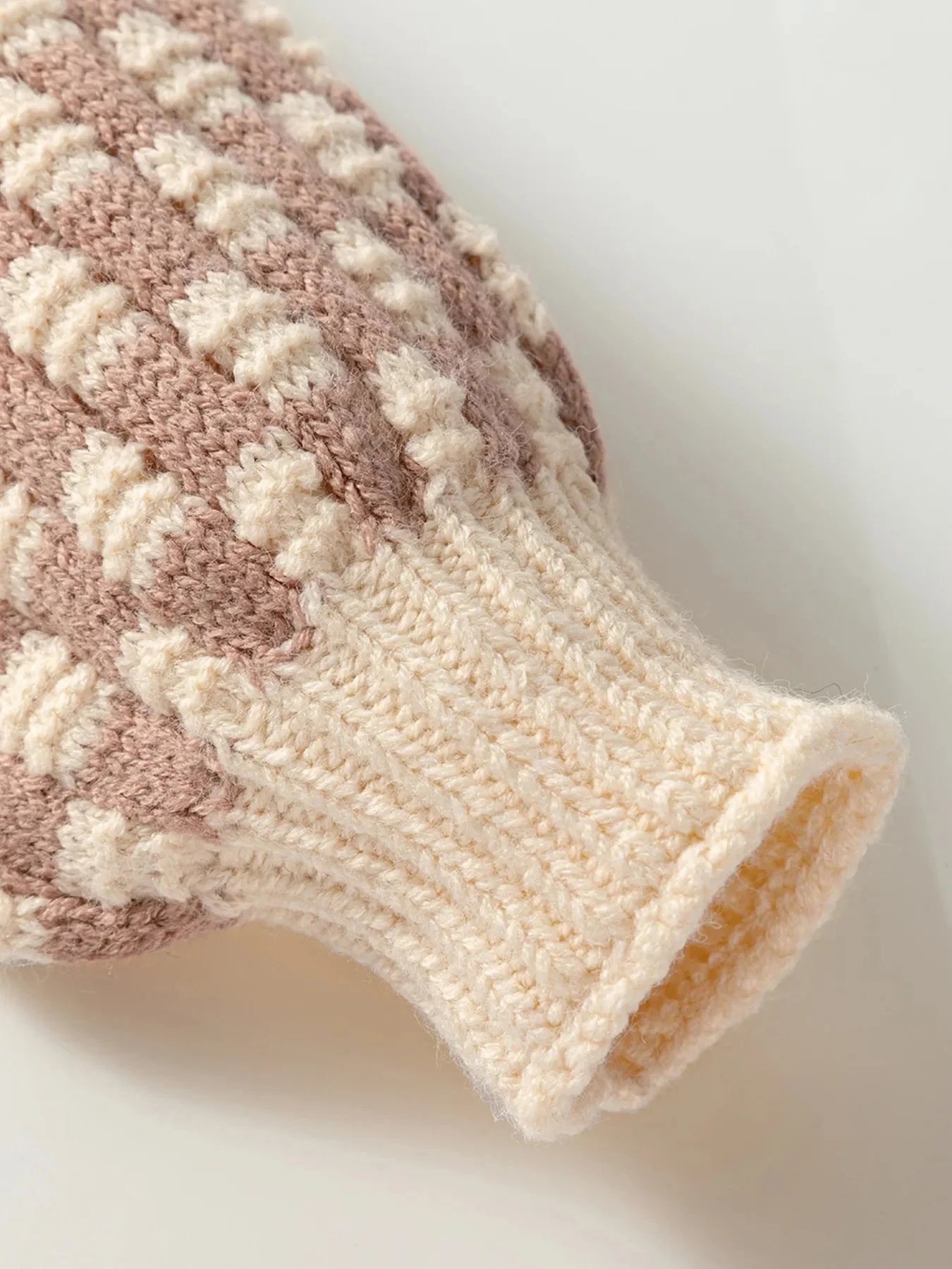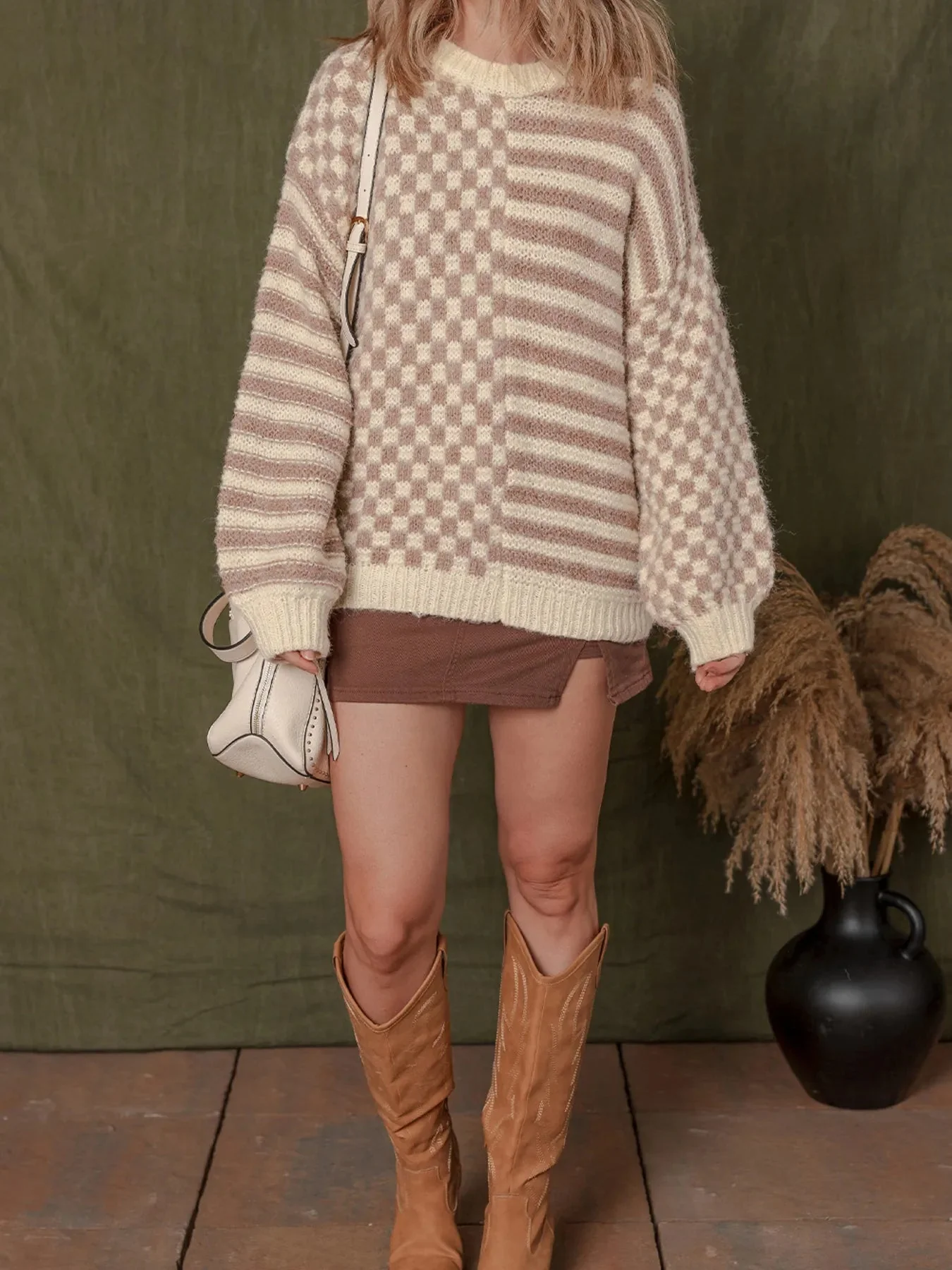Wrap yourself in cozy style with our Balloon Sleeve Stripe Checkerboard Sweater. This oversized sweater features a trendy drop shoulder design, crafted from a stretchy blend of 65% acrylic and 35% polyamide for ultimate comfort. Machine washable for easy care. Stay fashionable and warm this season! Available in multiple sizes: S (23.2top length, 39bust), M (24top length, 41.3bust), L (24.8top length, 43.7bust), XL (25.6top length, 46.9bust).