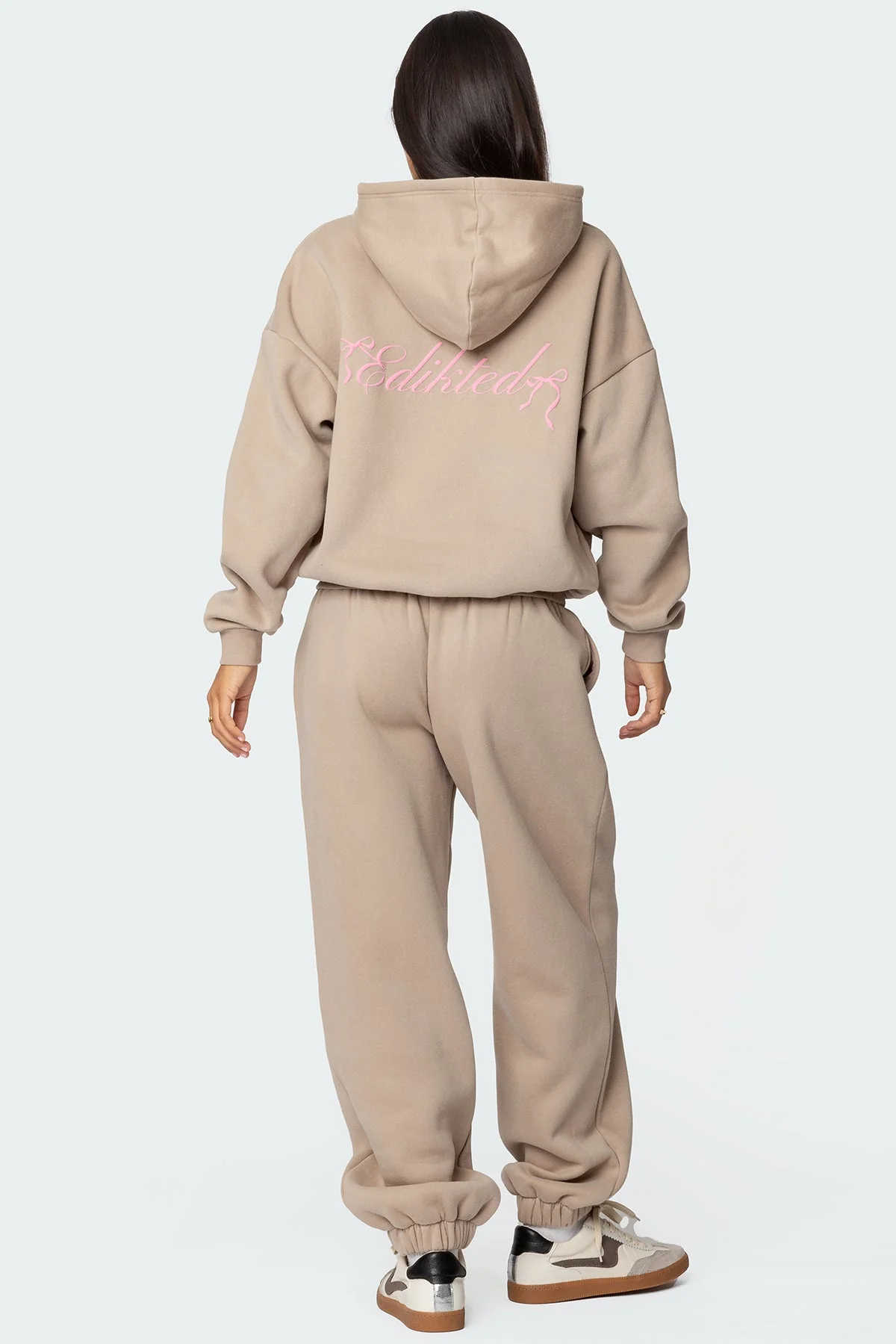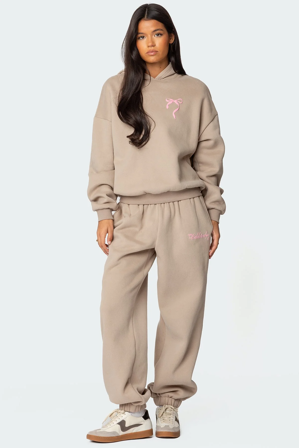 Stay cozy while making a fashion statement with our Beige Bow Detail Hoodie for women. Featuring a stylish graphic print and Edikted text, this polyester and cotton blend hoodie is part of a matching set for a complete look. Ideal for everyday wear, this long sleeve loungewear piece can be machine washed for easy care. Available in sizes XS to XL.