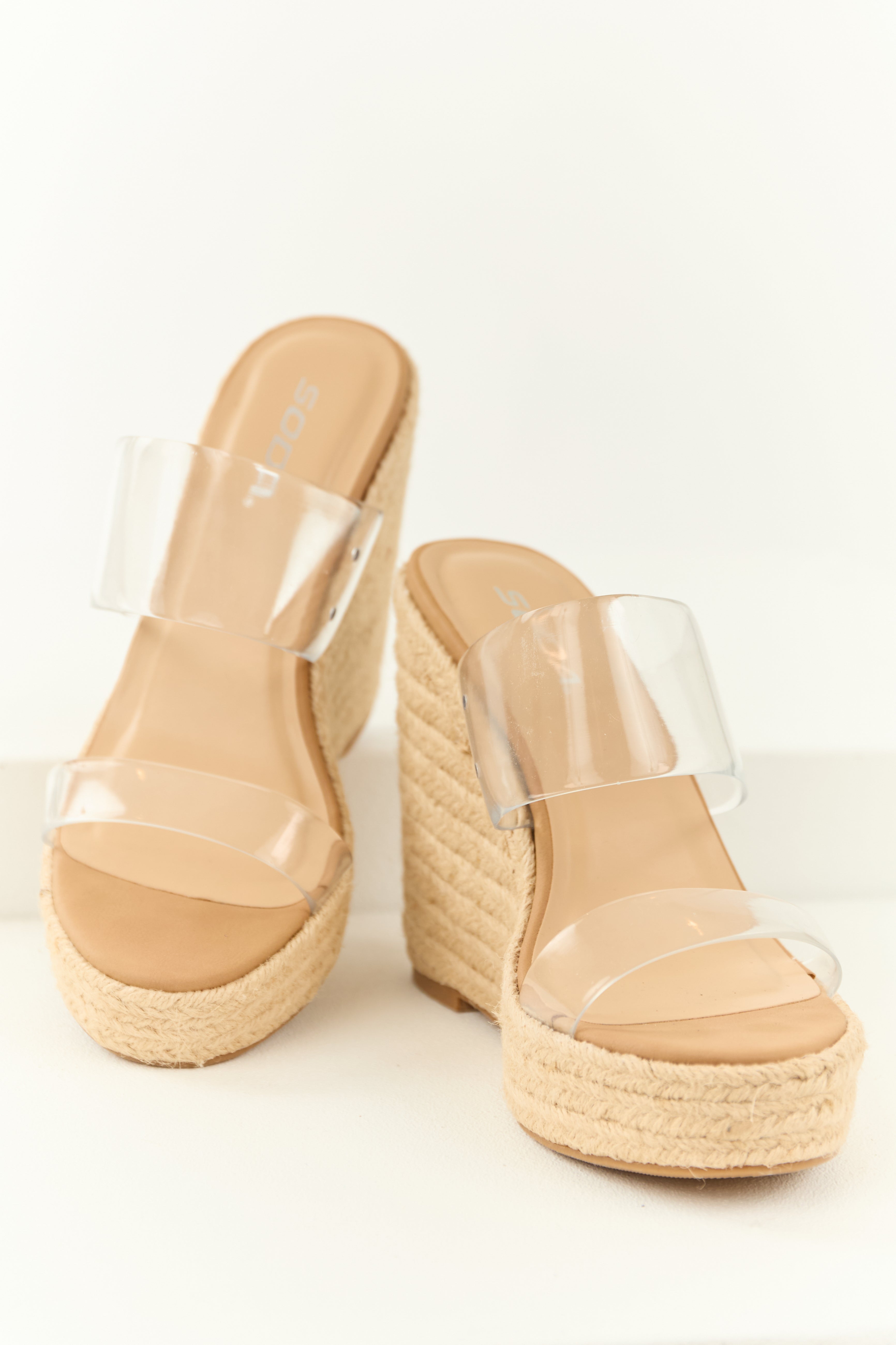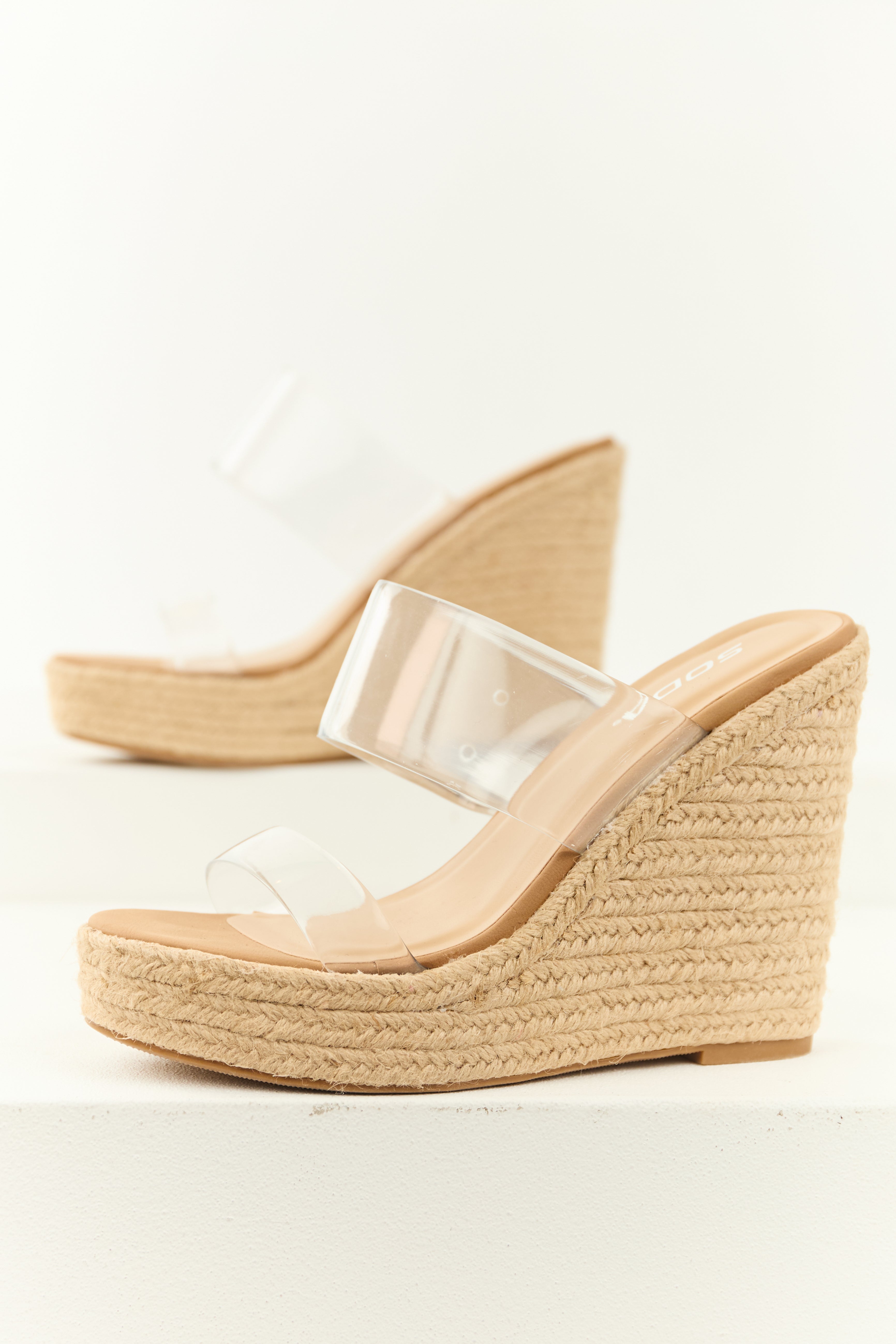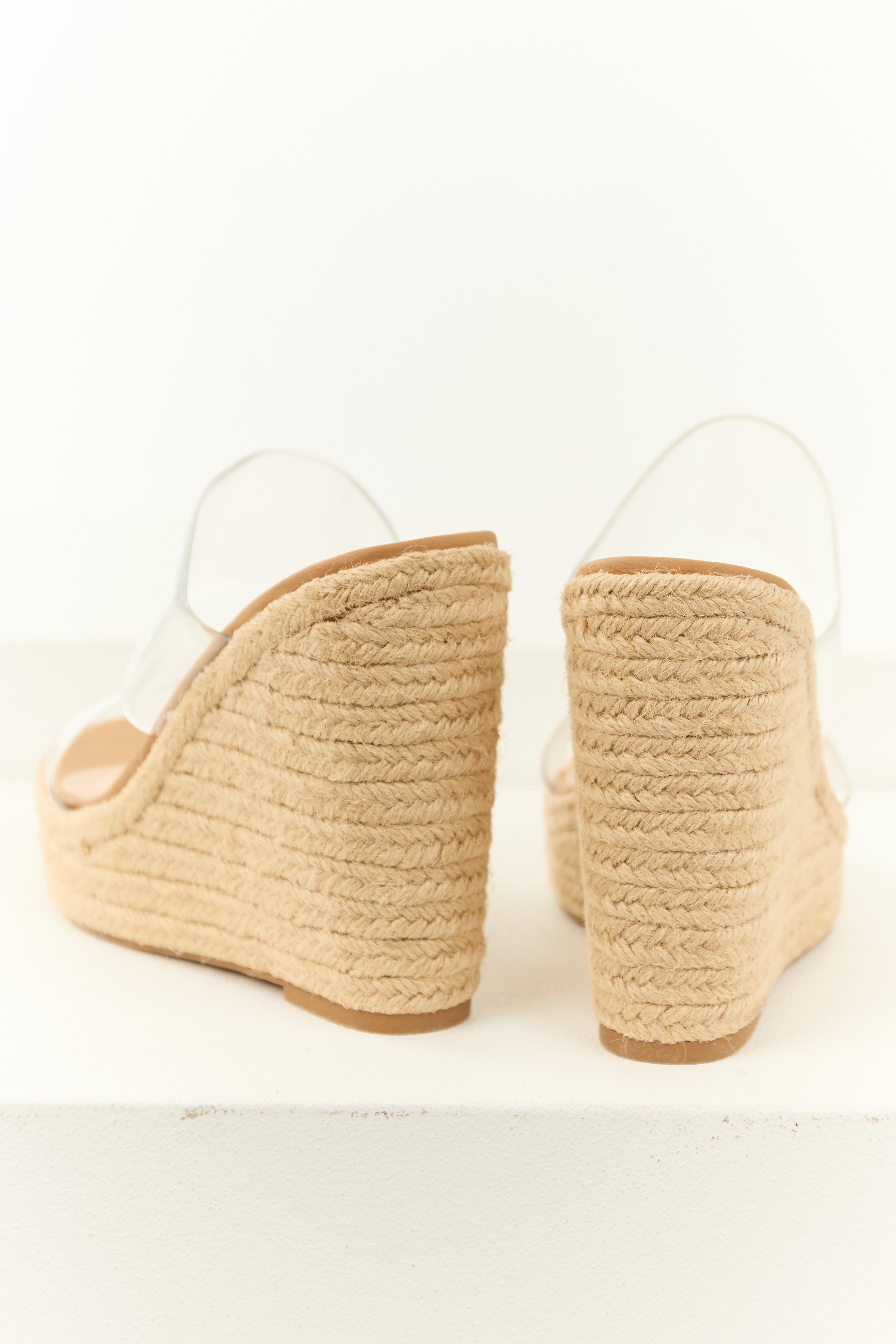 Step into coastal chic with these beige espadrille wedge heels featuring clear straps for a modern twist. The lucite straps provide a minimalist look while the platform sole ensures all-day comfort. These heels offer a blend of style and sophistication, perfect for elevating any outfit. Designed with a nude cushioned insole and a latte rubber sole for durability. The open rounded toe and towering 5-inch heel complement the 1.5-inch platform. Shaft measures 4 inches with a circumference of 9 inches. Imported.