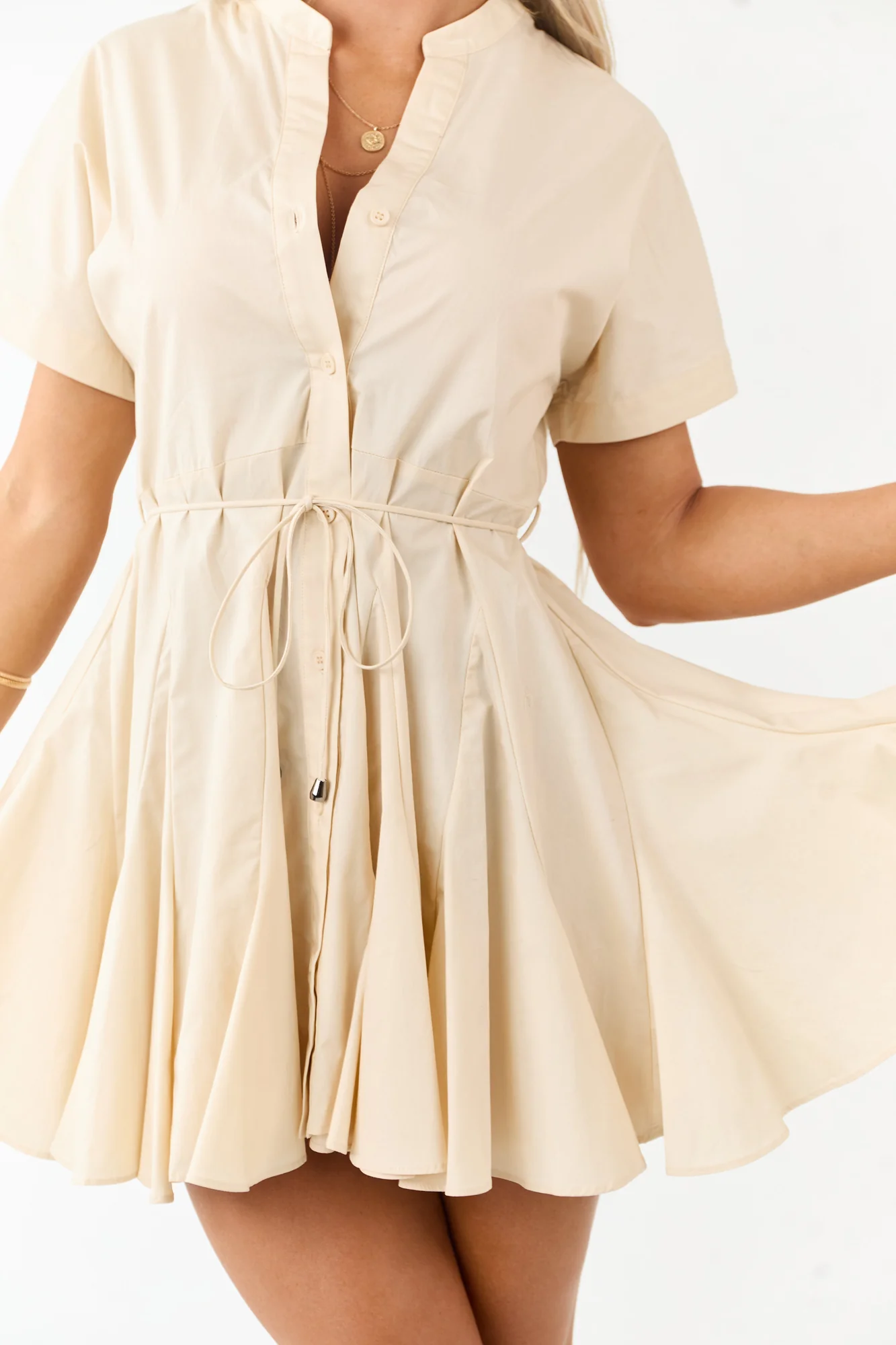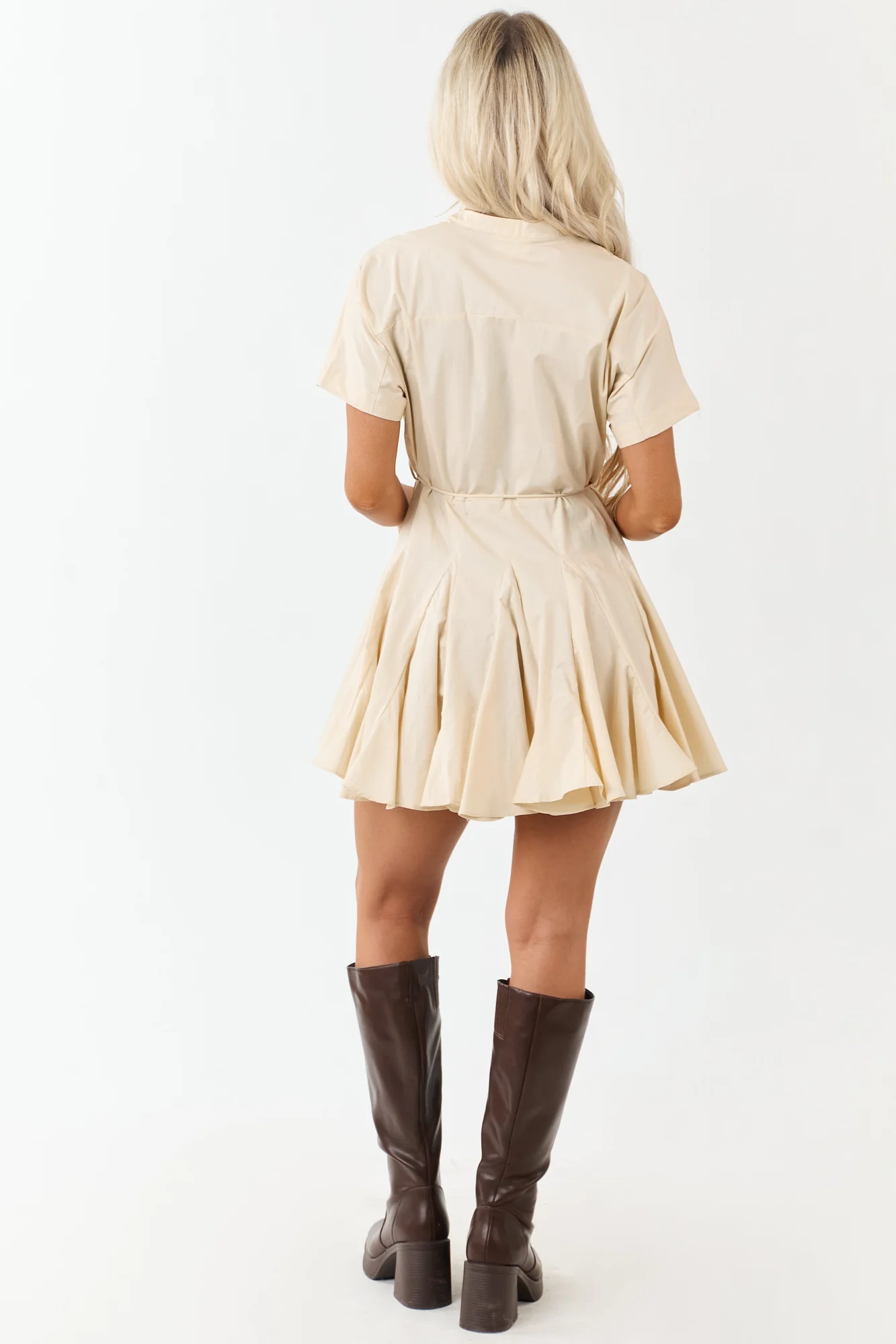 This beige cotton shirt dress features a waist-defining tie, pleated charm, and crisp cotton fabric for a stylish and versatile look. With a non-stretchy design, optional waist tie, and belted loops, this dress is perfect for various occasions. Dress measurements for size Small are Bust: 38″, Waist: 32″, Length: 34″. Unlined and made of 100% imported cotton. Ideal for sizes XS to XL. Model height 57″ wearing a size Small.