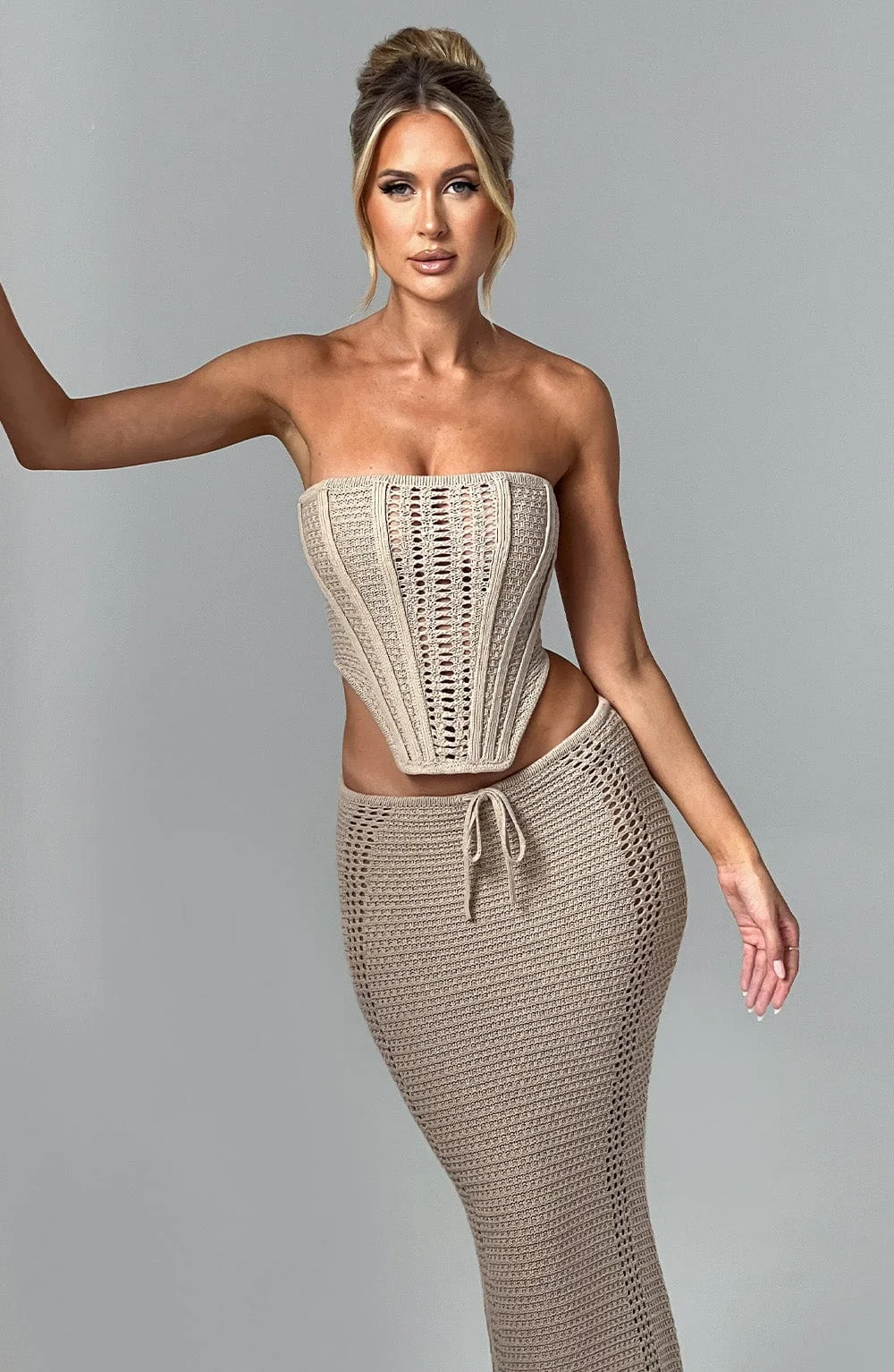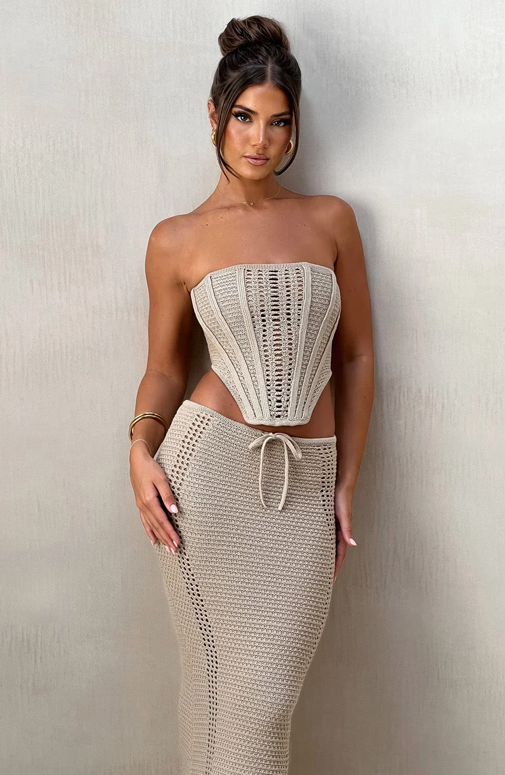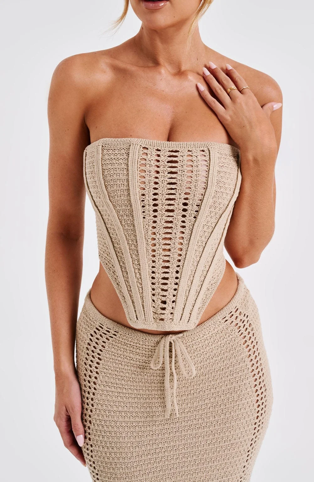 Discover the irresistible charm of the Beige Crochet Knit Corset Top from the Carly Collection. This strapless top features boning for a flattering fit, a lace-up back for added allure, and a square-shaped hem for a trendy look. Made of premium crochet knit, this top is perfect for warm days and nights. Pair it with the Chayenne Maxi Skirt for a flawless ensemble. Available in various sizes. Model shown wearing size XS.