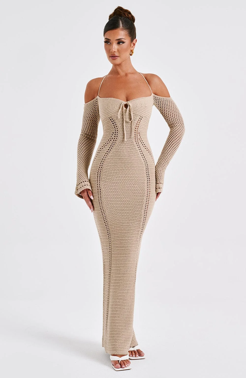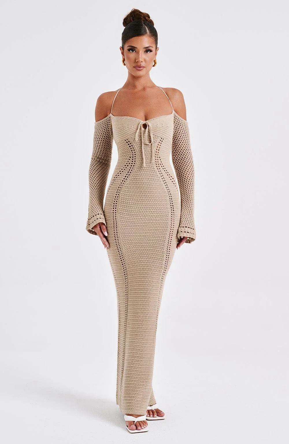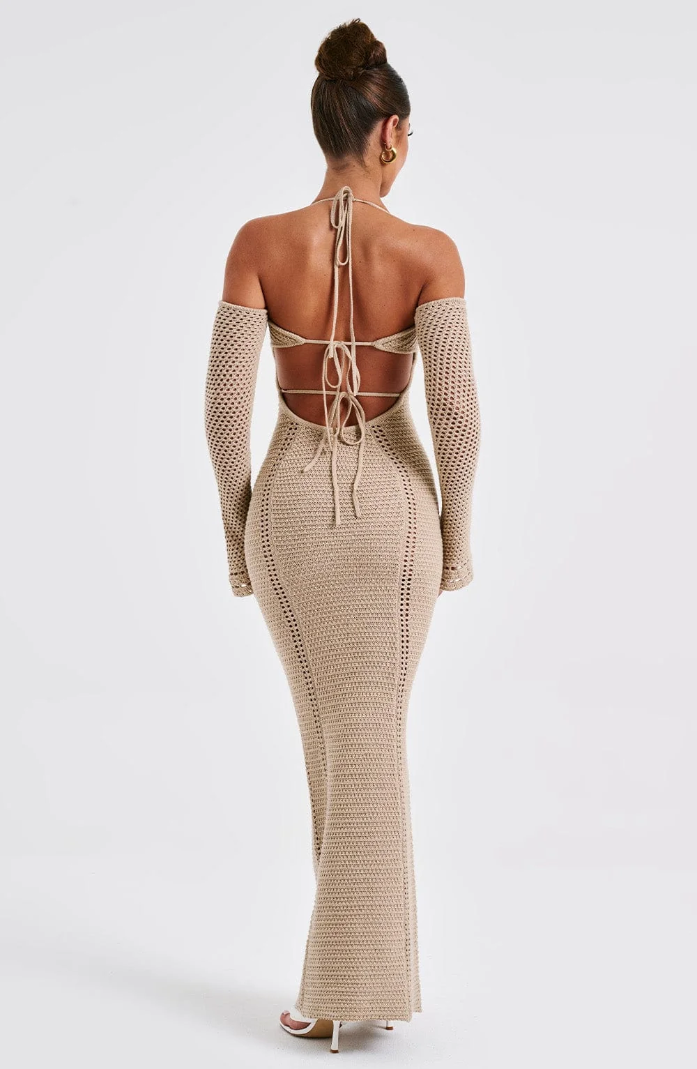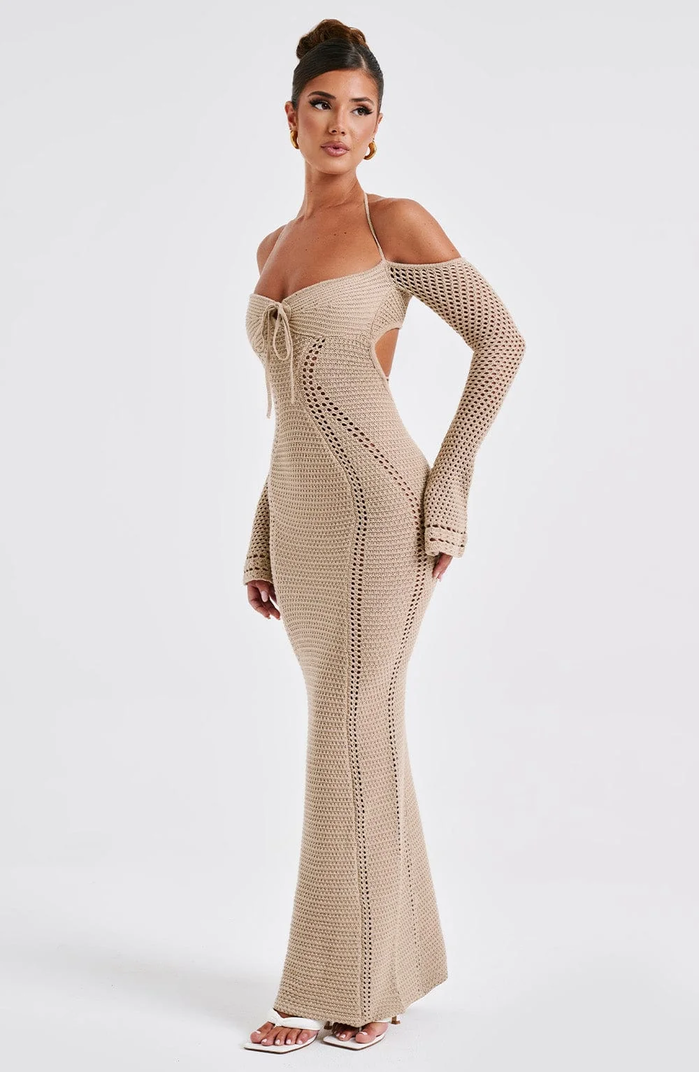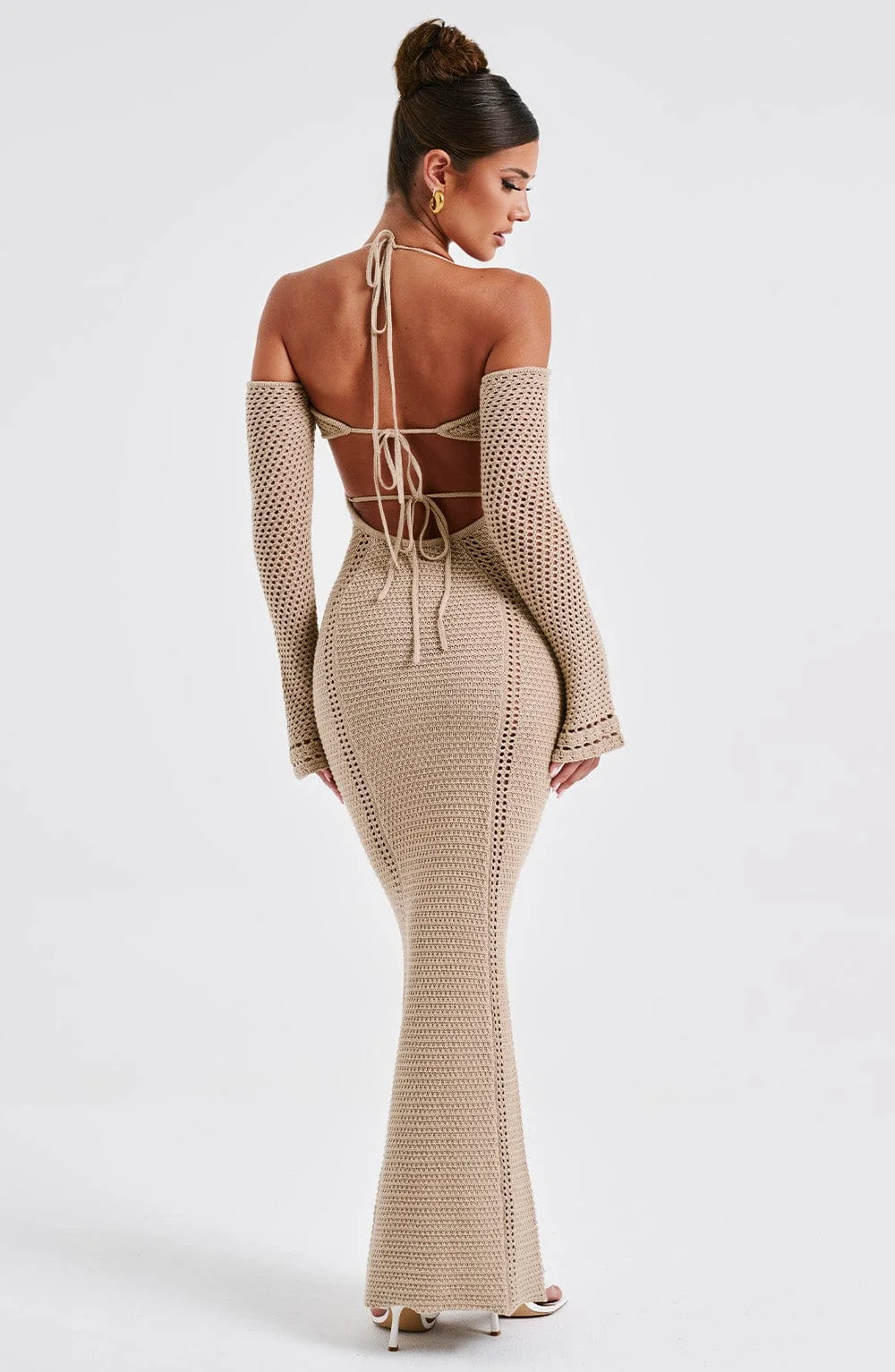 Elevate your style with the timeless elegance of our Beige Crochet Off-Shoulder Maxi Dress. Crafted from premium knit fabric with a hint of stretch, this dress accentuates your figure beautifully. Featuring a charming tie detail at the bust, long flared sleeves, and a flattering maxi length, it is perfect for any occasion. Pair with heeled mules for a sophisticated look. Ideal for Spring, Winter, holidays, and more. Available in sizes XS to XXL.