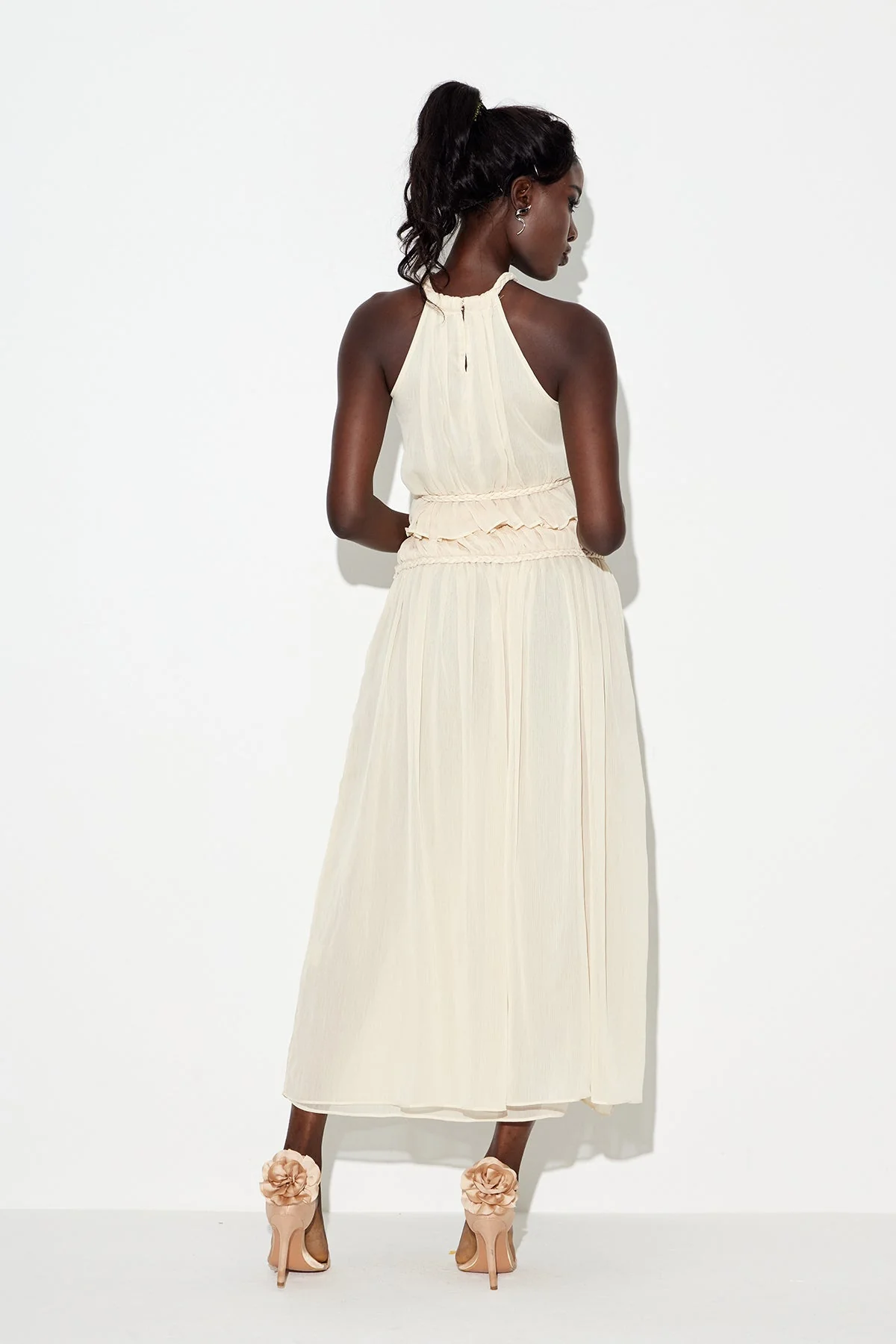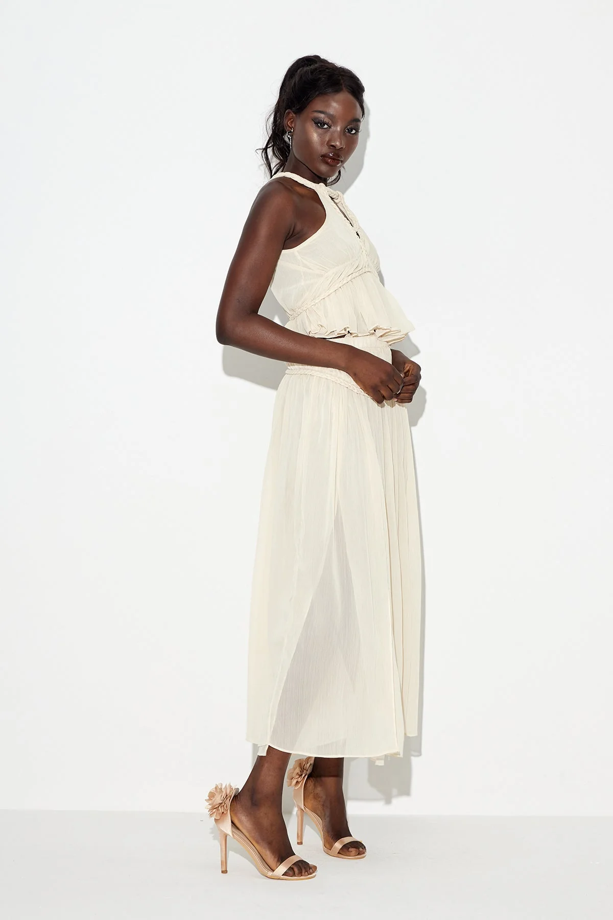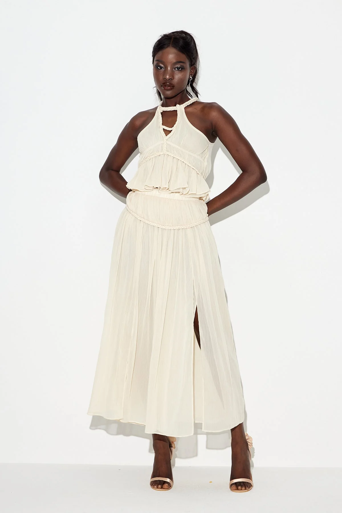 Indulge in modern elegance with the Beige Cutout Sleeveless Skirt Set. This sophisticated ensemble features a sleeveless top with strategic cutouts, accentuating your silhouette beautifully. Paired with a matching skirt, this set is suitable for various occasions, blending chic style with a touch of romance. Whether its a formal event or a casual outing, this set exudes grace and allure. Crafted for a perfect fit, it showcases exquisite craftsmanship and contemporary flair. Disclaimer: Colors may vary slightly due to photographic lighting sources.