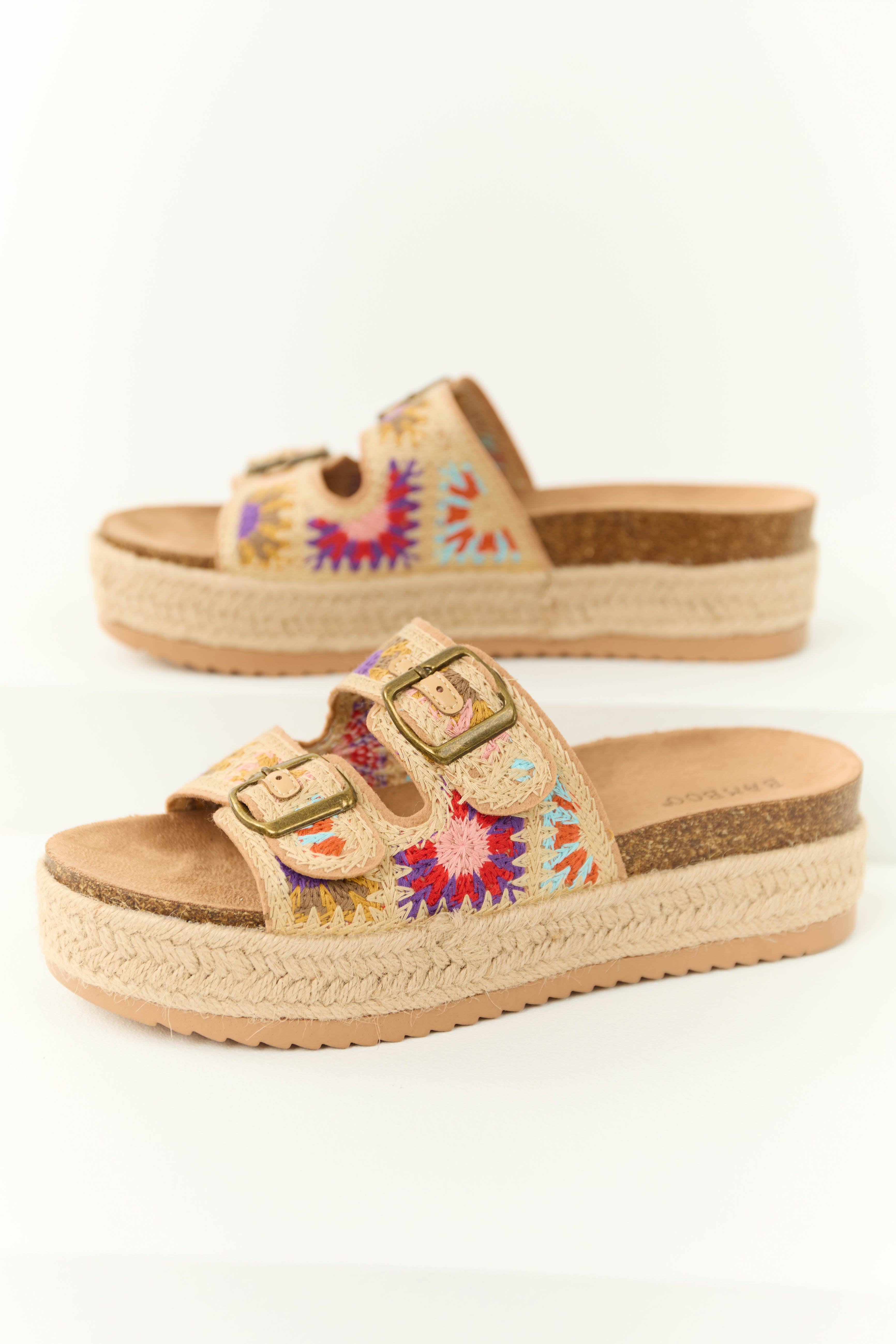 Step up your style with these Beige Embroidered Platform Sandals featuring Gold Double Buckle Straps. The espadrille platform design and suede footbed ensure comfort while the floral embroidery in shades of Tea Rose, Scarlet, Sunset, Aqua, Indigo, Straw, and Ash adds a fashionable touch. Circle the circumference of your foot with 9.25 inches and enjoy a 2-inch platform height. These slip-on sandals are perfect for casual daytime wear during the summer season. Product measurements based on size 8.
