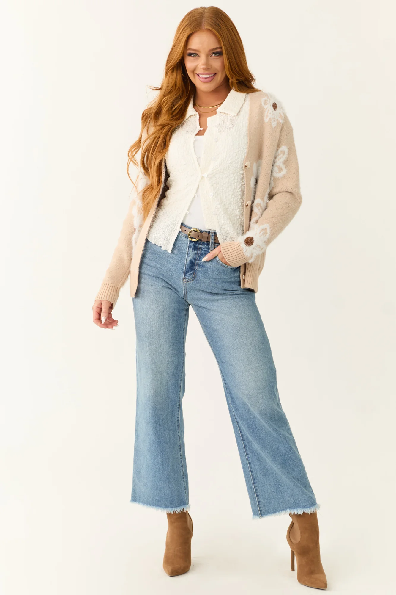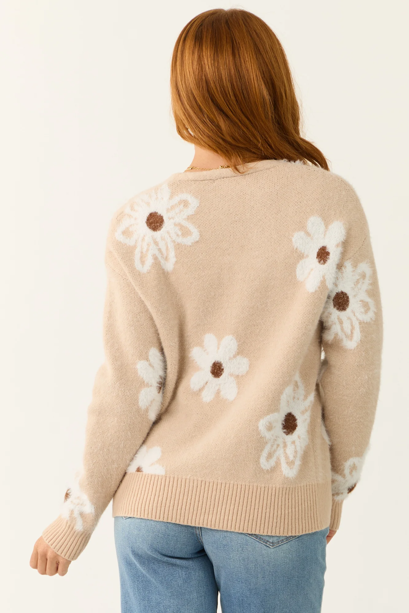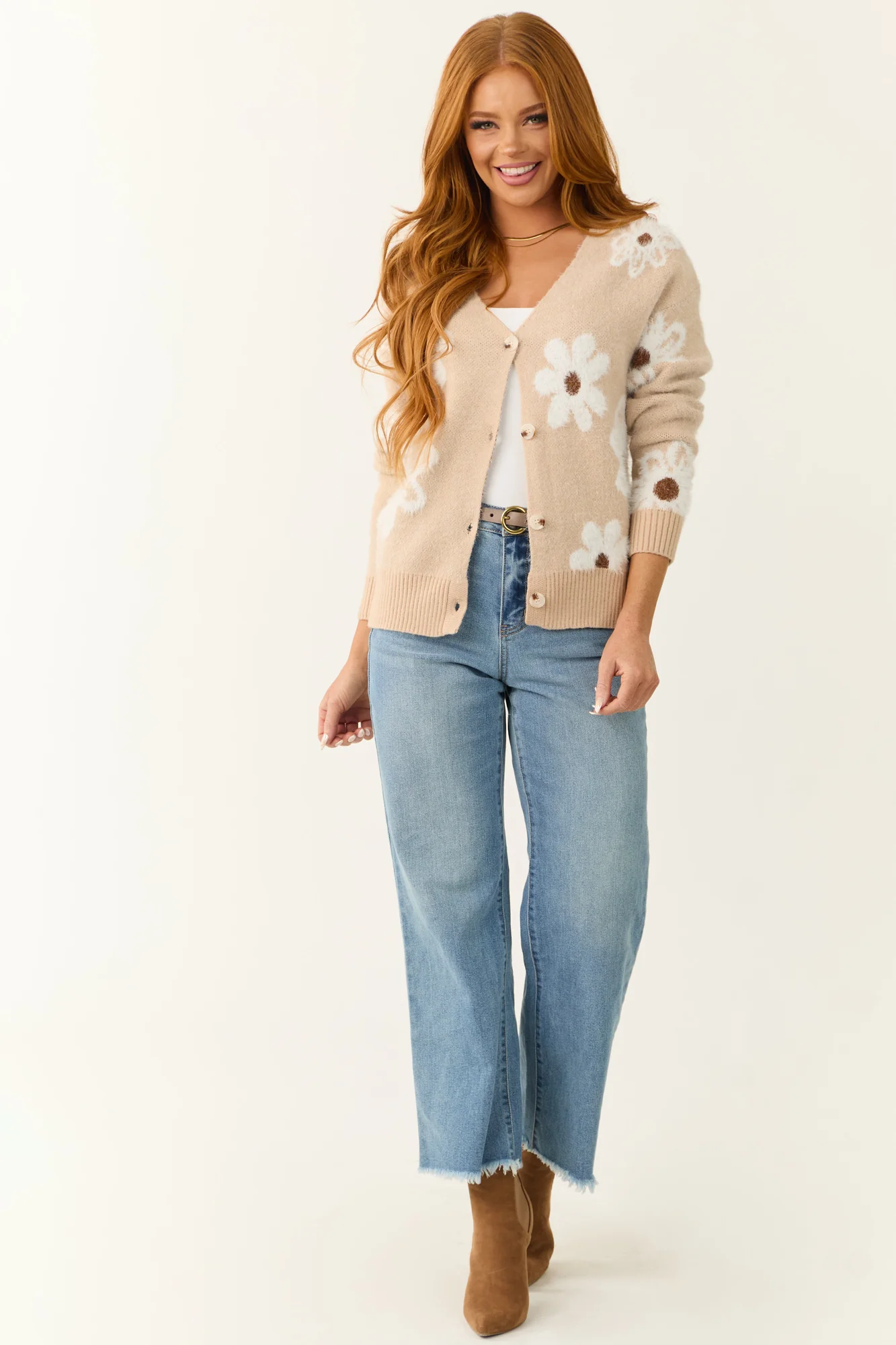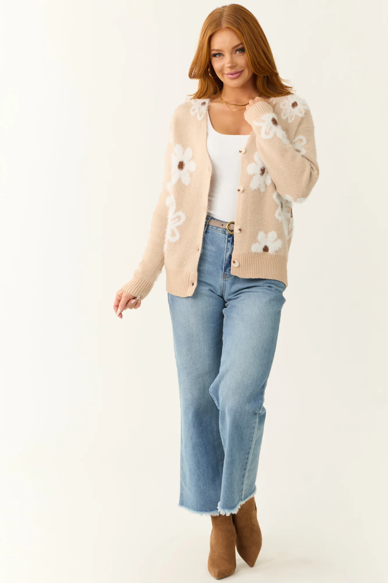 Stay cozy and stylish with our Beige Floral Pattern Soft Knit Cardigan Sweater! Crafted from stretchy knit fabric, this sweater features a beautiful floral pattern in white and sepia tones. It boasts a button-up front, drop shoulders, long sleeves, ribbed hem and cuffs, and a flattering V neckline. Perfect for any occasion, this unlined cardigan is made from 85% acrylic and 15% polyester for a soft and comfortable feel. Available in sizes S, M, L, and XL. Note: Variations in the print and design are normal due to the cutting and sewing process. Model is wearing a size Small. Model’s measurements: Height 55″, Bust 31″, Waist 24″