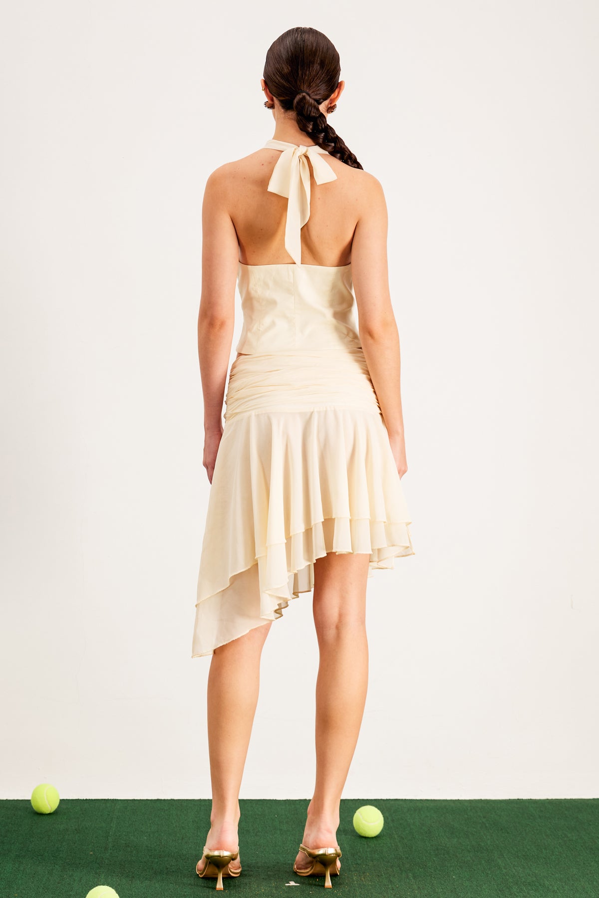 Indulge in elegance with the Beige Halter Neck Skirt Set featuring ruched details. This stylish ensemble includes a halter neck top that accentuates the shoulders and a matching skirt. Versatile for any occasion, this set is a must-have addition to your wardrobe. Made of 50% Polyester and 50% Cotton with a slight stretch for comfort. To maintain, gently machine wash. Please note, color variations may occur due to lighting during photography.