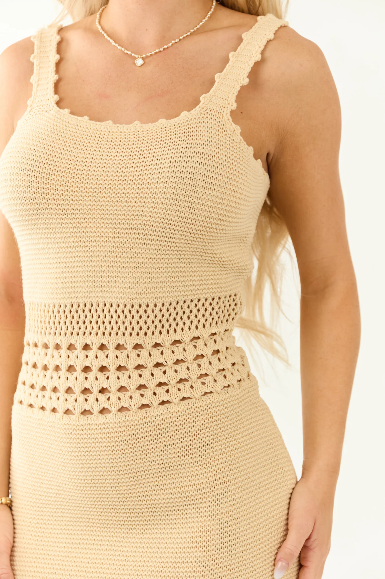 This beige knit bodycon midi dress is perfect for date nights and rooftop drinks. Made of soft acrylic, it features open cutout panels, stretchy fabric, and a true-to-size bodycon fit. Glamorous yet comfortable, it is ideal for various occasions. Carefully crafted with a bust of 33″, waist of 26″, and length of 41″ for a size small. Feel confident and stylish in this lovely garment x GeeGee. Model is 57″, Bust 34″, Waist 26″, wearing size Small.