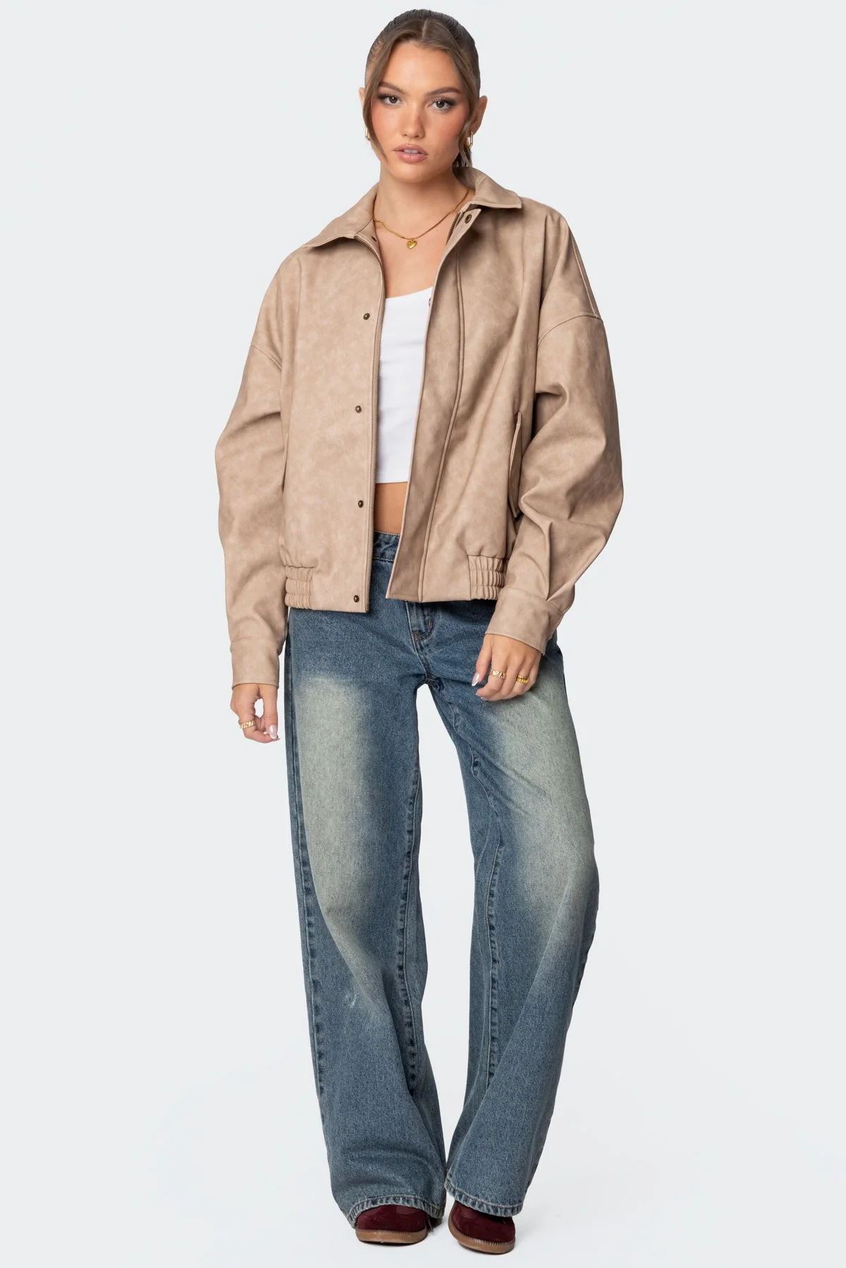 Upgrade your wardrobe with this stylish Beige Oversized Faux Leather Jacket for women. Crafted from Polyurethane and Polyester, this elegant piece features an oversized fit for a trendy look. Perfect for various occasions, it offers comfort and style effortlessly. Embrace the fashion-forward you with this must-have jacket. Model wears size S. Model height is 58. Item care: Machine wash at maximum 30ºC, do not bleach, do not tumble dry, do not iron, do not dry clean.