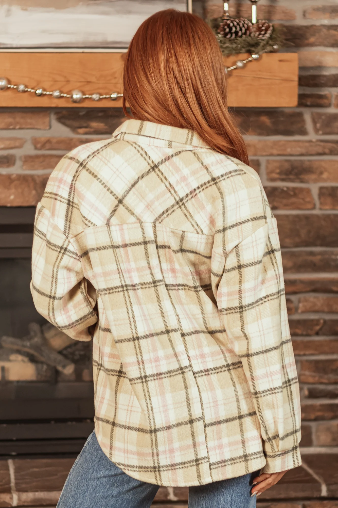 This fashionable Beige Plaid Button-Up Collared Shacket is a versatile outerwear piece that exudes sophistication and style. Crafted from non-stretchy fuzzy woven fabric in shades of Beige, Cream, Black, and Cherry Blossom, it features two chest pockets with button closure, long sleeves with banded cuffs, and a drop-shoulder design. Perfect for casual daytime wear during Fall and Winter. Hand wash cold for easy care. Please note that each piece may vary slightly in print due to the cutting and sewing process. Model is wearing a size Small. Available in sizes S, M, and L.