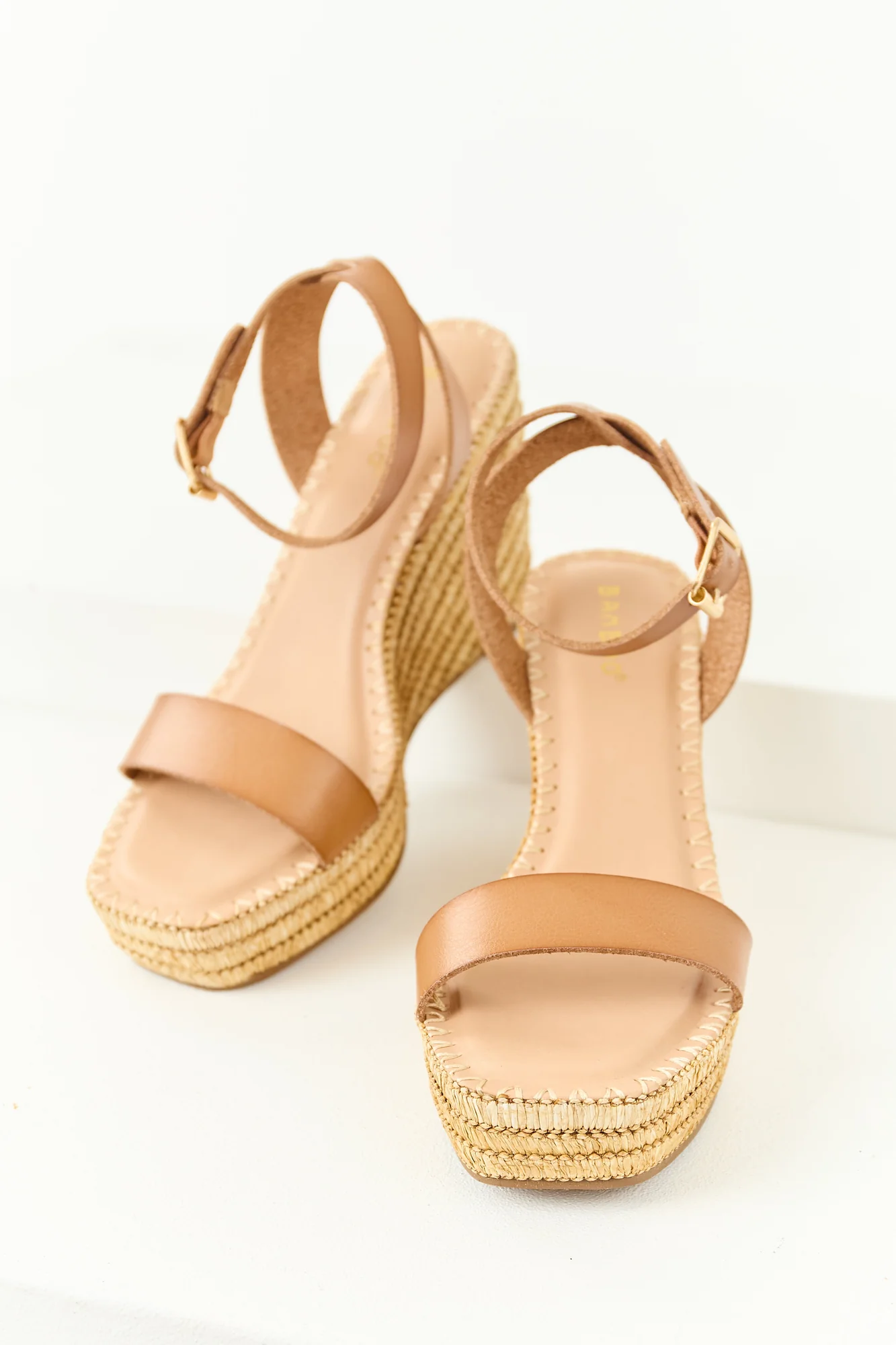 Experience the perfect blend of style and comfort with these beige raffia platform wedges featuring a copper strap accent. Crafted with woven raffia wedge heels and faux leather straps, these wedges offer a square open toe, an adjustable buckle ankle strap, and a slightly cushioned insole for all-day wear. Elevate your look with a 4.25-inch heel, 1-inch platform, and a versatile design that complements any outfit. Imported.